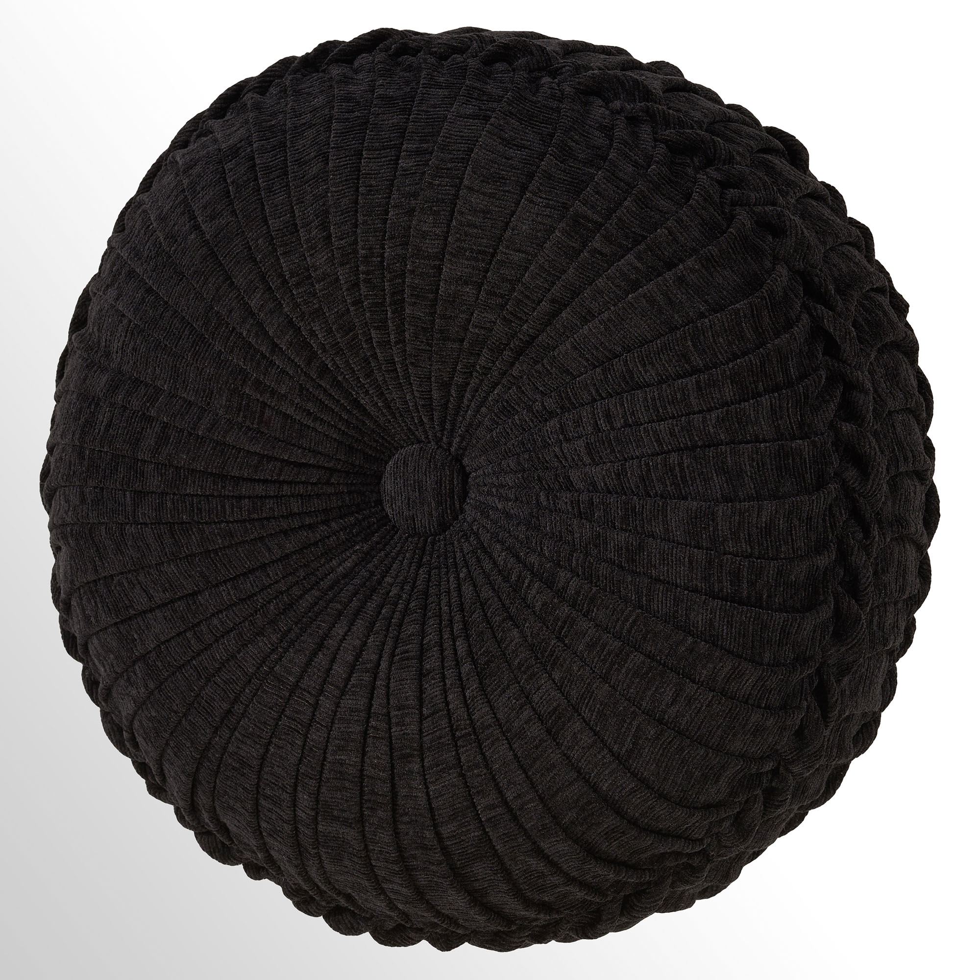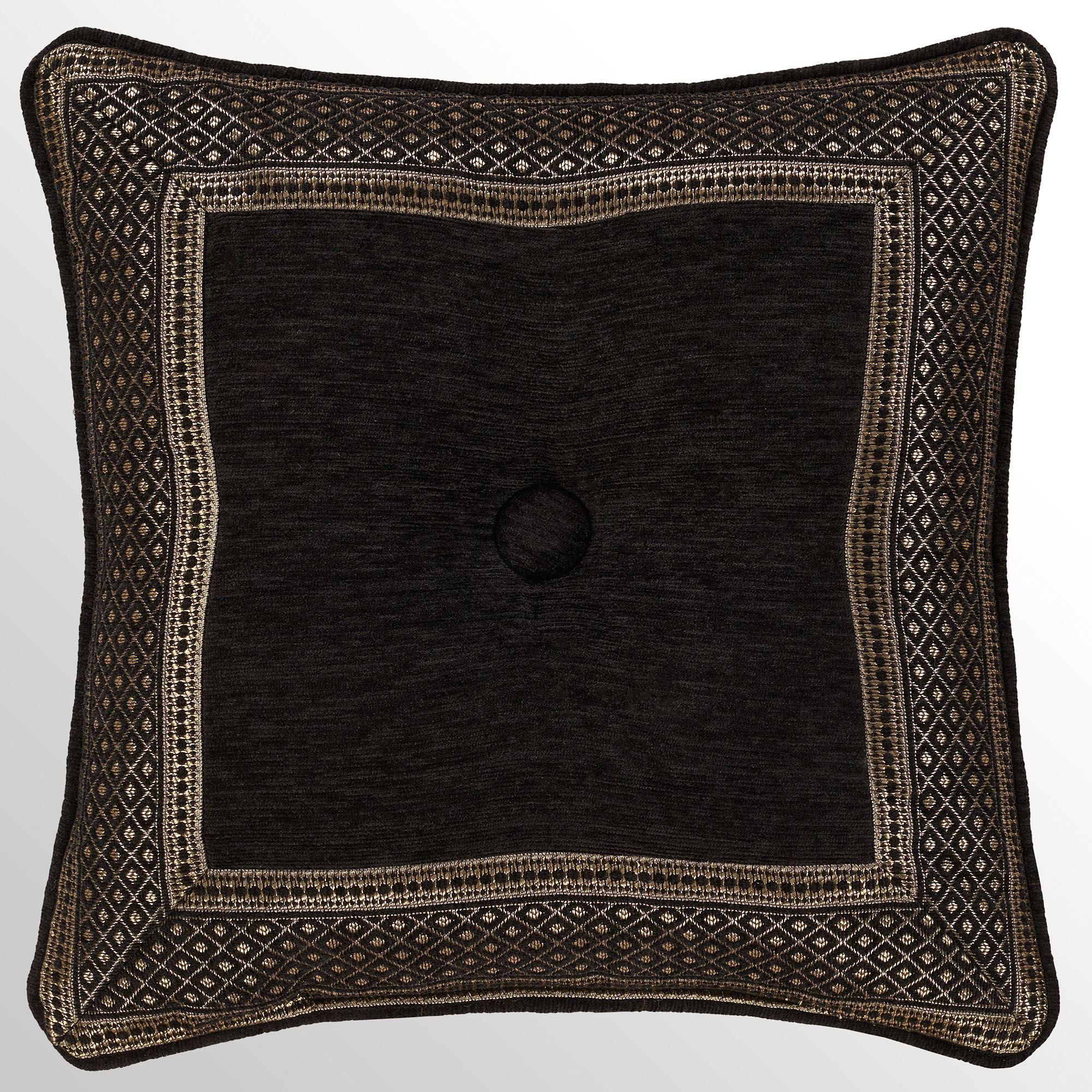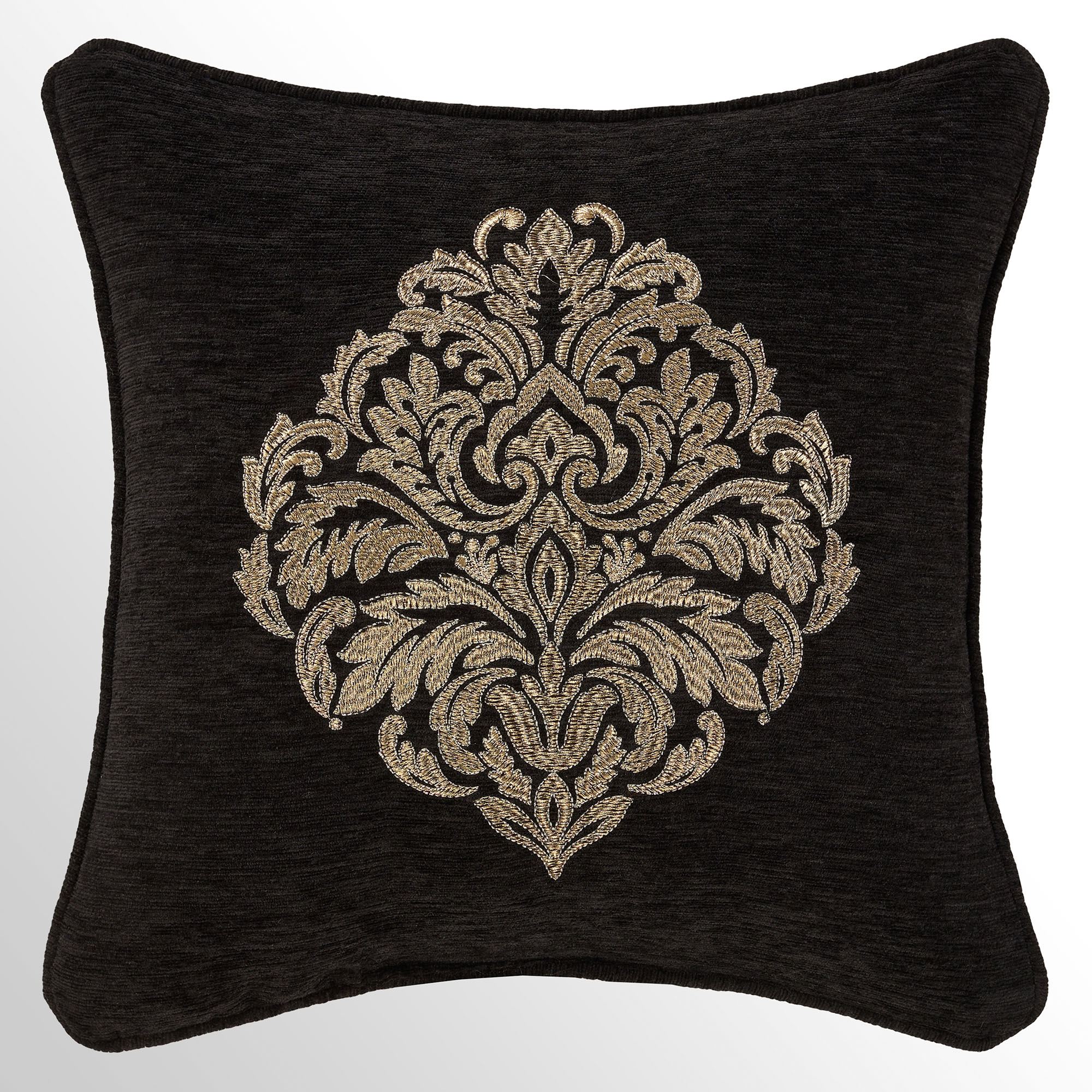Black chenille Pillows: Spot clean. The Tufted Square has mitred corners, stripe and diamond motifs, a tufted button in the center, and piped ends. The piped Embroidered Square has gold damask embroidery. The Piped Square has mitred corners and damask, stripe, and diamond designs; reverses to diamond, stripe, and solid black motifs. The Tailored Rectangle has gold diamond, stripe, and fleur designs. The piped Jumbo Rectangle has gold diamond, stripe, and fleur designs and a 2.5" side gusset; reverses to diamond, stripe, and solid black motifs. The reversible, handmade Round has pleats, a 3" side gusset, and a button tuft in the center.