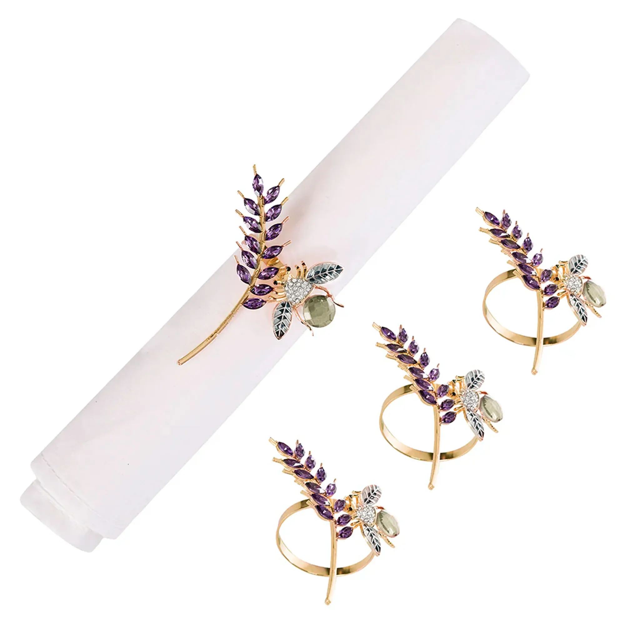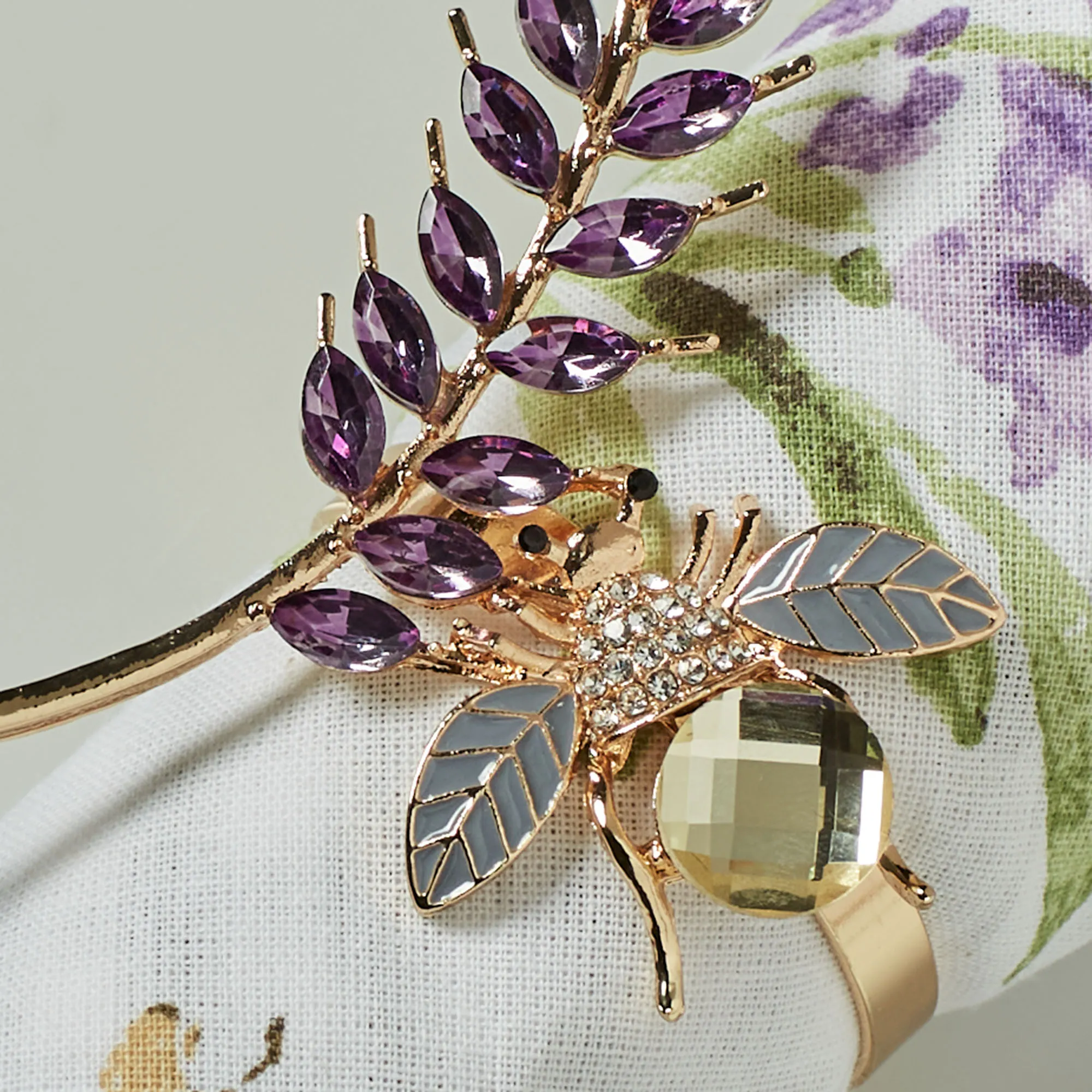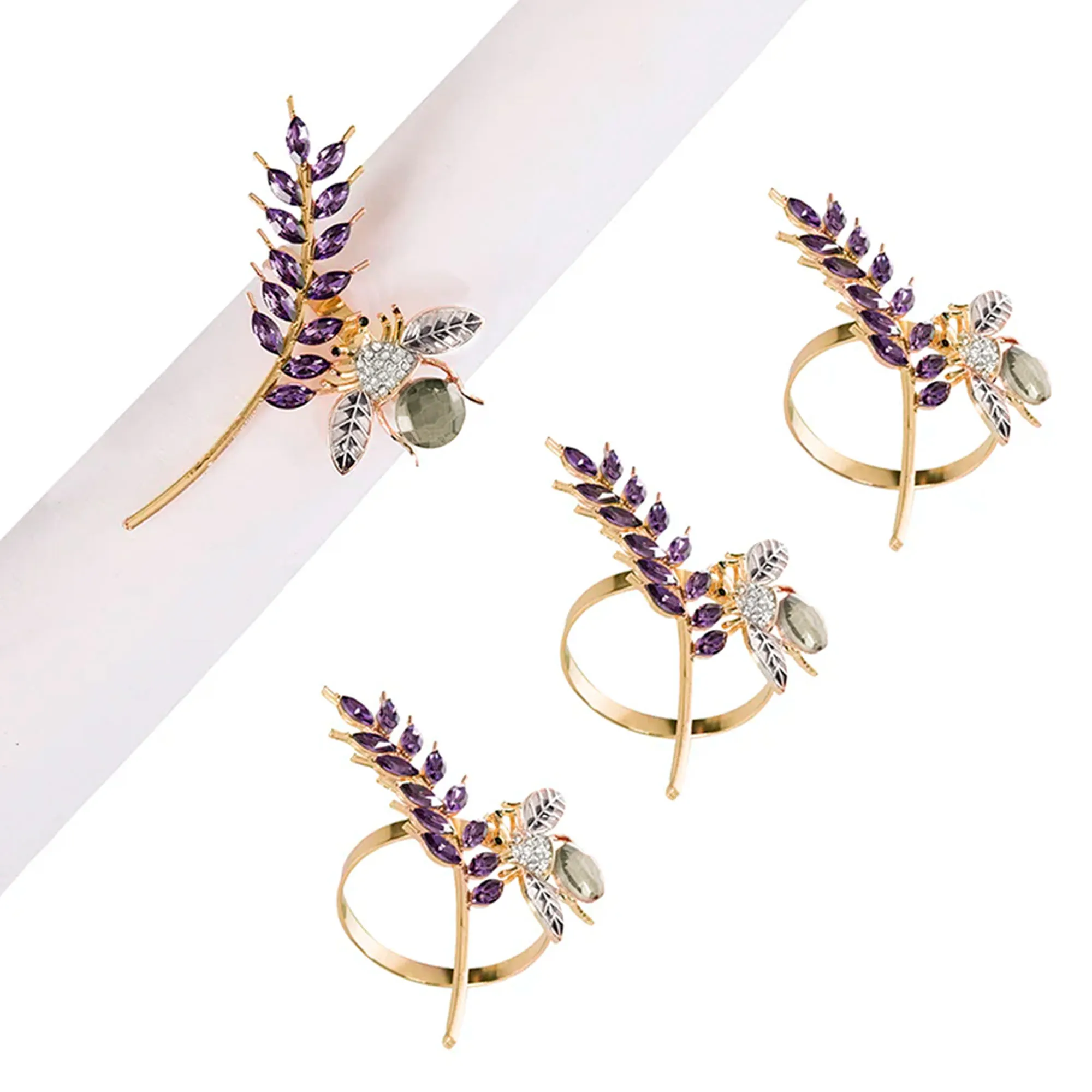 The Lavender and Bee Napkin Ring Set is made of metal with faux jewel accents.