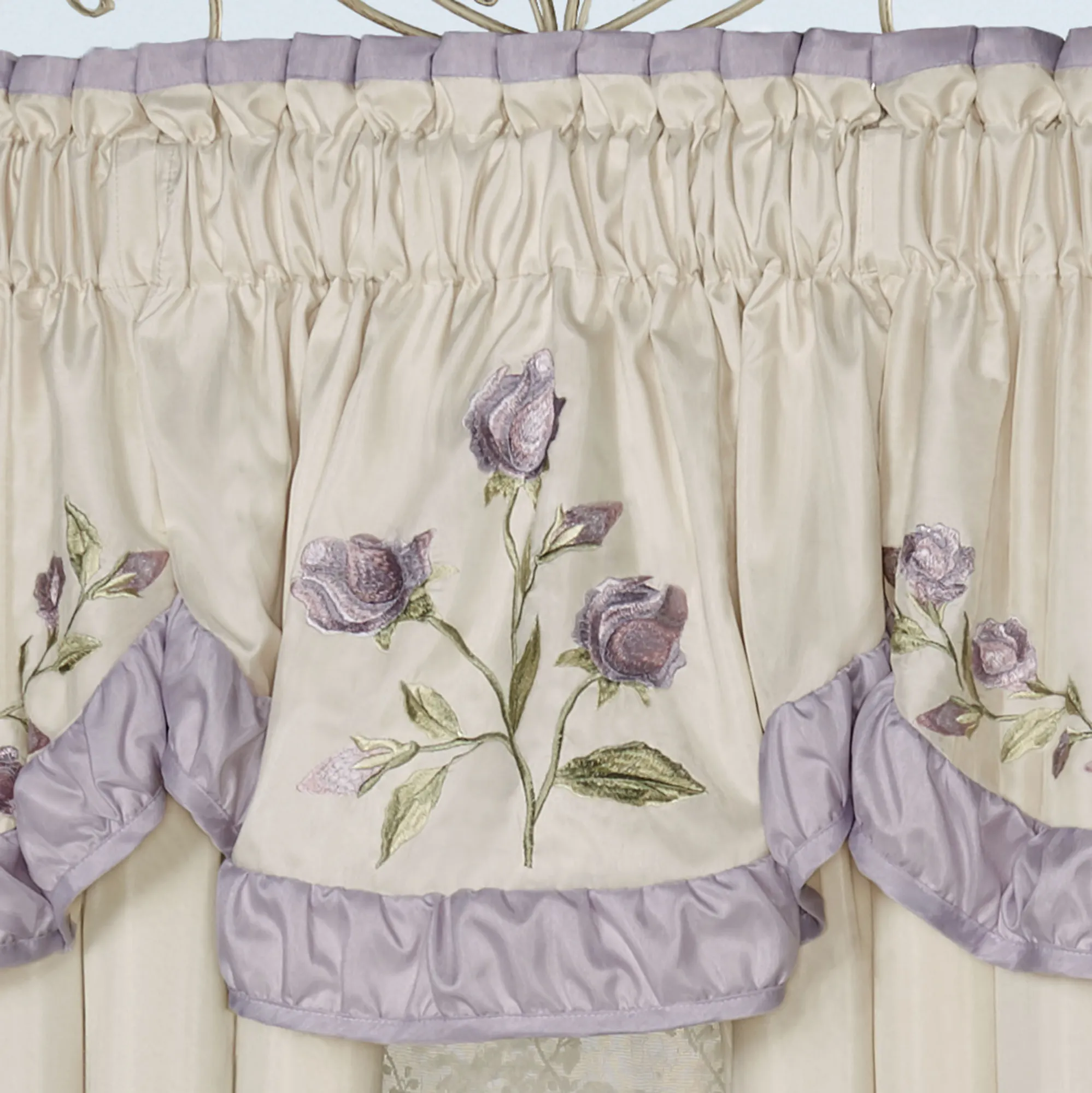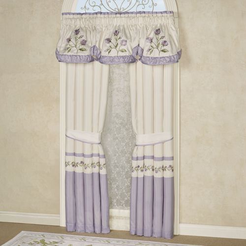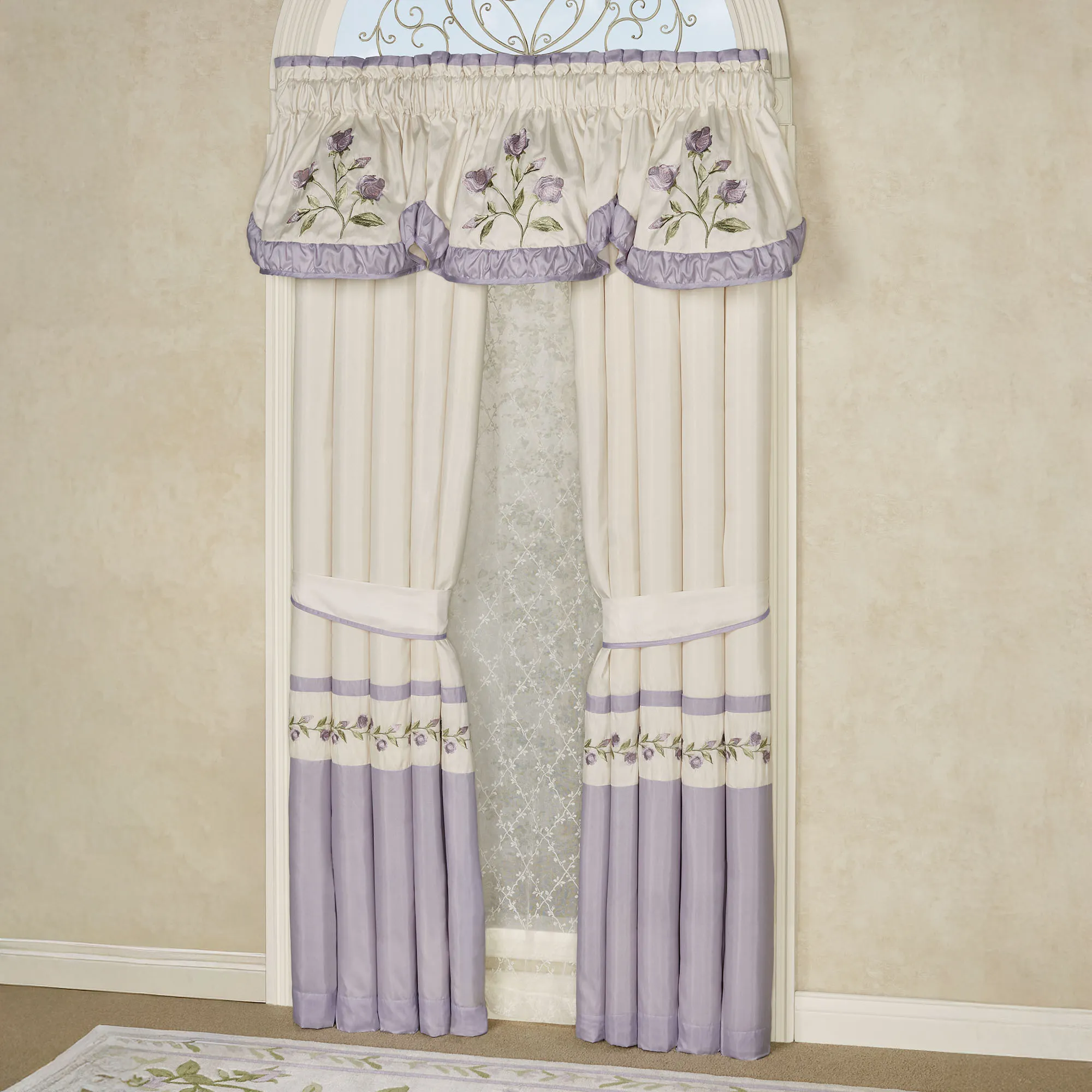 The sweet Lavender Rose Floral Window Treatment will flourish in your room with blossoms. Unfurling soft lavender hues, embroidered vining roses charm the smooth pearl and lavender polyester faux silk ensemble with a captivating allure. Window treatment has 3.25" rod pockets. Specify Insert Valance or Curtain Pair. Lined Insert Valance is pearl with roses and a shirred lavender edge. Lined Curtains have a pearl top and a lavender bottom pieced with a pearl band of roses; tiebacks are included. Machine washable. Imported. The curtain pair width is the total width of two panels together.