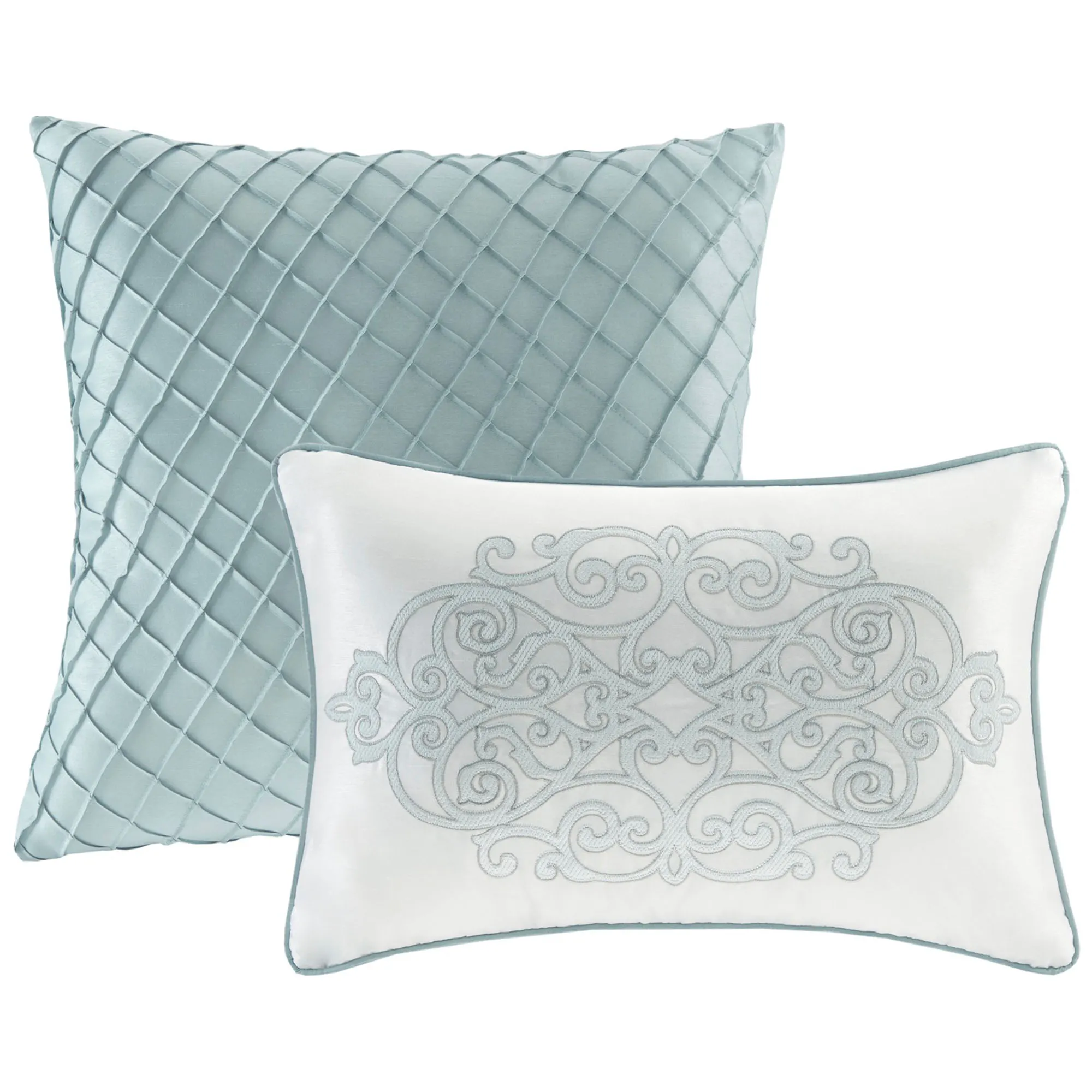 Reversible square pillow is glacier with a pintucked design and tailored edges. Piped rectangle pillow is white with coordinating scroll embroidery.