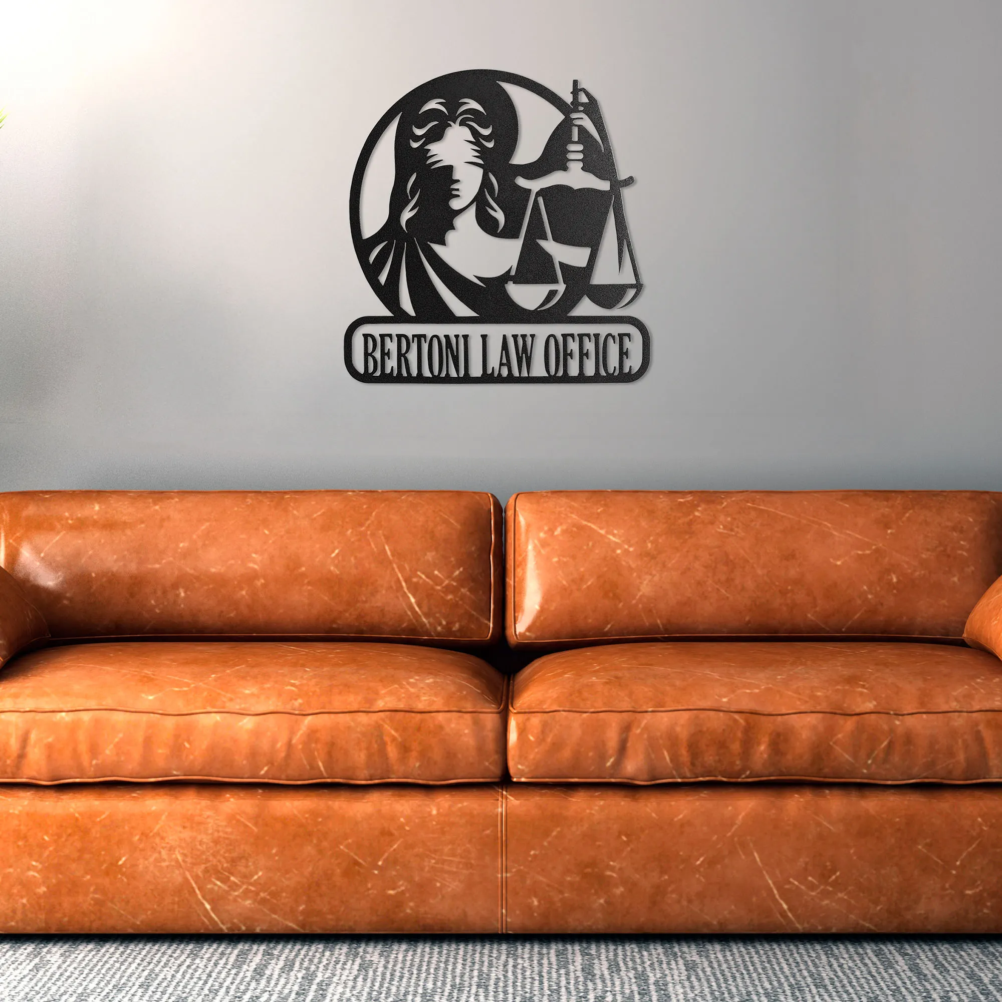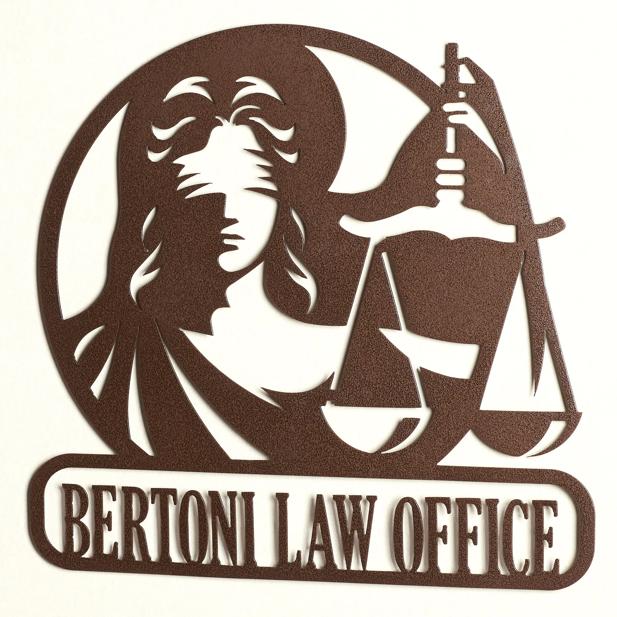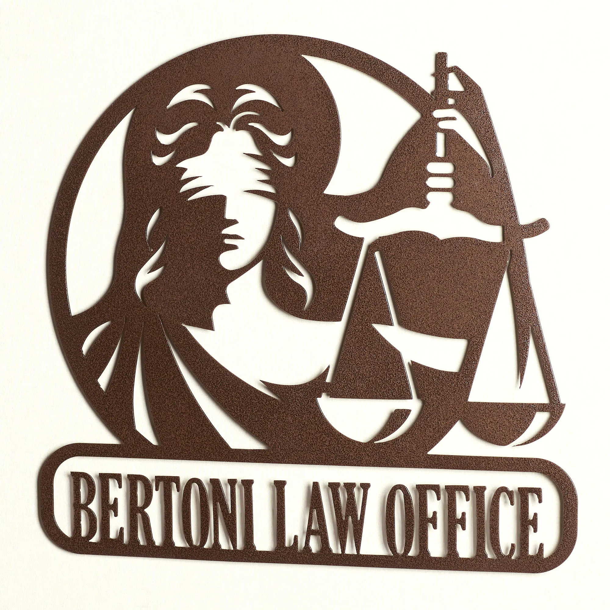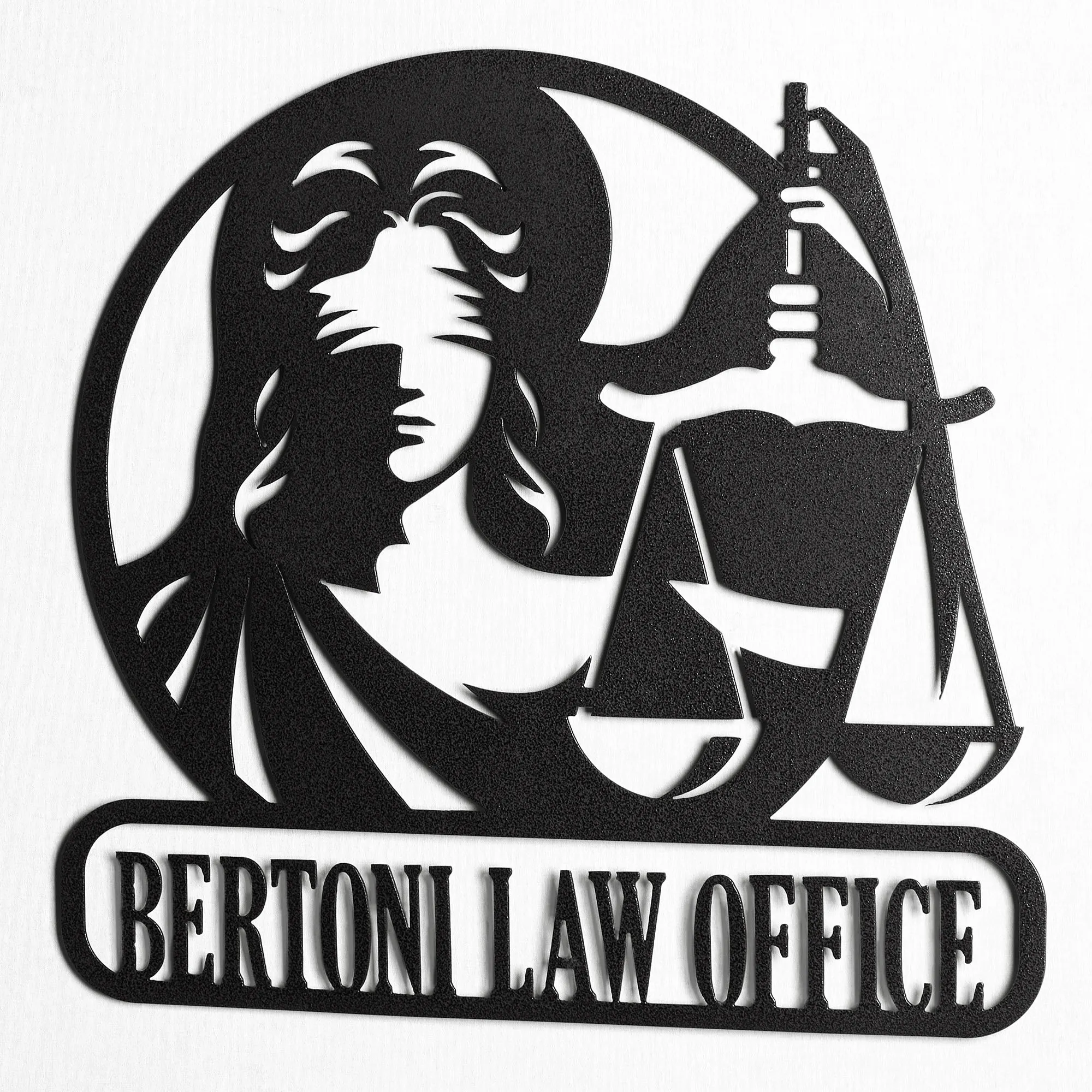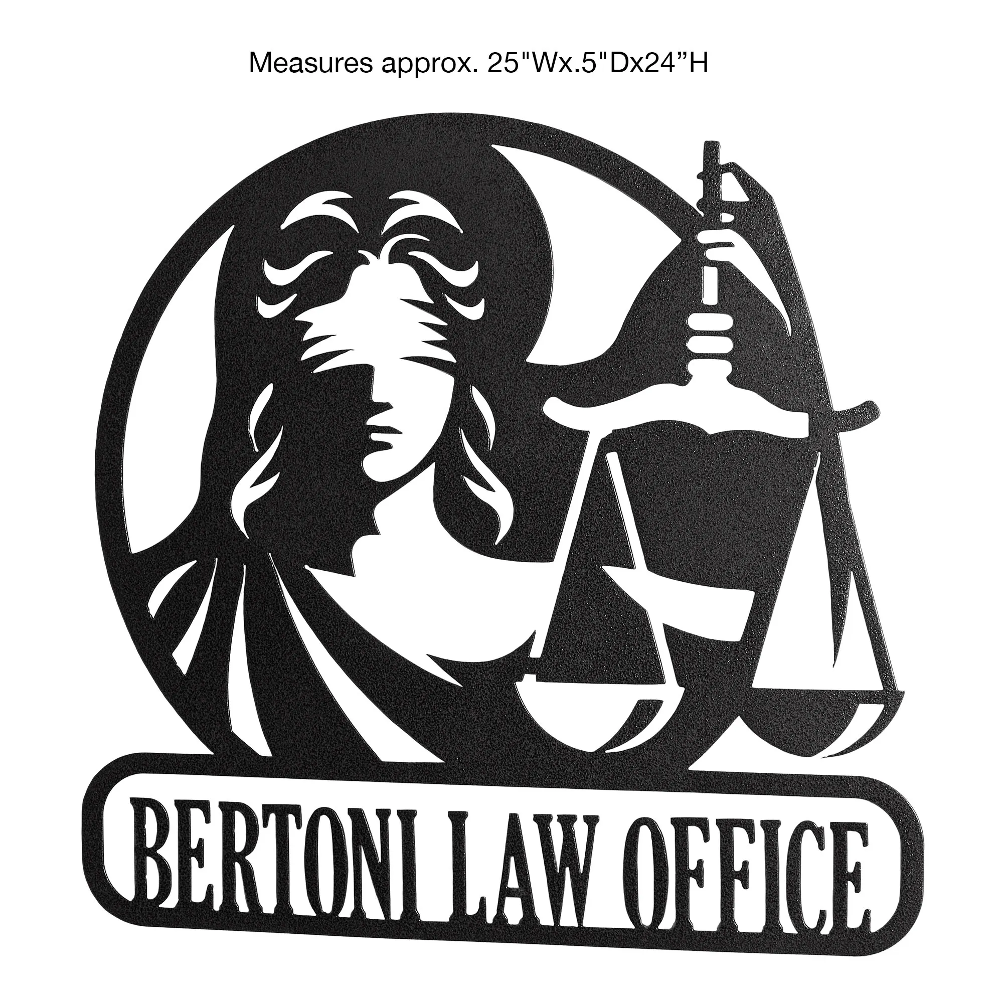 Proudly proclaim professional achievements with the Lawyer Personalized Wall Art Sign. In an openwork style, the round design features the blindfolded Lady of Justice, based upon the goddess Themis, holding the Scales of Justice aloft. The bottom rectangular plaque can be personalized with your law office or esquire information, up to 20 characters including spaces (commas and periods are not included in the character count). Letters are uppercase with the exception of names with a prefix. In those cases, the prefix will be uppercase and lowercase, like MacDONALD. Designed by JasonW Studios(R), the wall sign is finely handcrafted in the USA from precision-cut, 14-gauge steel and finished in a UV-, weather-, and tarnish-resistant powder coat fit for outdoor year-round use. Perfect for celebrating passing the bar exam, commemorating winning a first attorney case, or adorning the wall in a personal office, the wall sculpture measures approx. 25"Wx.5"Dx24"H.