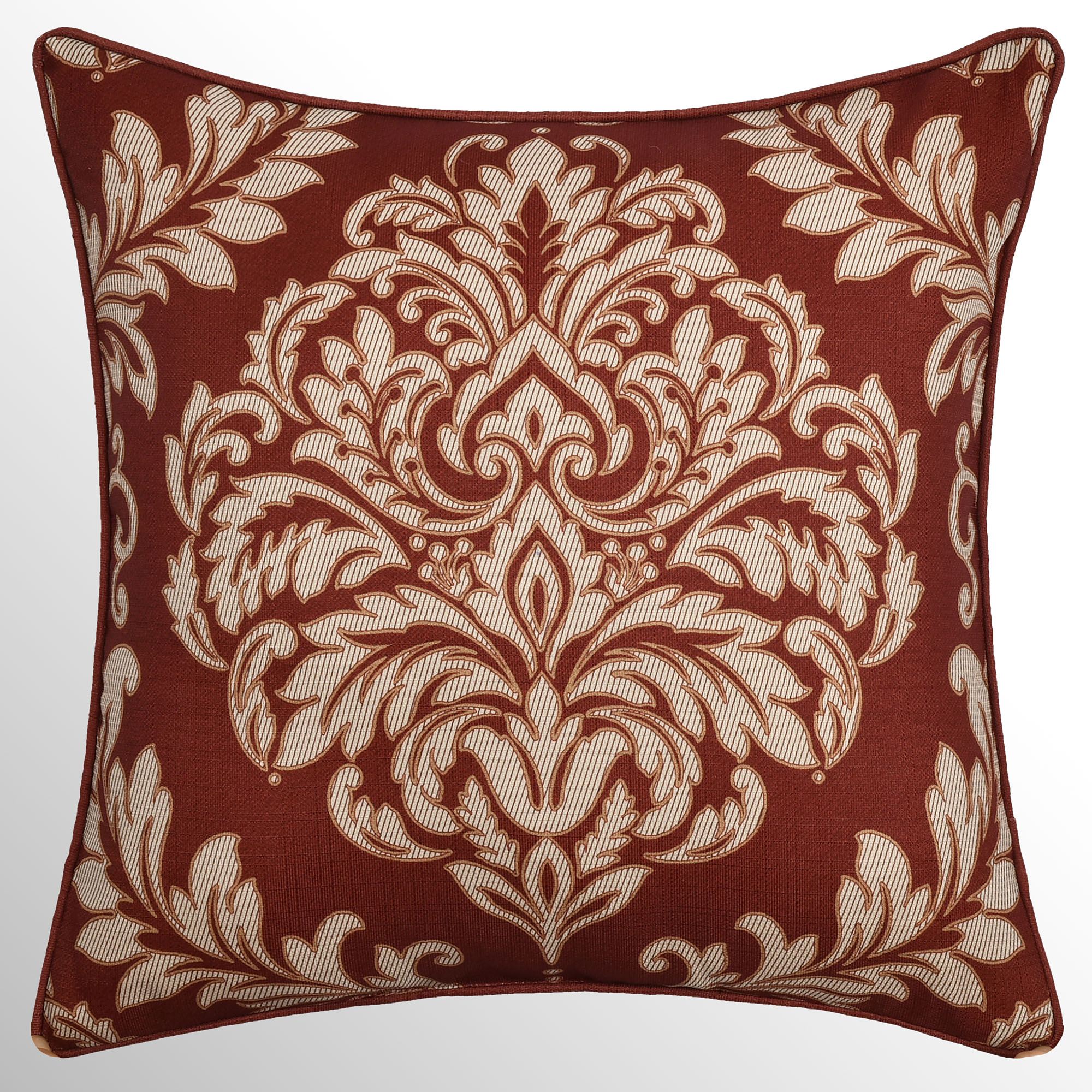Red Pillows: Spot clean. The 18" Square has a striped border with fleurs and piped ends. The 20" Square has a printed damask design and piped ends. The Rectangle has vertical stripes and fleurs along with a pleated flange on the length ends. The handmade, reversible Round is shirred and has a button tuft in the center and a 2" side gusset.