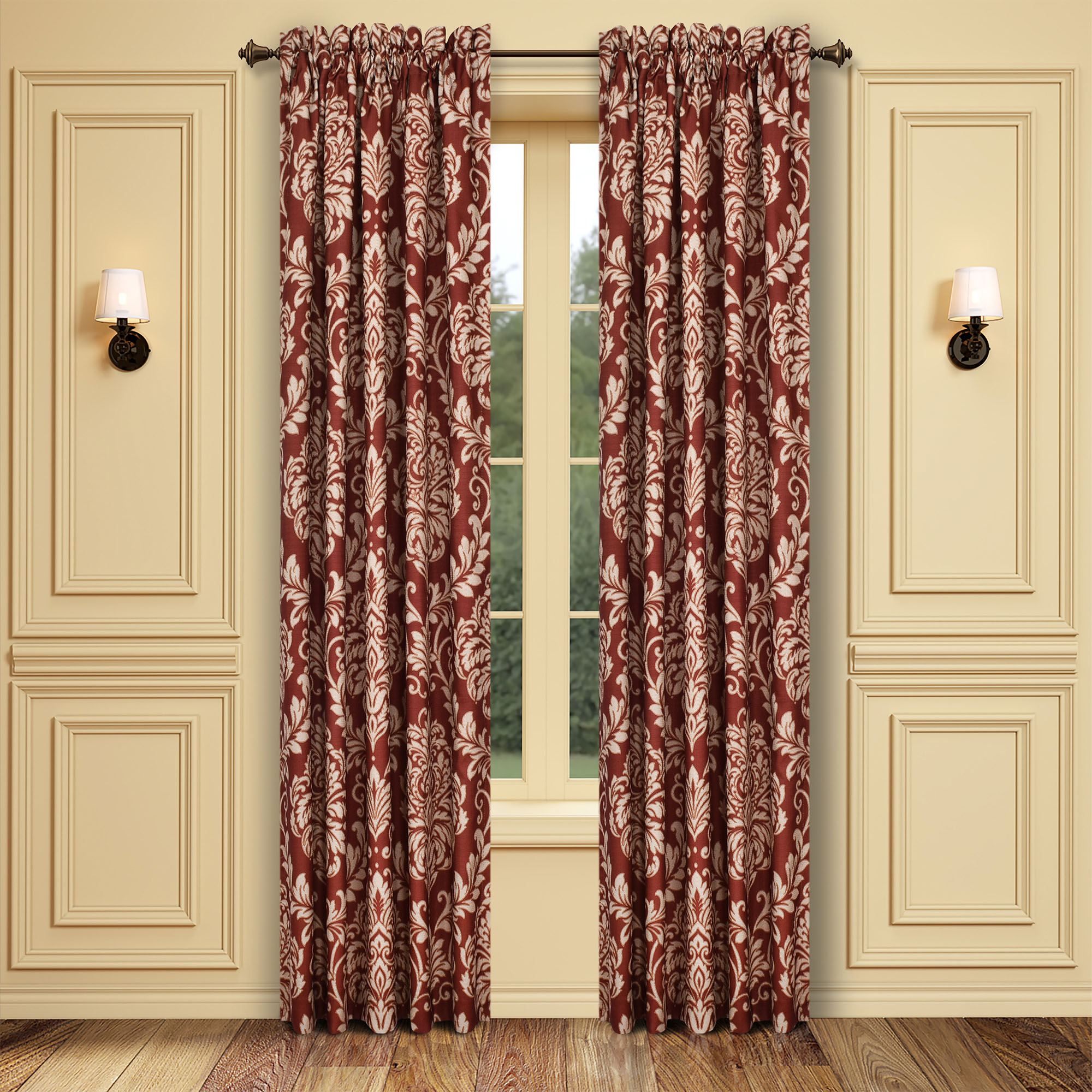 Lined Window Treatments have damask designs on red. The tailored Wide Curtain Pair has a 3" rod pocket and includes tiebacks. Each Ascot Valance has a red tassel on the end and a 3.25" rod pocket.