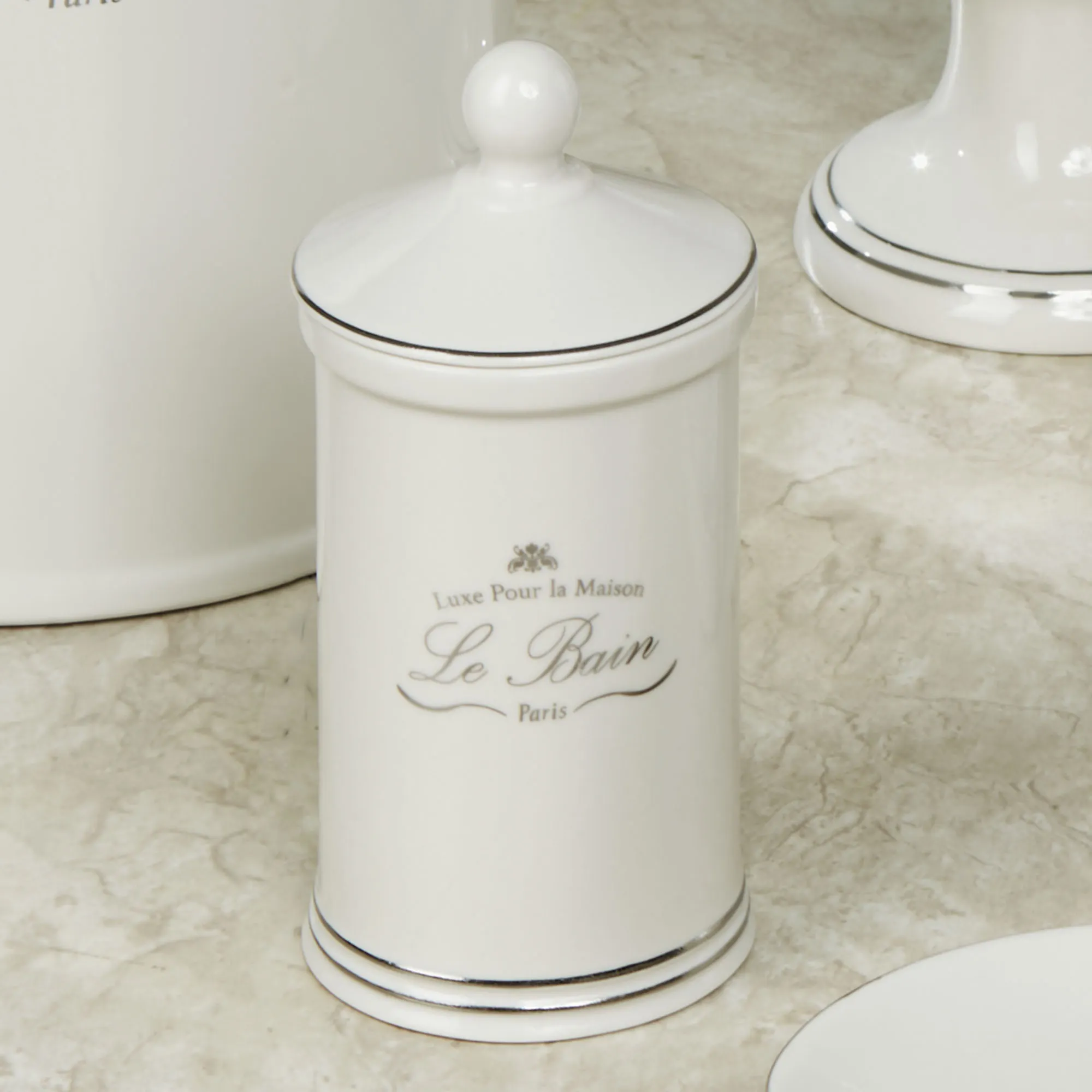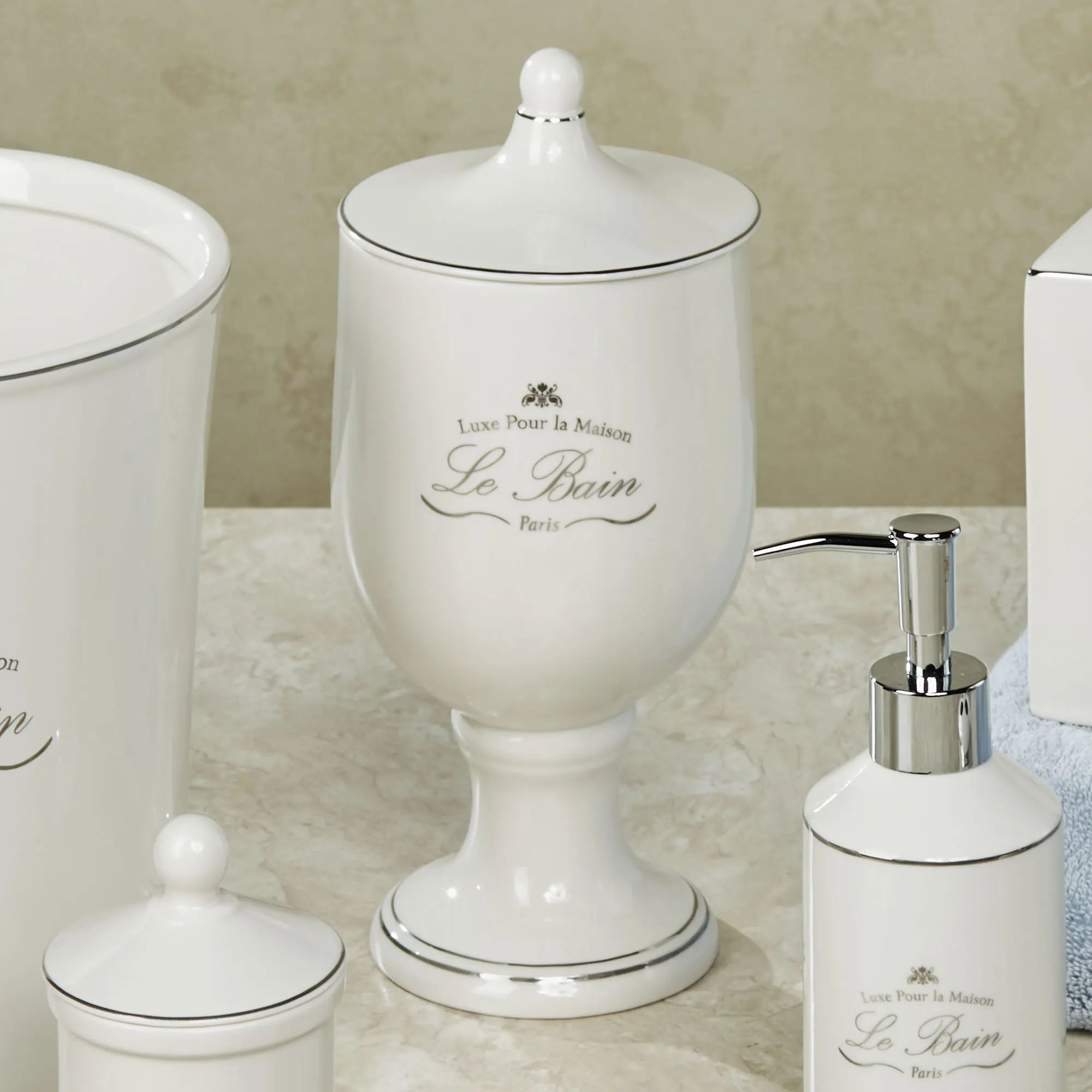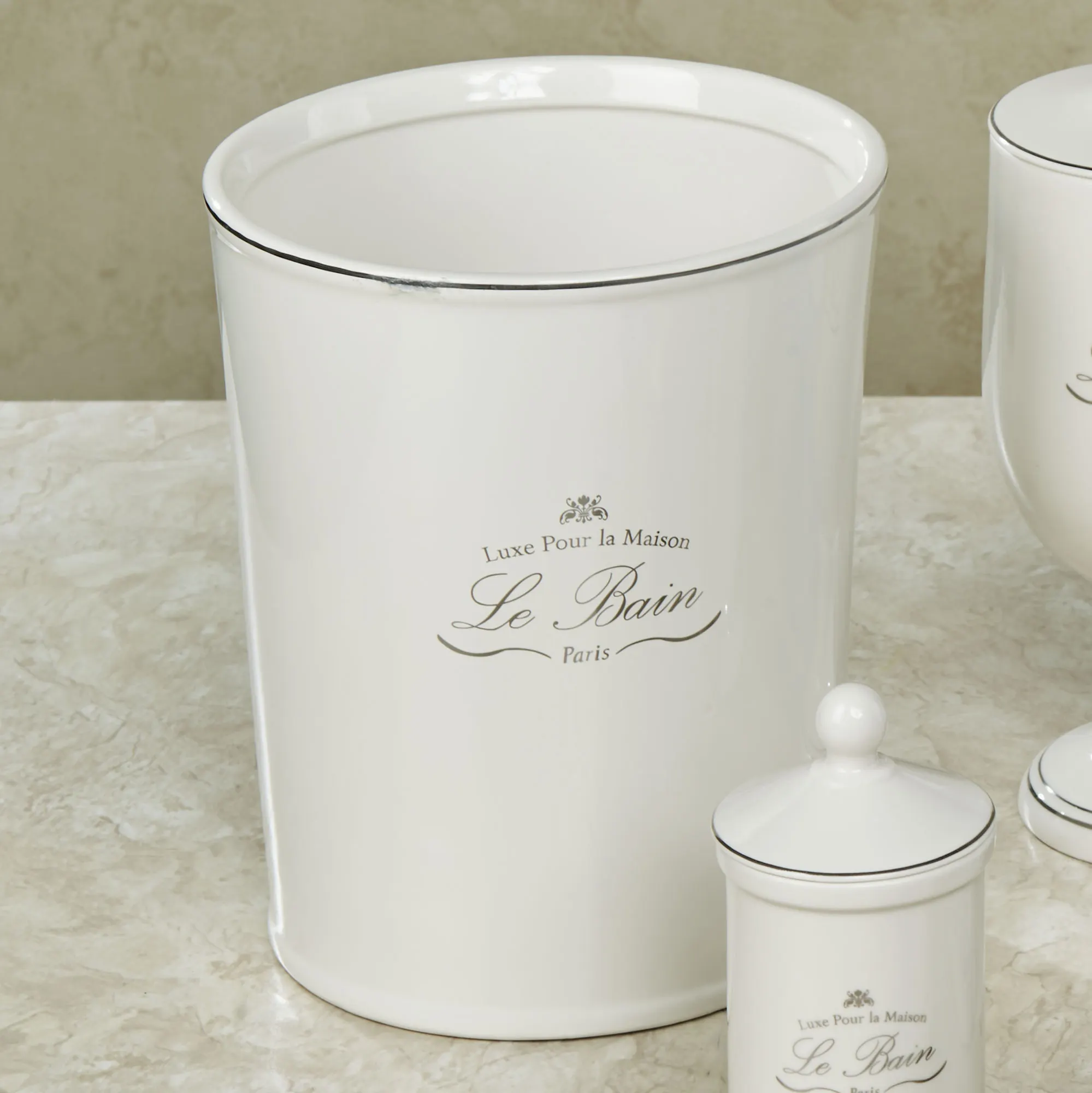 Decorate Le Bain with these French-inspired bath accessories. Made of fine porcelain, these ivory accessories have a glazed finish, platinum-toned detailing, and French text decals. Each says "Le Bain" and "Luxe Pour la Maison." Specify Wastebasket, Tissue Cover, Canister, Tray, Lotion/Soap Dispenser, Covered Jar, Toothbrush Holder, or Soap Dish.
