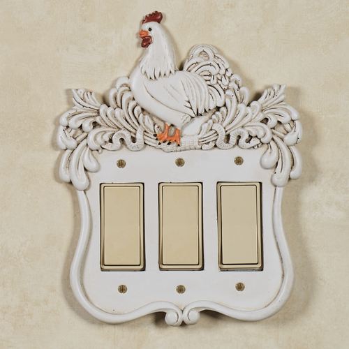 The handpainted Le Chanticleer Rooster Dimmer/Rocker Switch adds the perfect decorative touch in your kitchen or dining room. The handcrafted, resin switchplate features a rooster on top sitting on a bundle of wheat, all in an ivory finish. Triple Dimmer/Rocker is 7.5"Wx9.5"H. Double Dimmer/Rocker is 7.5"Wx9"H. Do not over-tighten the screws.