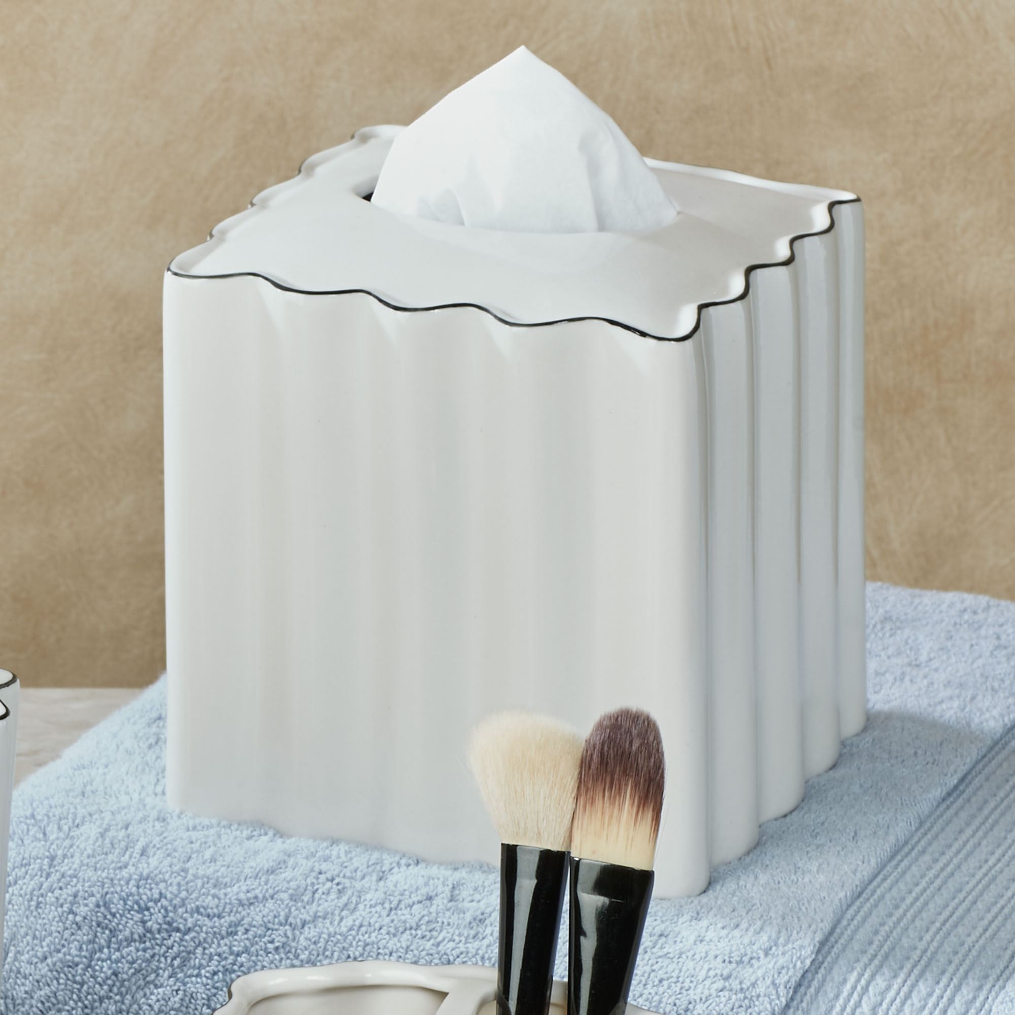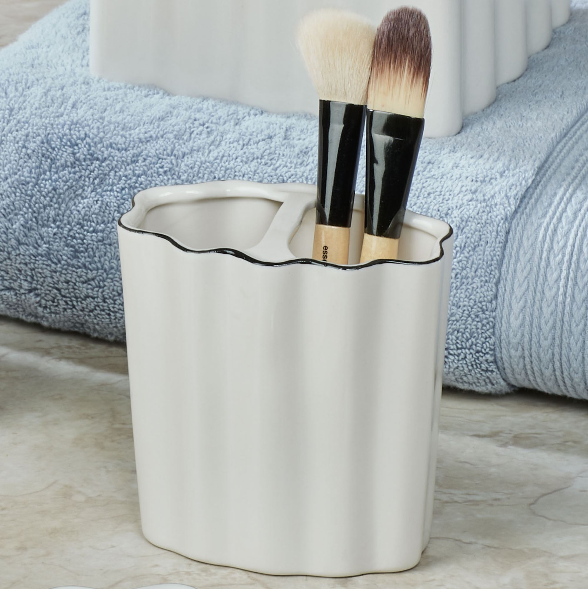 Scalloped designs define the Le Marais Bath Accessories. These porcelain accessories have an ivory finish and handpainted black detailing. Brush Holder can hold makeup brushes or toothbrushes. Specify Wastebasket, Tissue Cover, Tray, Lotion/Soap Dispenser, Brush Holder, Covered Jar, or Soap Dish.