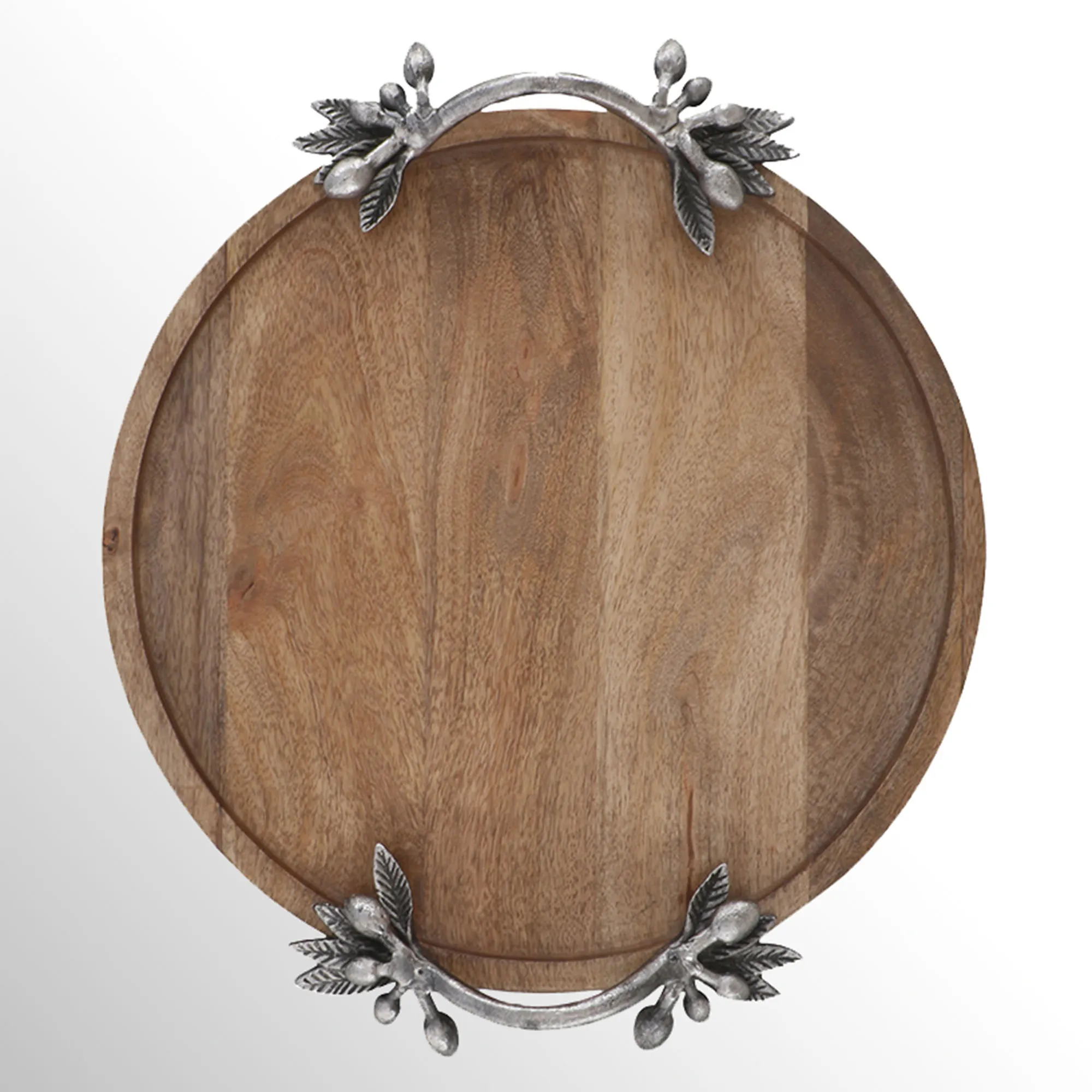 The Leaf and Berry Tray serves or displays your items with a side of natural charm. Finished in aged silver, the aluminum handles resemble twigs with leaves and berries on the side of a natural brown wood tray. Decorative use only. Overall, the tray measures 16"dia.x3"H.
