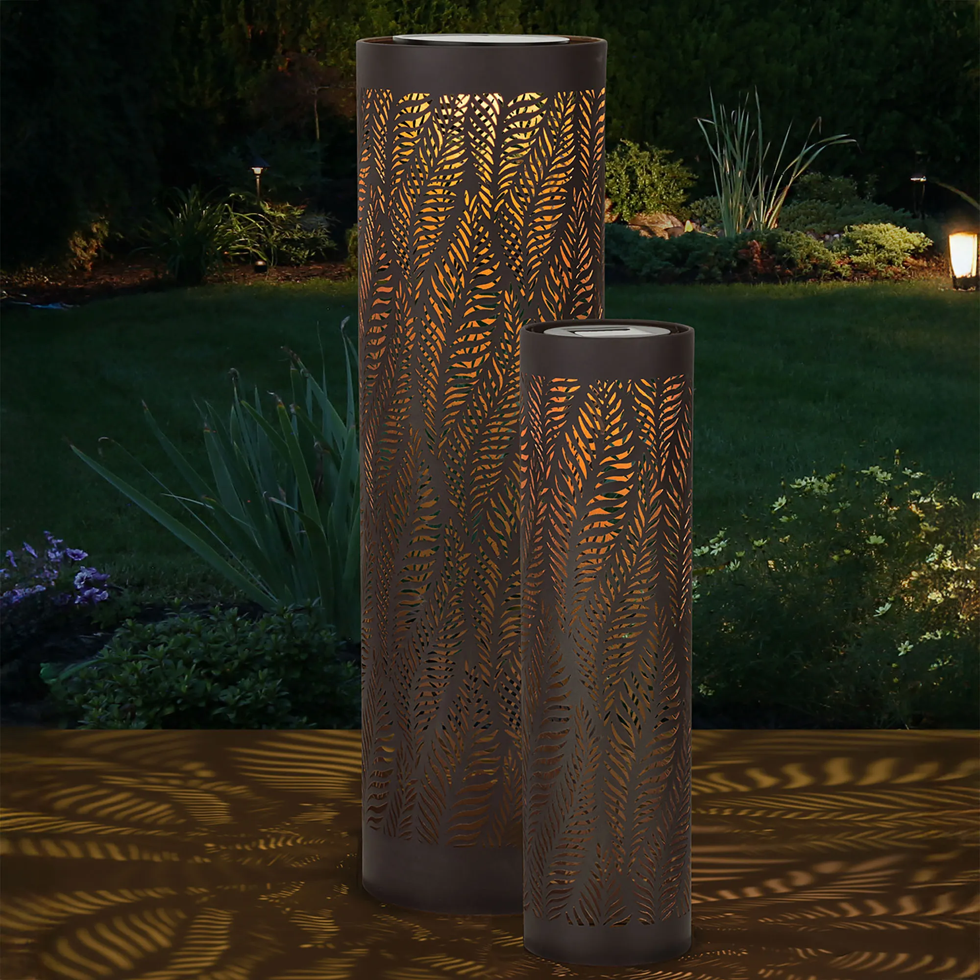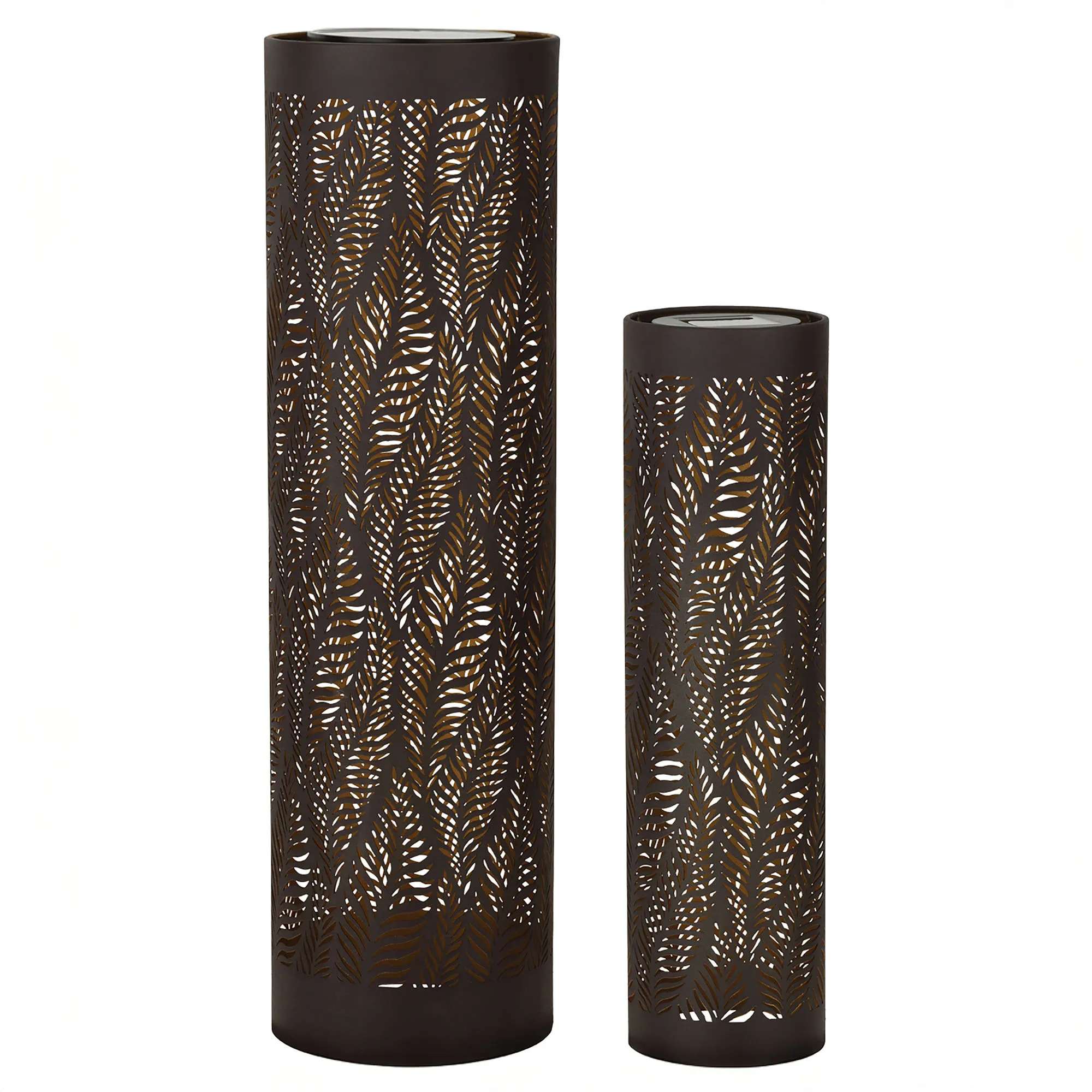 The Leaf Pattern Casting Solar Lantern Set radiates beautiful designs into the nighttime. With a metallic bronze finish, the unique round metal lanterns feature an eye-catching openwork pattern and a highly reflective metallic interior. The built-in solar-powered LED light at the top of each then creates 360 degrees of beautiful projections across your tabletop or the ground for 6-8 continuous hours. Perfect for your patio, pool space, porch, or garden, the waterproof solar panels make the weather- and fade-resistant lanterns a beautiful display outdoors year round. A rechargeable 3.7V battery for each is included. Capable of nesting inside of each other for easy storing when not in use, the set includes small, 5"dia.x18.5"H; and large, 7"dia.x24.5"H.