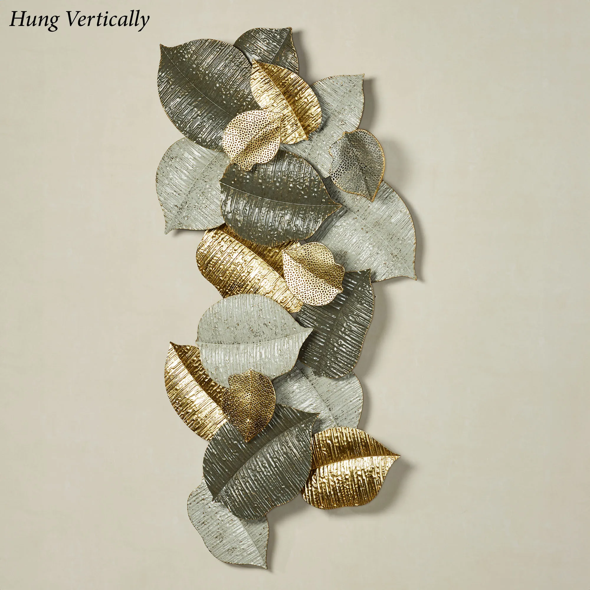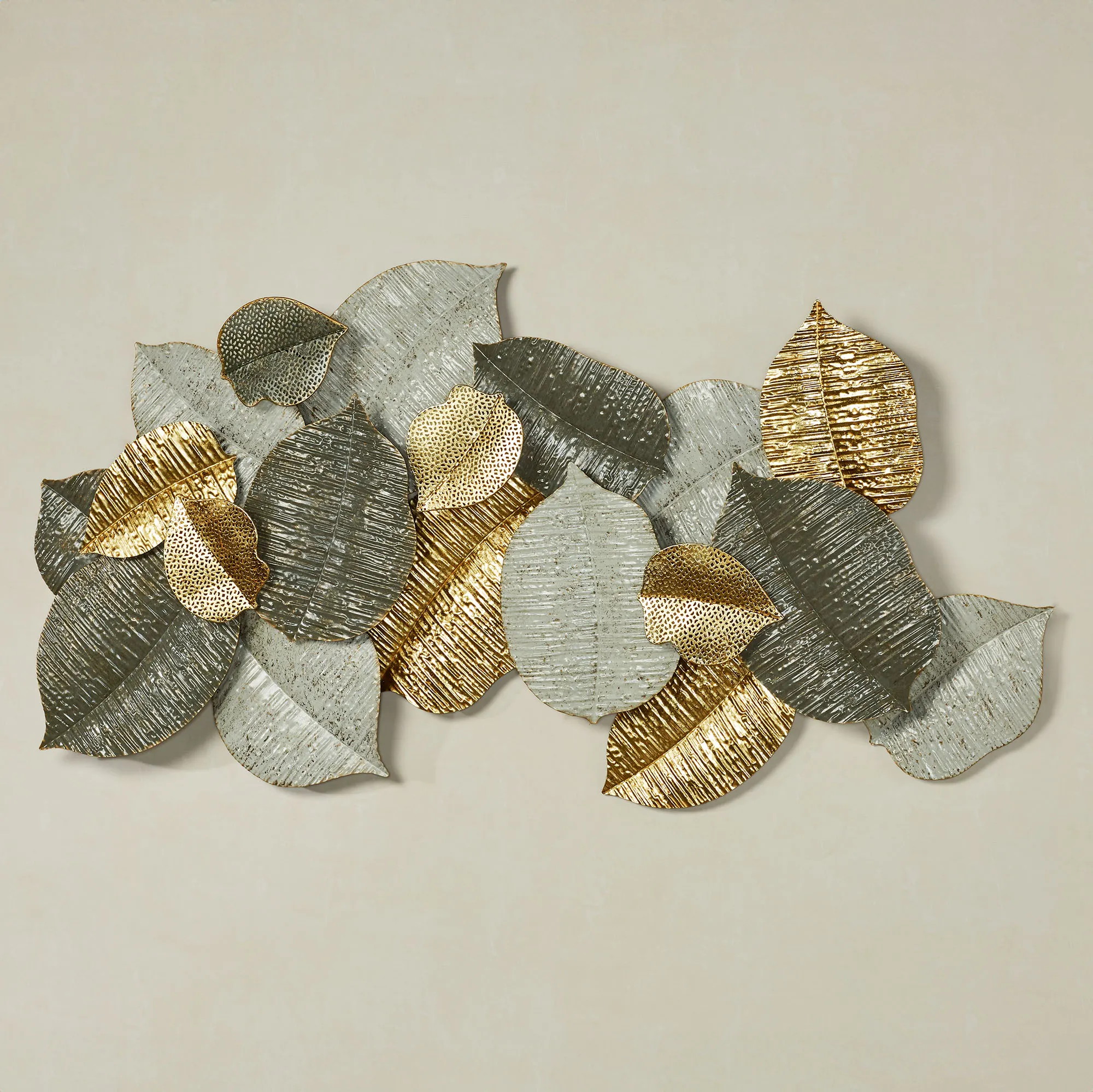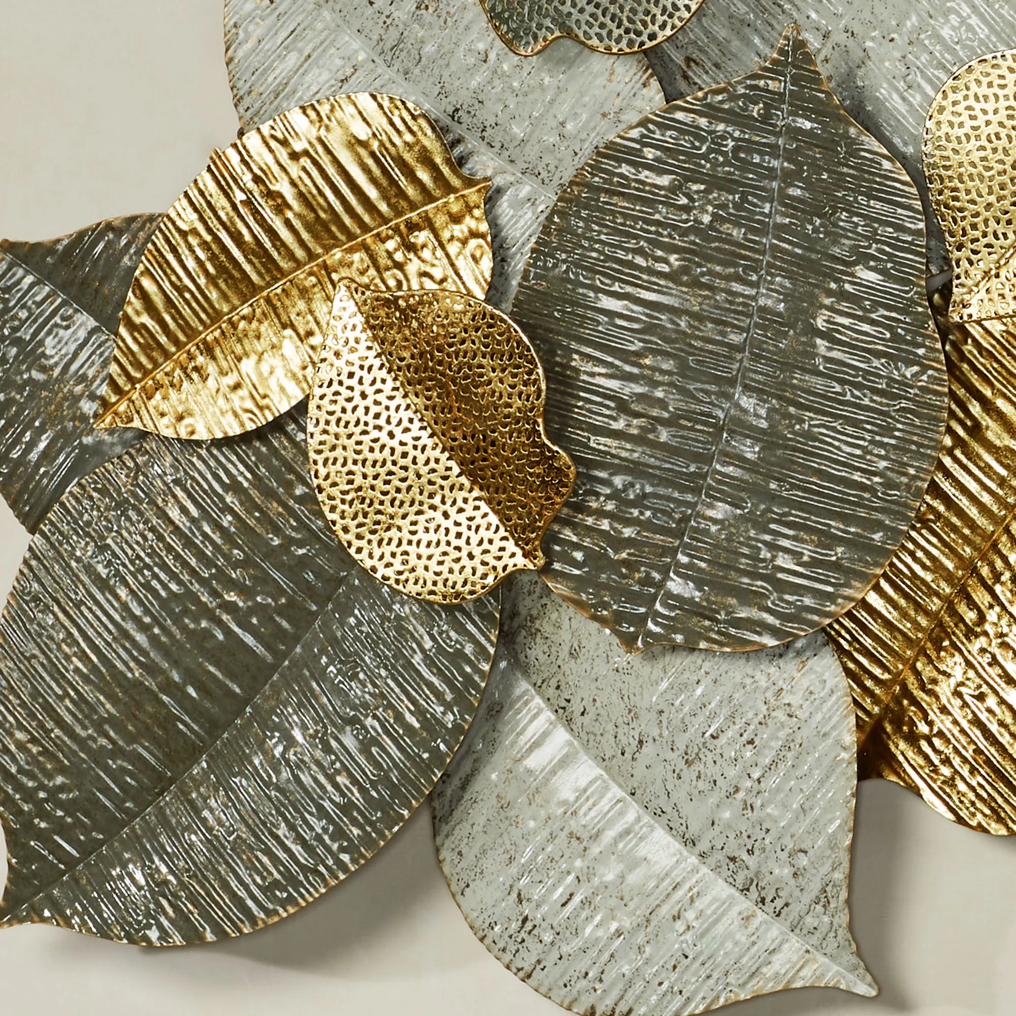 The Leaf Textures Collage Wall Art embraces the diversity of nature. Hand-finished in sage green and gold shades, the dimensional metal wall sculpture features a variety of leaves embellished with rich textures. Artwork can hang horizontally or vertically. Overall, the leaf wall art measures 46"Wx3.5"Dx25"H.