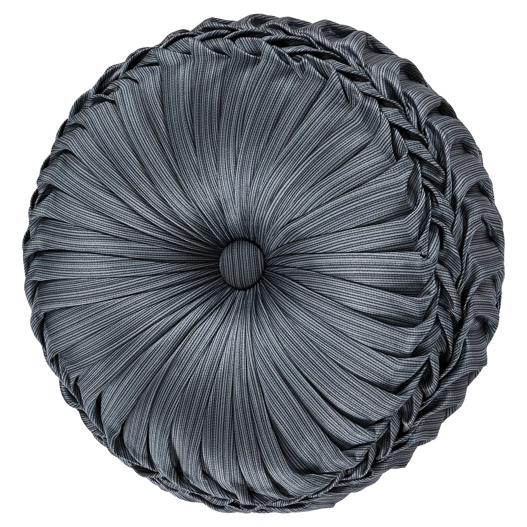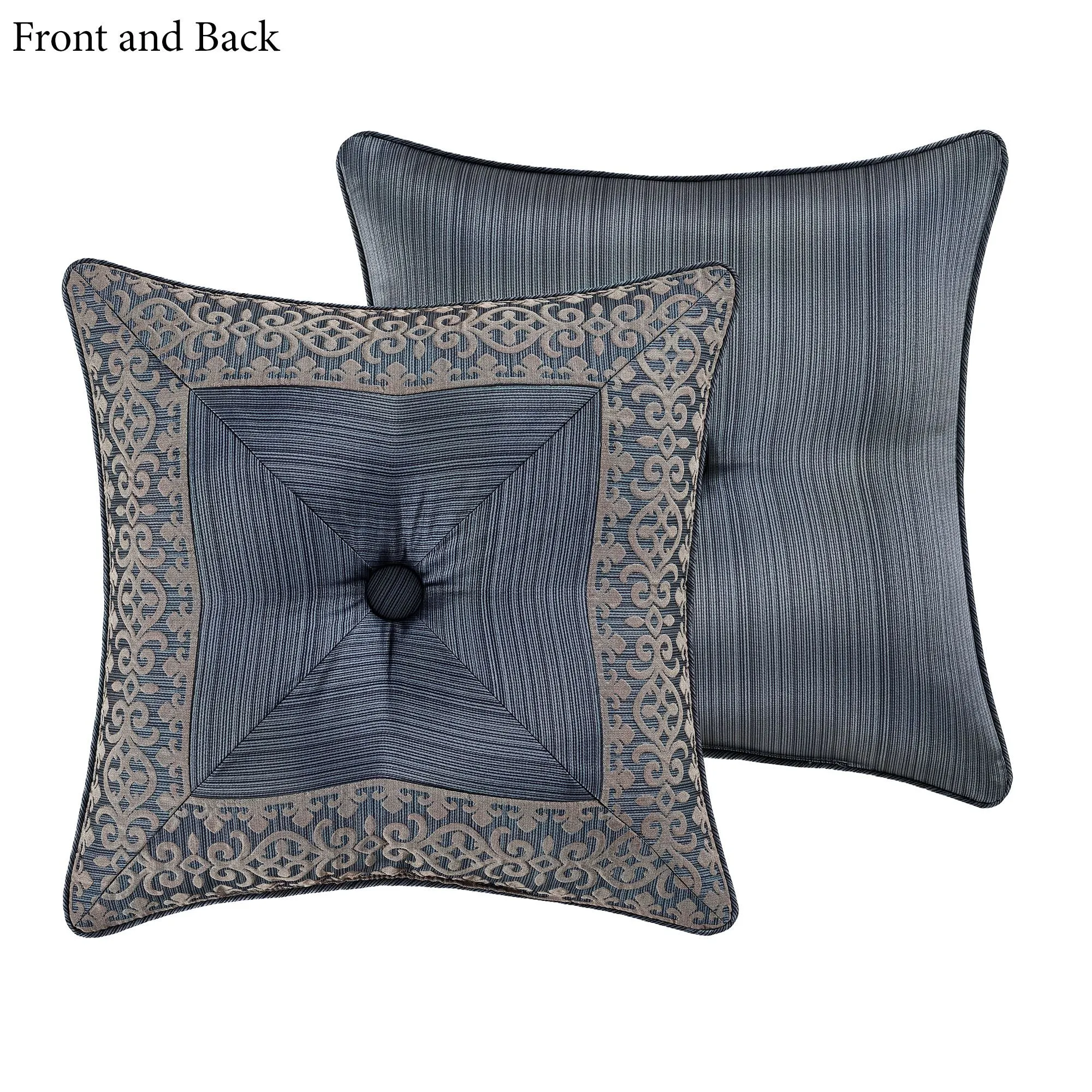 Pillows: Spot clean. Piped Square has puff lattice framed with puff scrolls and has a blue striae reverse. Tufted Square has blue striae with a button tuft, a mitred puff scroll frame, and piping; reverse is blue striae. Piped Rectangle has puff lattice and a mitred frame with puff scrolls; reverse is blue striae. Handmade, reversible Round has blue striae with pleats, a central button tuft, and a 3" side gusset; reverse is blue striae.