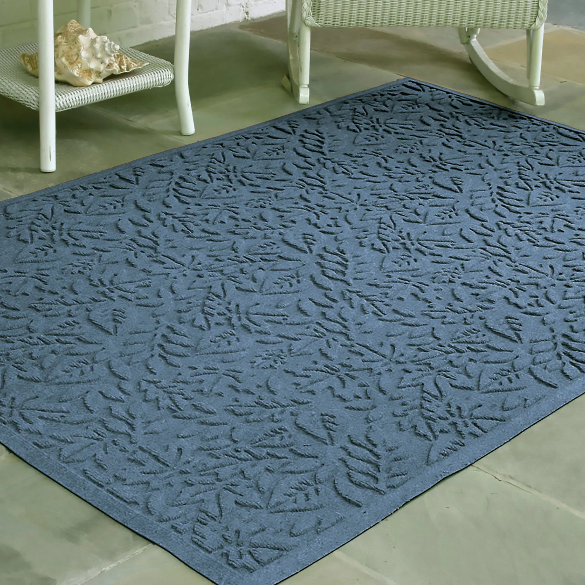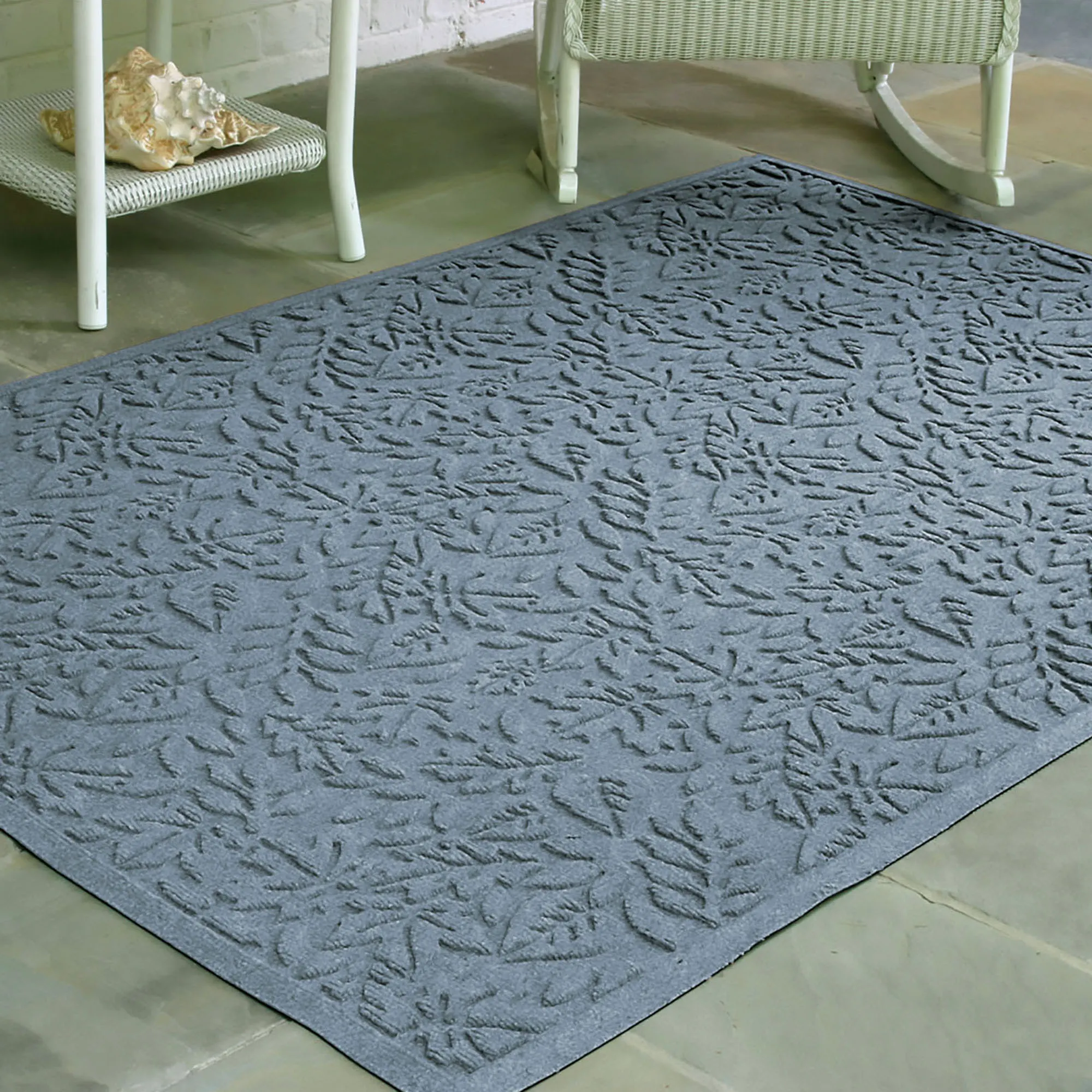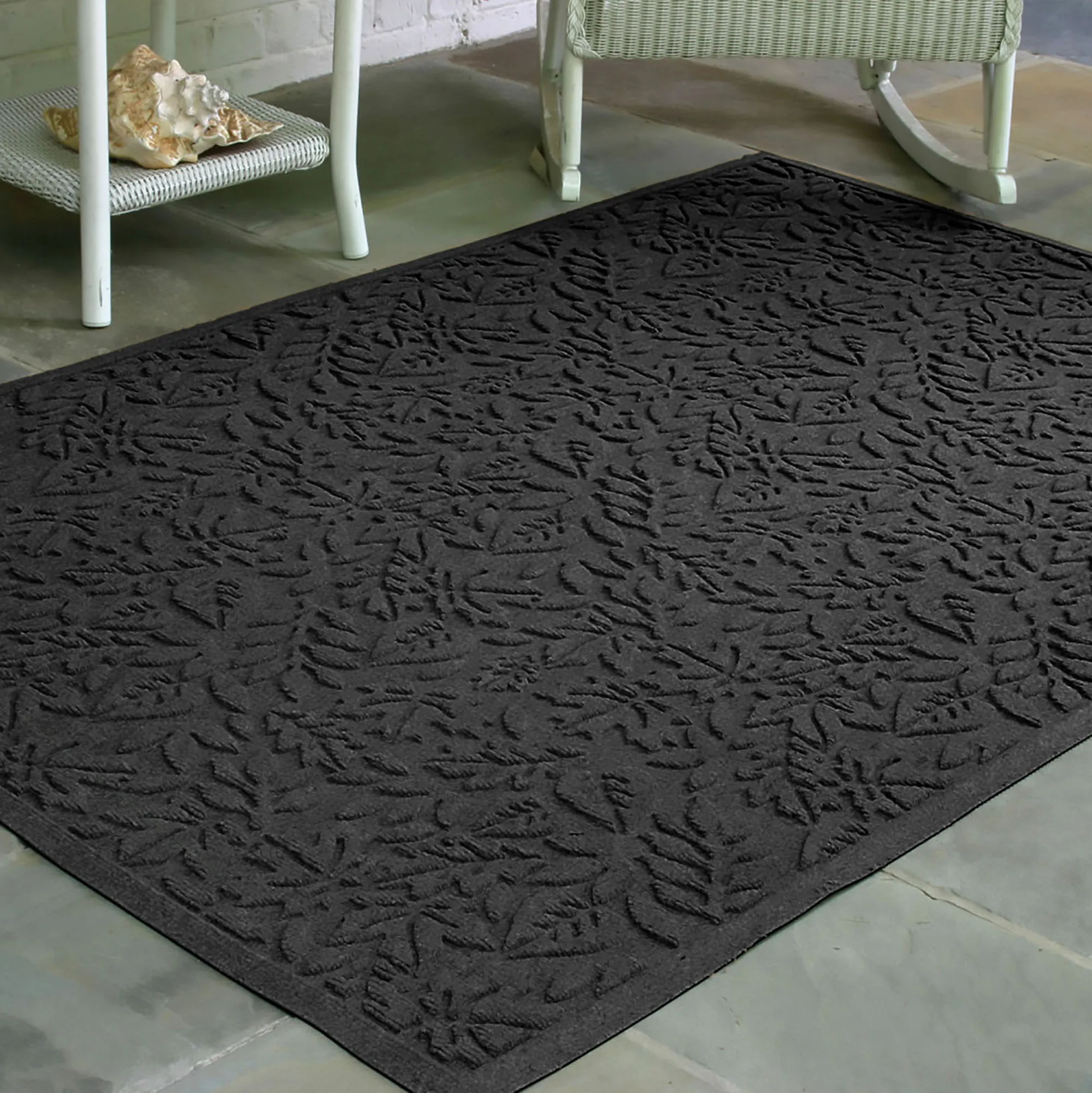 Display the all-over design of scattered Leaves. The antistatic PET polyester fiber extra-large mat has an all-over leafy foliage design, along with a nonskid SBR rubber backing that is slip-resistant and certified by the National Floor Safety Institute. The WaterHog(R) exclusive Water Dam border keeps dirt and water on the mat and not your floor. Premium-grade mat is mildew-, mold-, and rot-resistant. Specify Burgundy, Charcoal, Dark Brown, Dark Green, Gray, Khaki, Navy, or Slate Blue. Extra-large mat is 70"x45". Indoor or outdoor year-round use. Shake to remove loose dirt and hose off to clean.