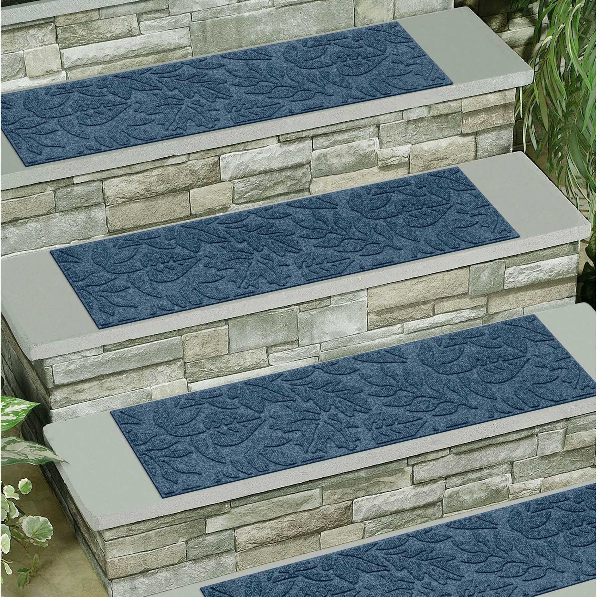 Display the all-over design of scattered Leaves. The antistatic PET polyester fiber stair tread set has an all-over leafy foliage design, along with a nonskid SBR rubber backing that is slip-resistant and certified by the National Floor Safety Institute. The WaterHog(R) property keeps dirt and water on the treads and not your floor. Premium-grade stair treads are mildew-, mold-, and rot-resistant. Specify Gray, Burgundy, Charcoal, Dark Brown, Dark Green, Khaki, Navy, or Slate Blue. Stair treads are each 30"x8.5"; sold as a four-piece set. Indoor or outdoor year-round use. Shake to remove loose dirt and hose off to clean.