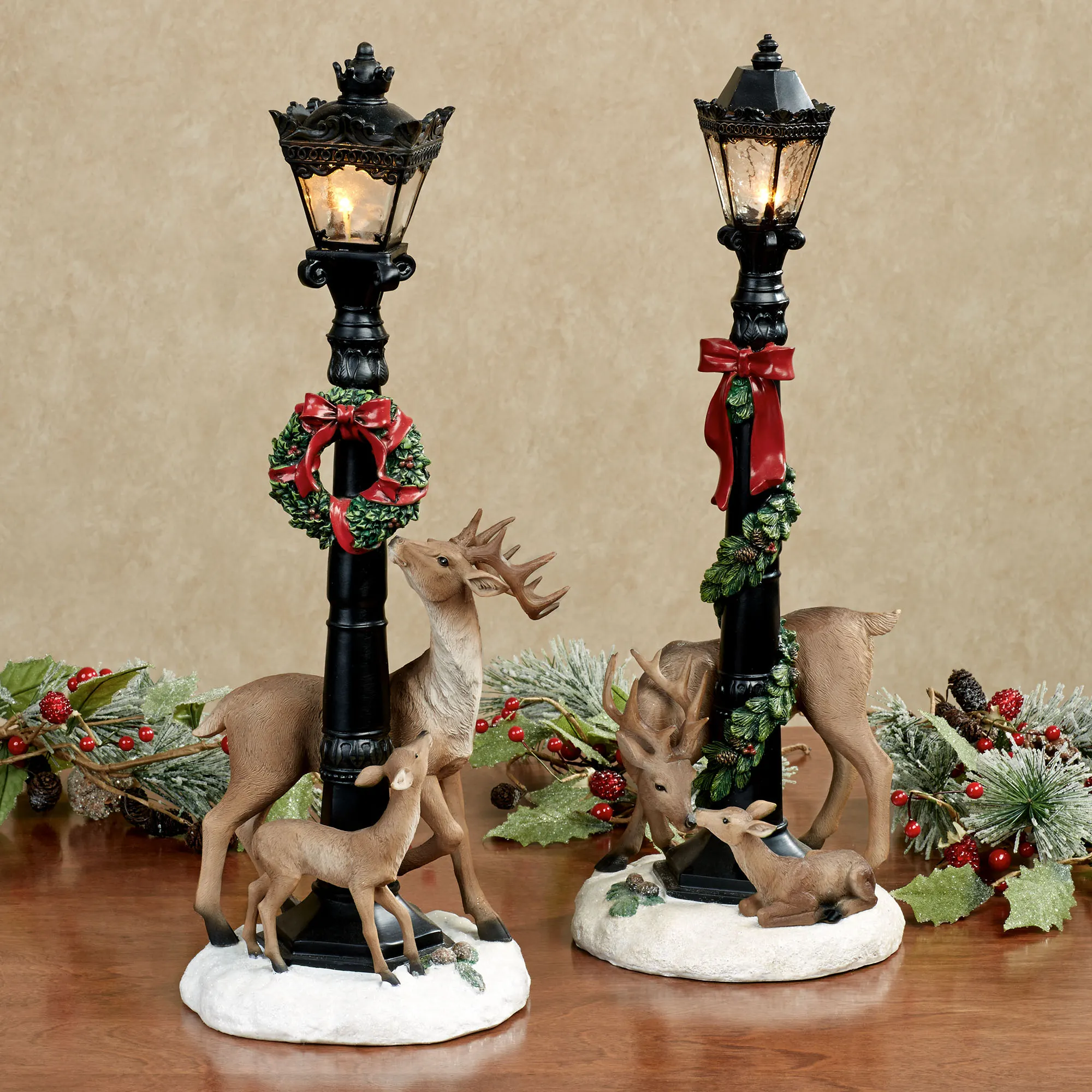 Exquisite detail and soft illumination make the LED Lighted Lampposts with Deer Figure Set a terrific holiday accent. Resin lampposts feature LED lights and are graced by a deer with a fawn in different poses on a glittery, snow-covered base. Posts are decorated with holly garland with a bow or a wreath. Each uses 3 of your AA batteries. Each measures 7"dia.x19"H.