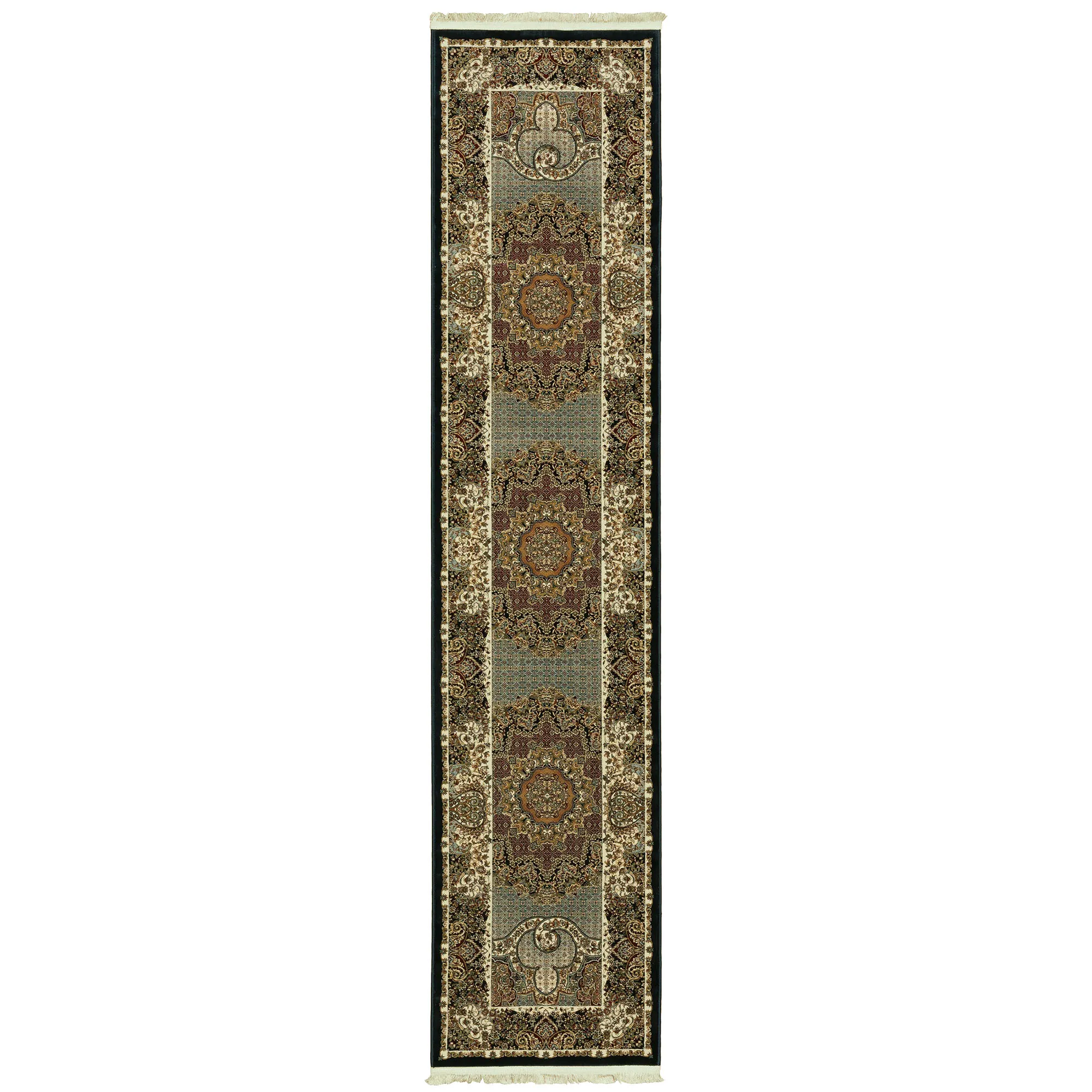 Meticulously detailed layers converge upon each other within the Ledger Area Rug to create an intricate, dense display of finery. Power-loomed from polypropylene, the .15" thick rug features an elaborate medallion and border design filled with exquisite detailing and hues of black, navy, garnet red, and true ivory. Ivory fringed ends complete the look with charm. We recommend professional cleaning by a rug cleaner. Imported.