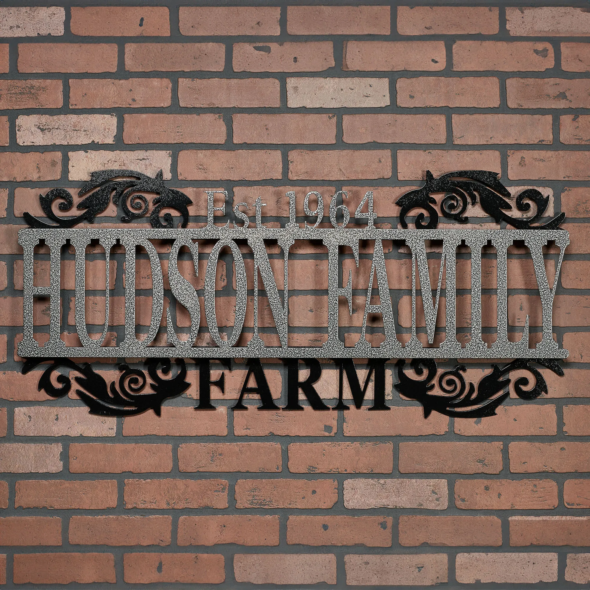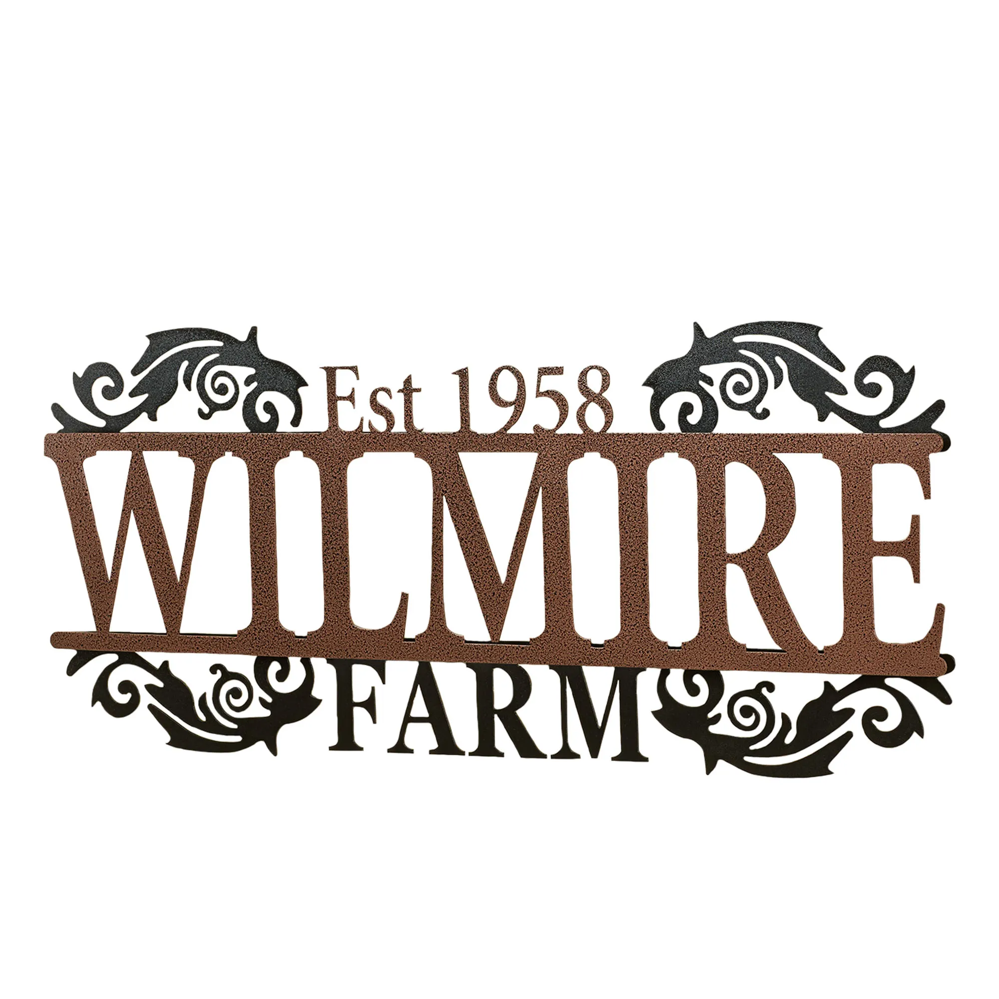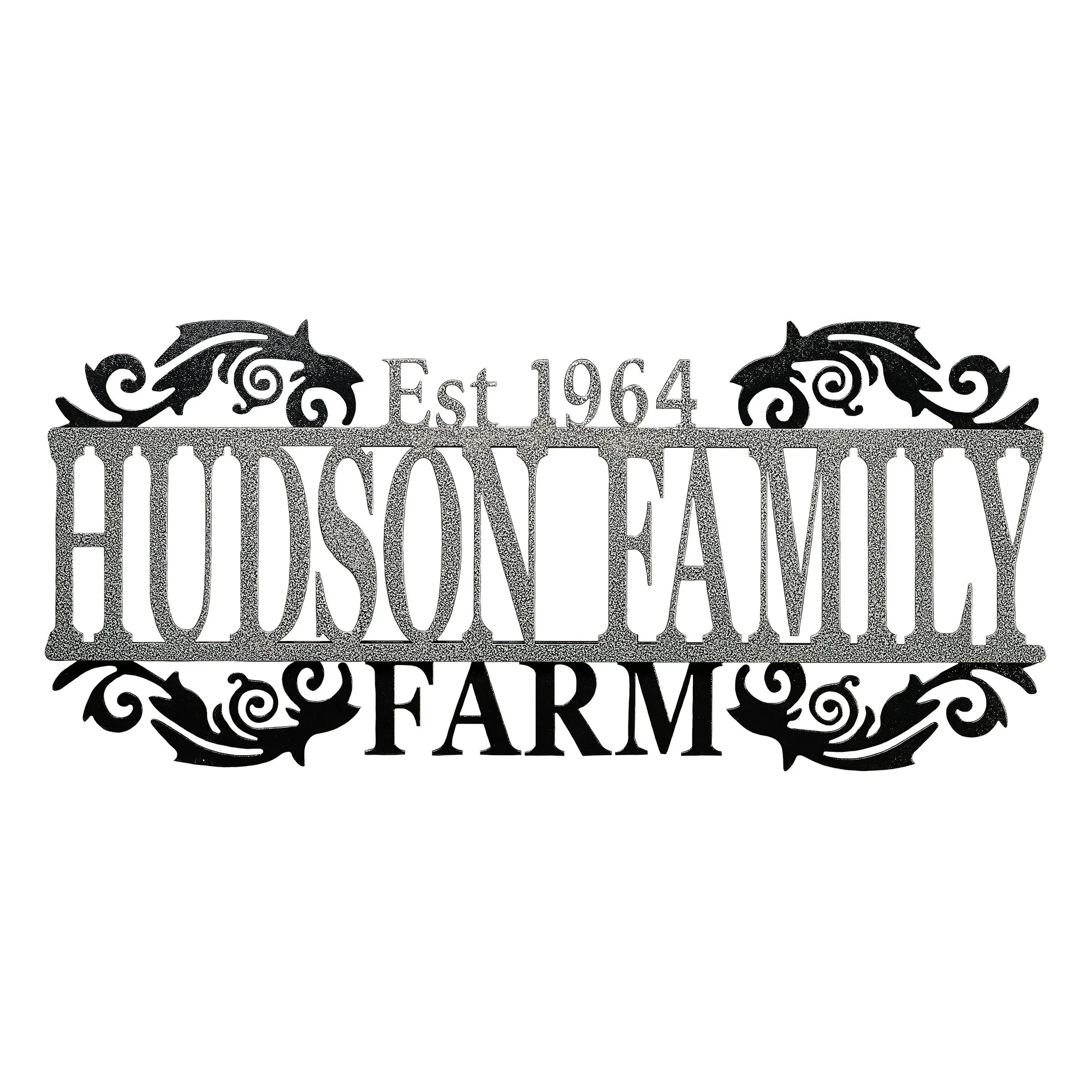 Display your last name and established year in a sophisticated display with the Legacy Farm Personalized Metal Wall Art Sign. Handcrafted of precision-cut, 14-gauge steel, this indoor/outdoor sign has a powder-coated finish that is UV-, weather-, and tarnish-resistant. The scrolls and "Farm" subtitle have a black finish. Choose from three finishes for the name and established year. This item may be personalized with your name or phrase up to 14 CHARACTERS (including spaces) and an established year. A hyphen counts as a character. Letters are uppercase with the exception of names with a prefix. In those cases, the prefix will be uppercase and lowercase, like MacDONALD. Overall, sign measures 40"Wx1.5"Dx18"H. (C)2015 Touch of Class(R).