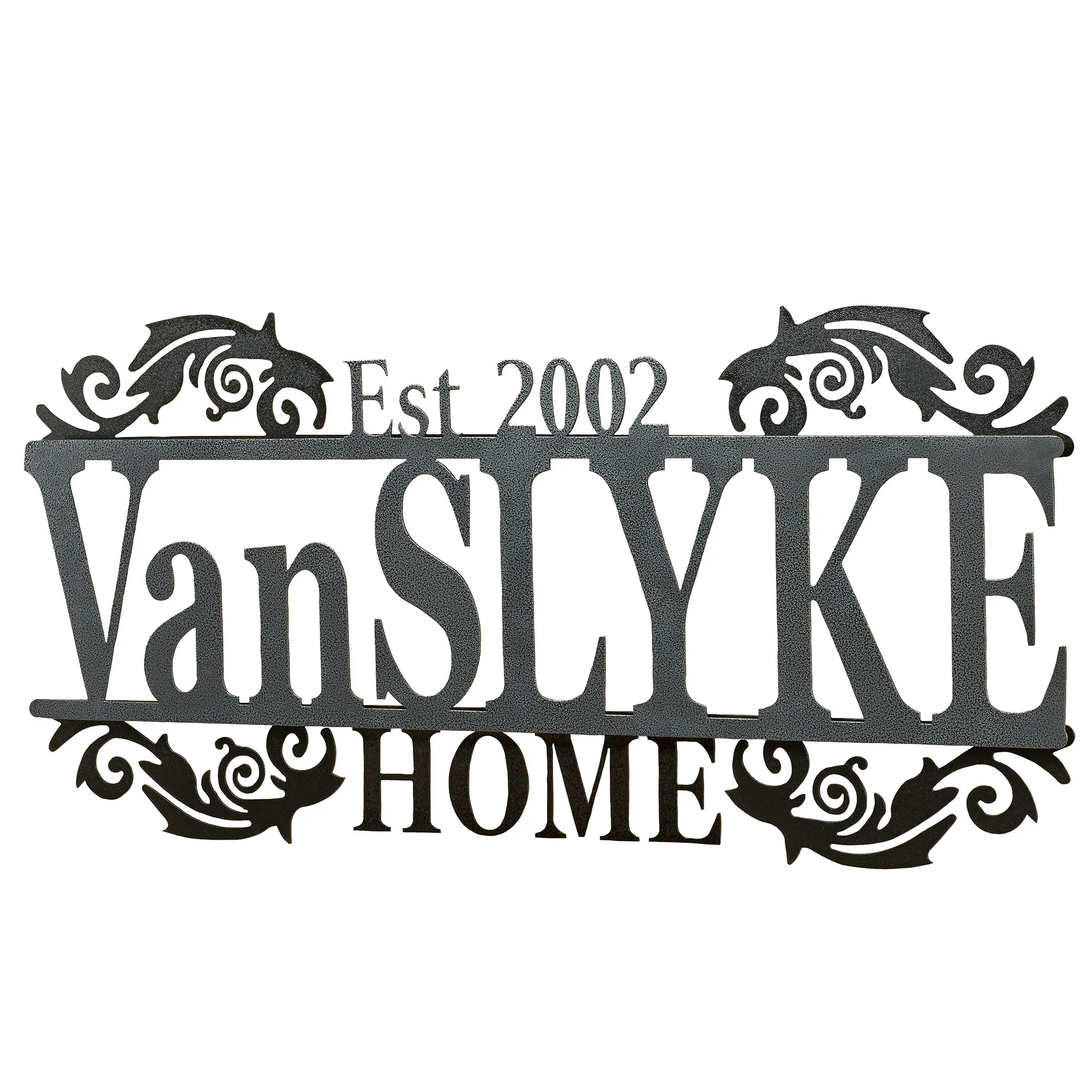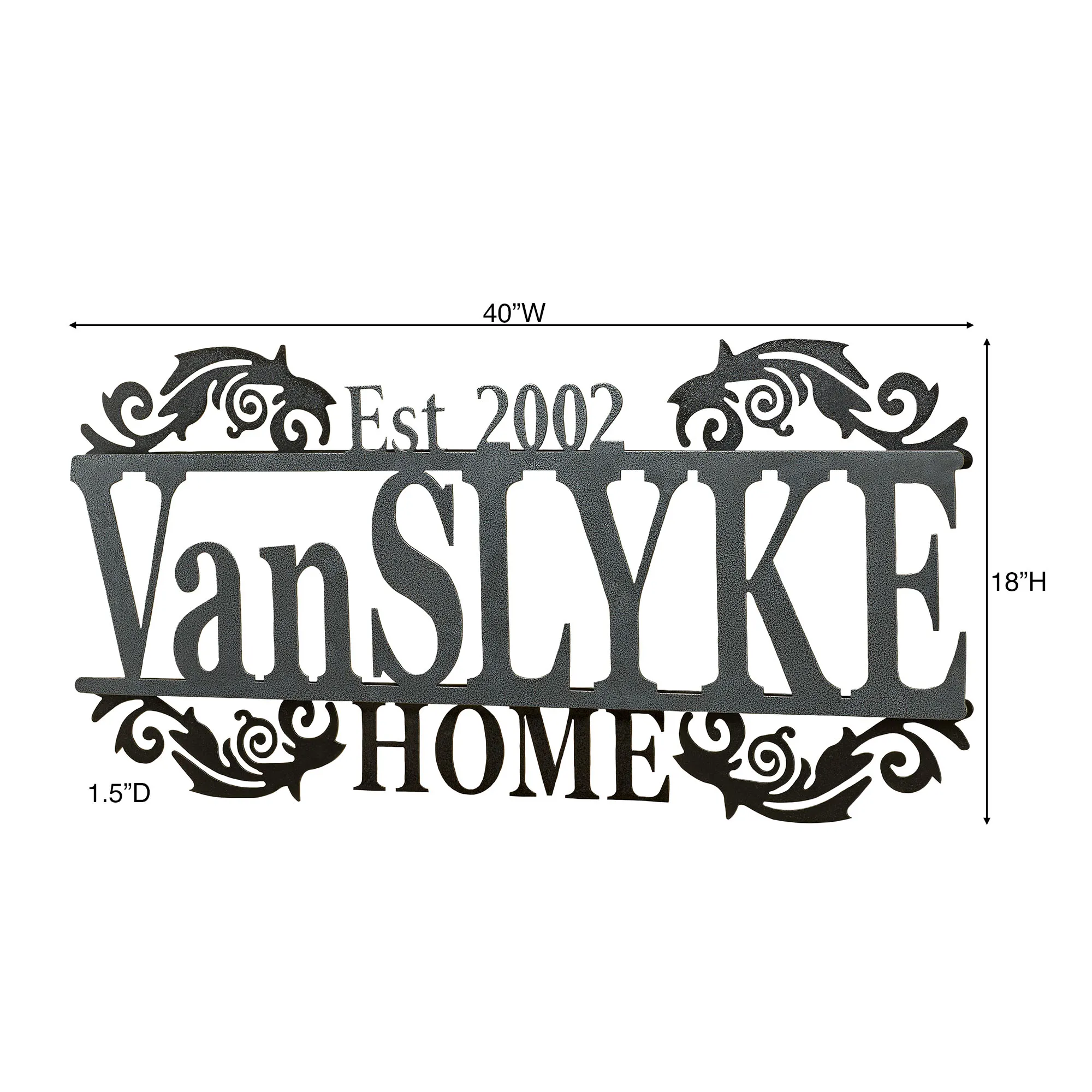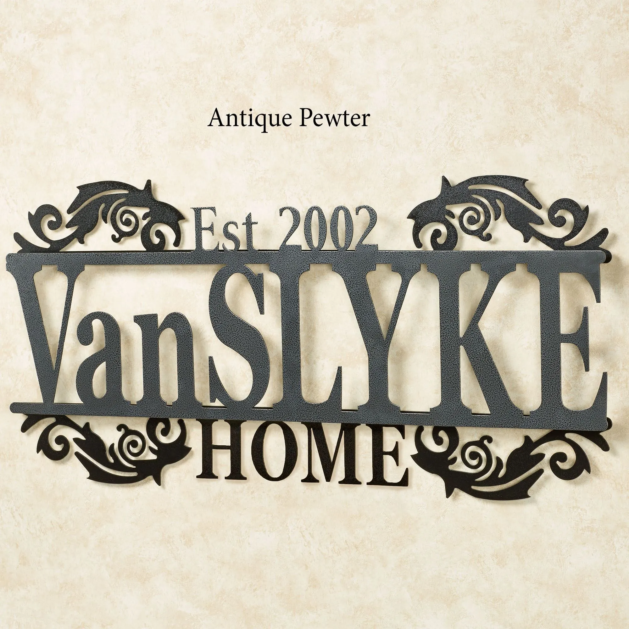 Display your last name and established year in a sophisticated display with the Legacy Home Personalized Metal Wall Art Sign. Handcrafted of precision-cut, 14-gauge steel, this indoor/outdoor sign has a powder-coated finish that is UV-, weather-, and tarnish-resistant. The scrolls and "Home" subtitle have a black finish. Choose from three finishes for the name and established year. This item may be personalized with your name or phrase up to 14 CHARACTERS (including spaces) and an established year. A hyphen counts as a character. Letters are uppercase with the exception of names with a prefix. In those cases, the prefix will be uppercase and lowercase, like MacDONALD. Overall, sign measures 40"Wx1.5"Dx18"H. (C)2015 Touch of Class(R).