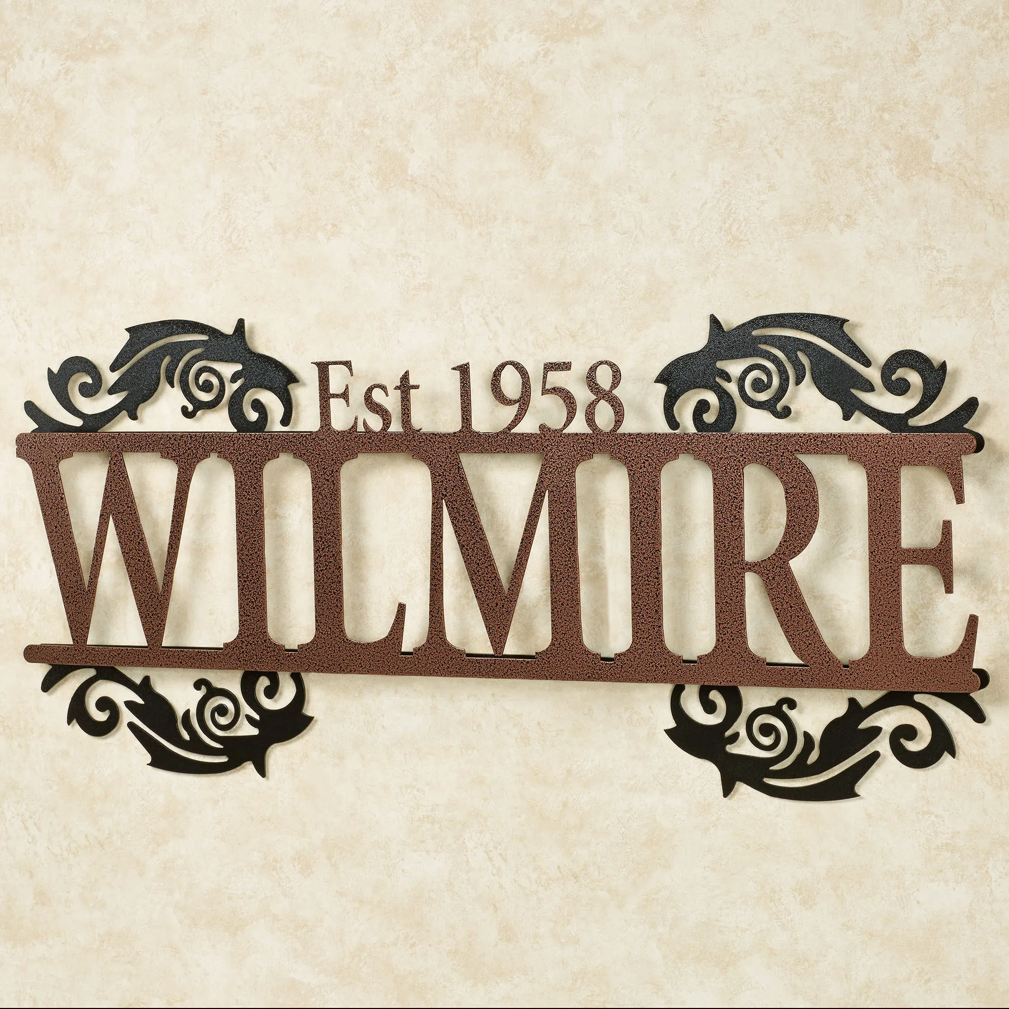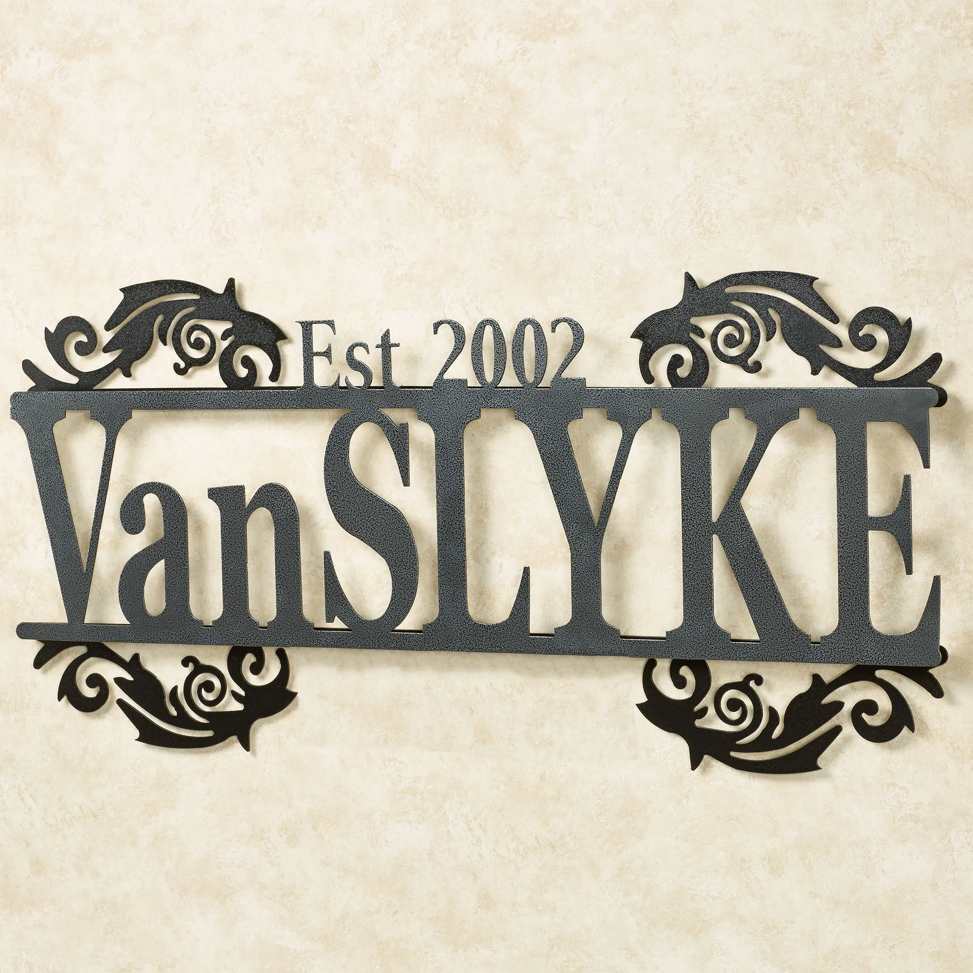 Display the Legacy of your last name and established year in a sophisticated display with this personalized metal wall art sign. Handcrafted of precision-cut, 14-gauge steel, this indoor/outdoor sign has a powder-coated finish that is UV-, weather-, and tarnish-resistant. The scrolls have a black finish. Choose from three finishes for the name and established year. This item may be personalized with your name or phrase up to 14 CHARACTERS (including spaces) and an established year. A hyphen counts as a character. Letters are uppercase with the exception of names with a prefix. In those cases, the prefix will be uppercase and lowercase, like MacDONALD. Overall, sign measures 40"Wx1.5"Dx18"H. (C)2015 Touch of Class(R).