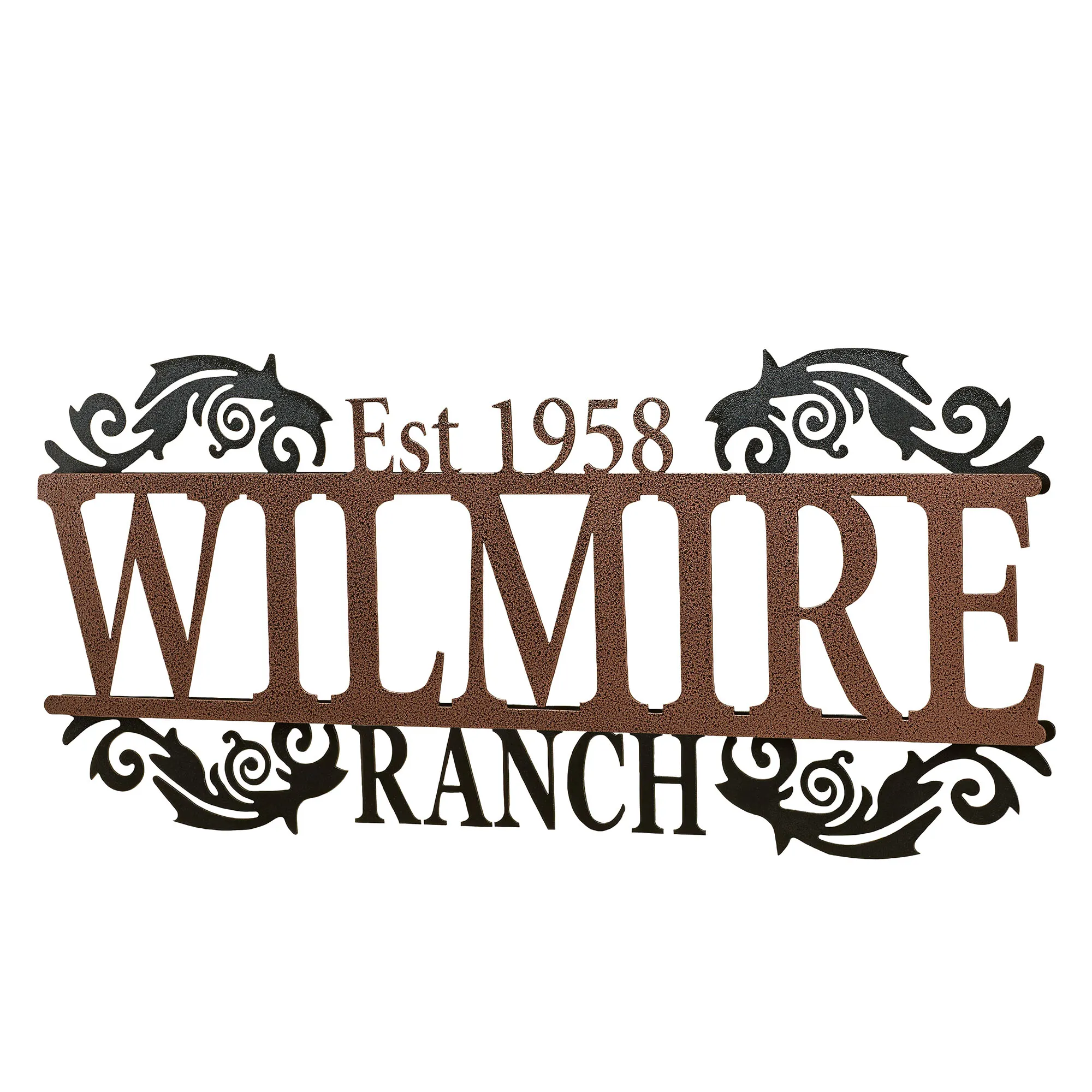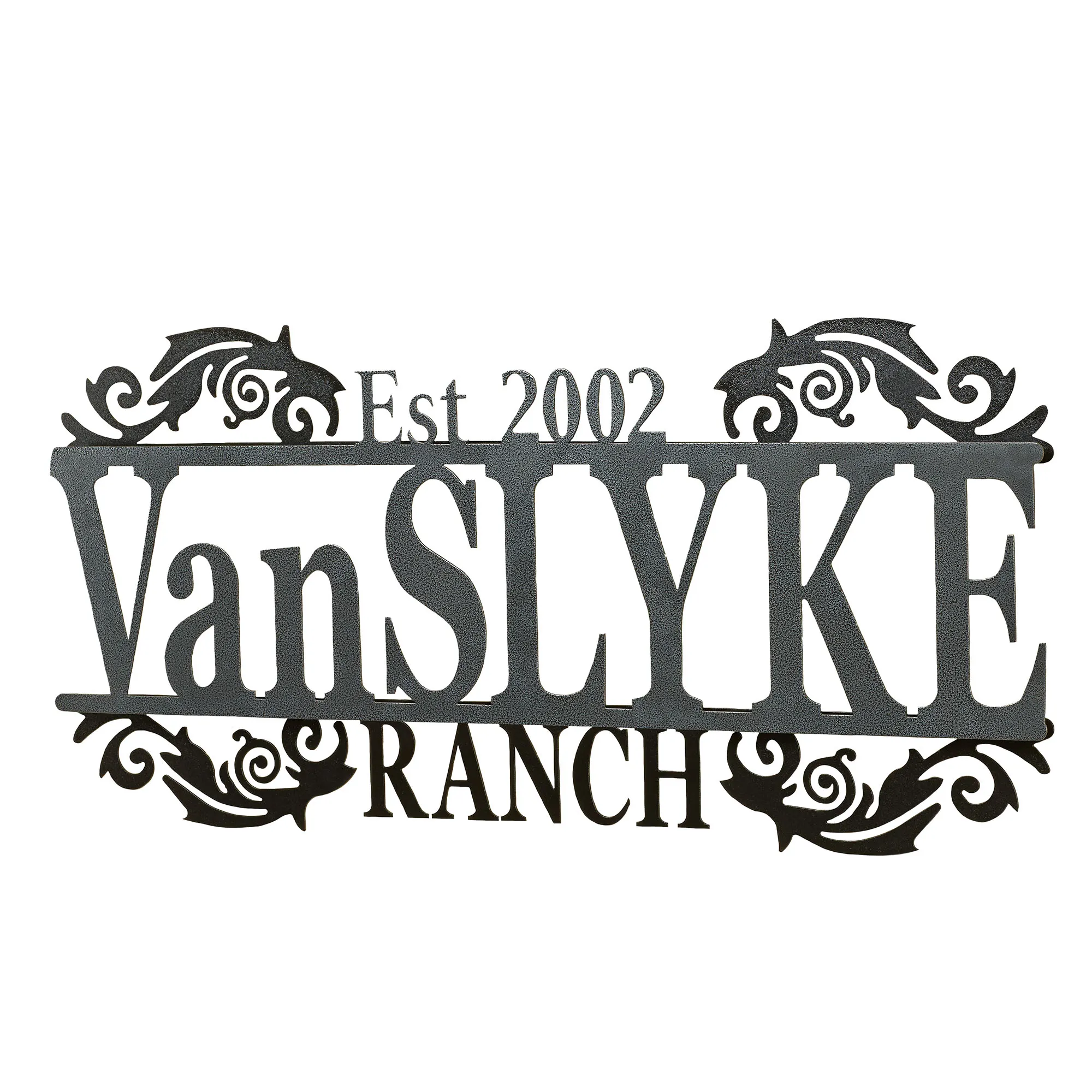 Display your last name and established year in a sophisticated display with the Legacy Ranch Personalized Metal Wall Art Sign. Handcrafted of precision-cut, 14-gauge steel, this indoor/outdoor sign has a powder-coated finish that is UV-, weather-, and tarnish-resistant. The scrolls and "Ranch" subtitle have a black finish. Choose from three finishes for the name and established year. This item may be personalized with your name or phrase up to 14 CHARACTERS (including spaces) and an established year. A hyphen counts as a character. Letters are uppercase with the exception of names with a prefix. In those cases, the prefix will be uppercase and lowercase, like MacDONALD. Overall, sign measures 40"Wx1.5"Dx18"H. (C)2015 Touch of Class(R).