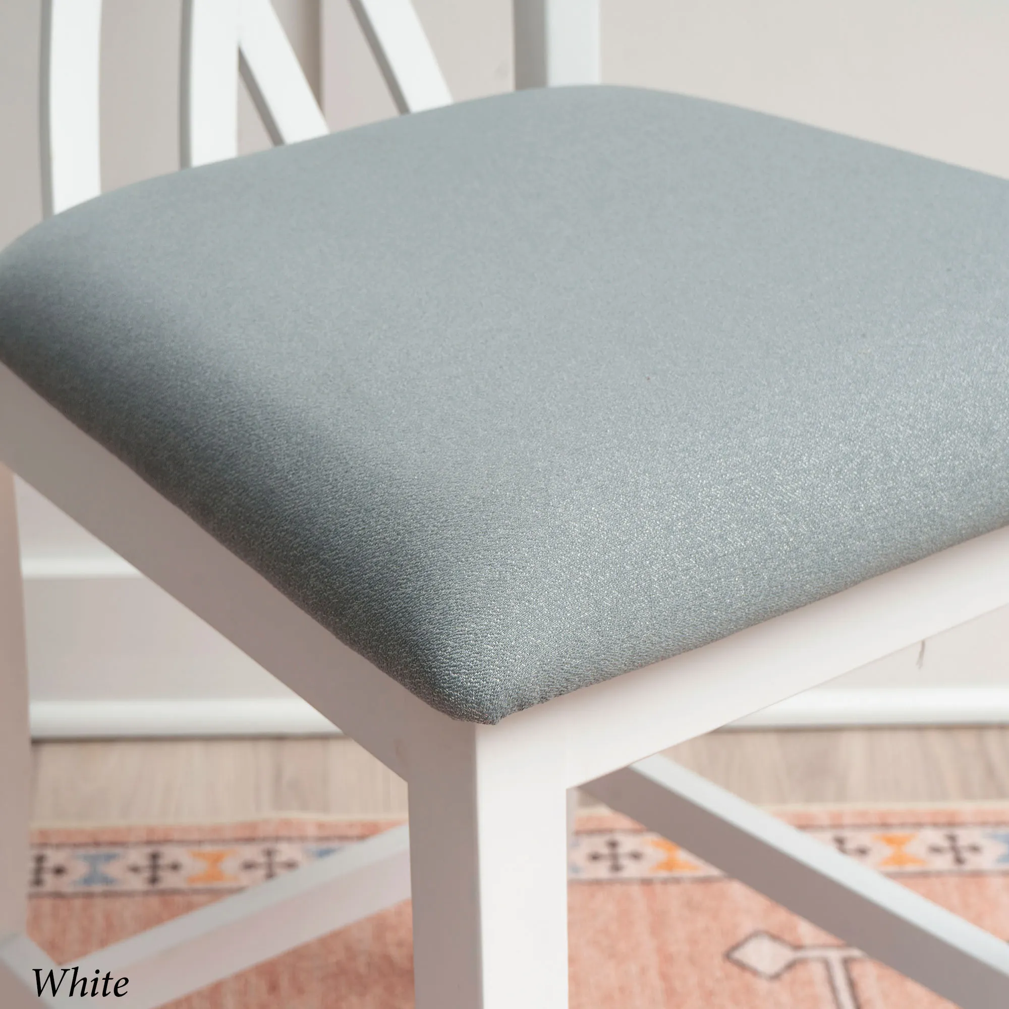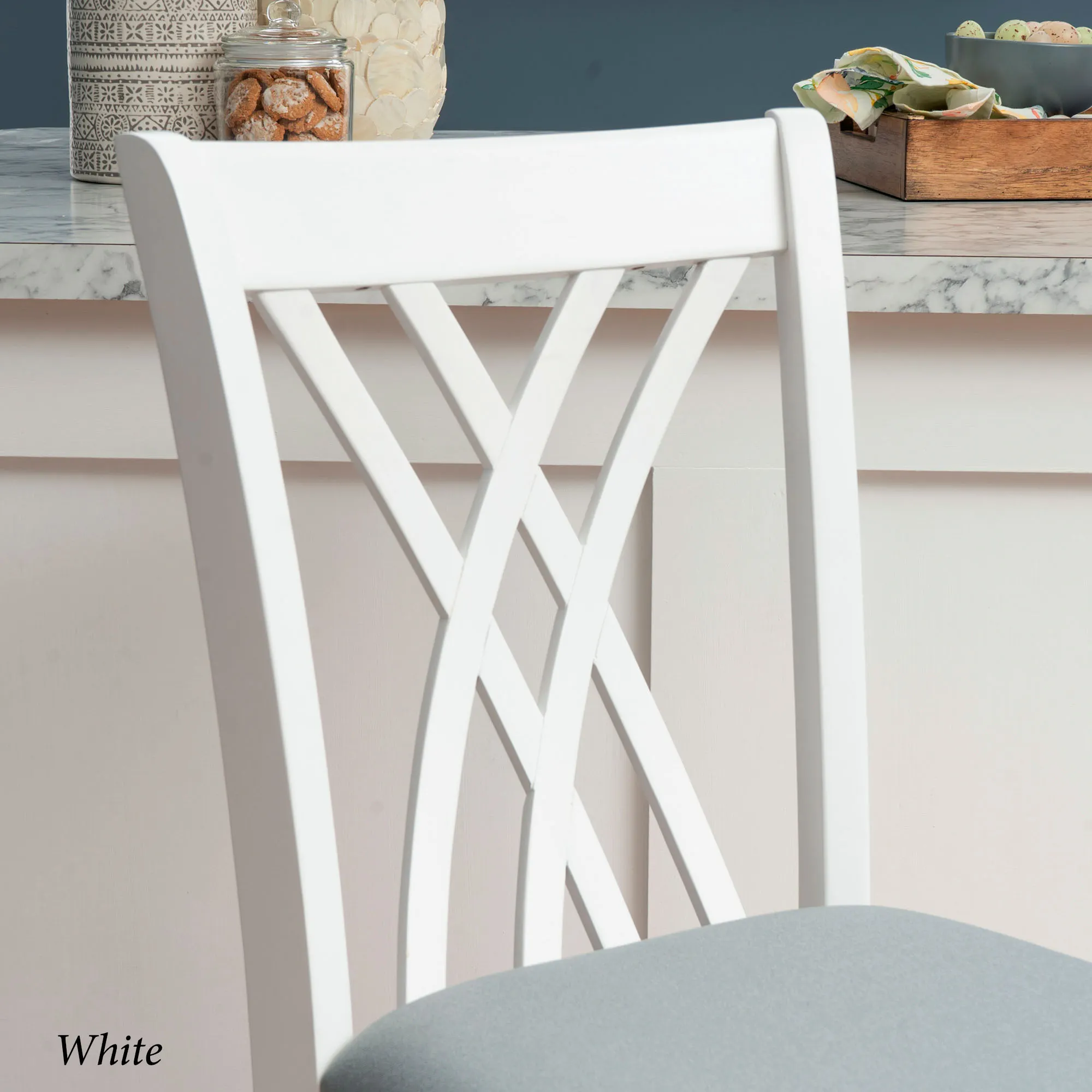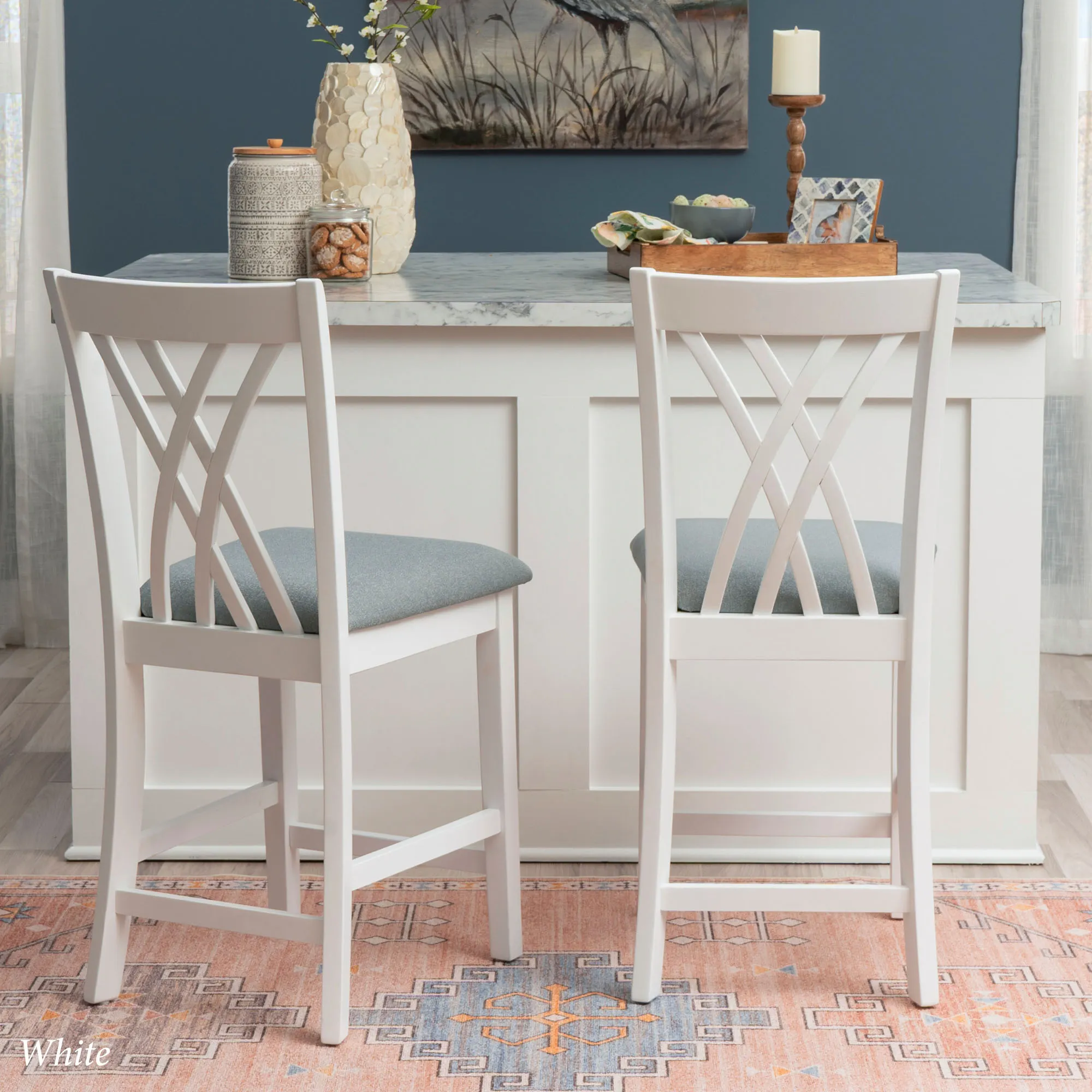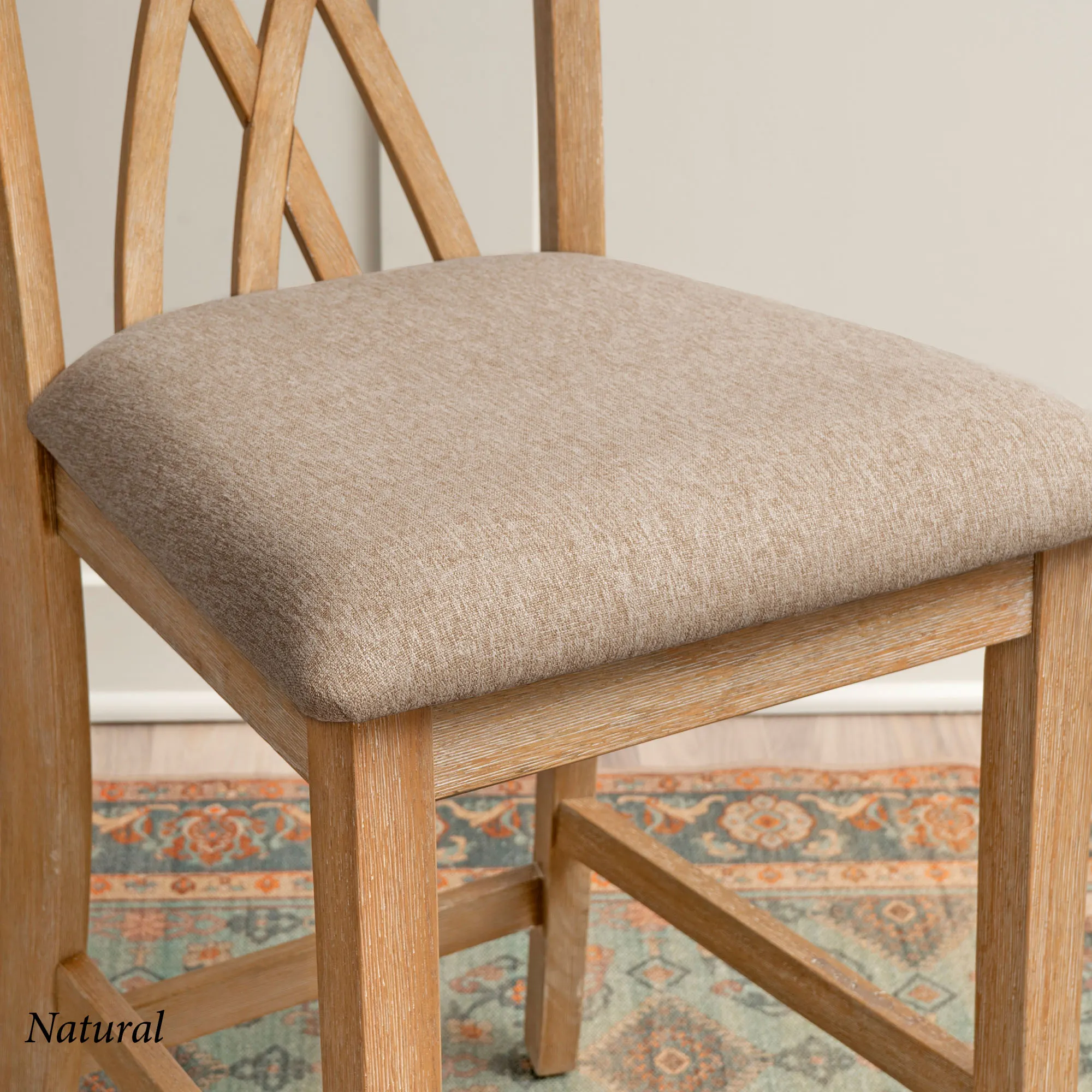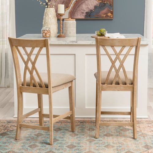 Create a classic and inviting style within your space from the Leilani Counter Stool Set. With an openwork look, the tall seat backs feature graceful crossing curves to complement the sleek lines of the wood chairs. With distressed detailing, the Natural and Natural Cherry finish options have a timeless beige upholstered foam-filled seat cushion. White has a blue shadow upholstered foam-filled seat cushion. Maximum recommended weight is 350 lbs. Seat-to-floor height is 24.5". Sold in a set of two, each counter-height chair measures 18"Wx22"Dx40.5"H. Set weighs approx. 34 lbs. Spot clean the fabric.