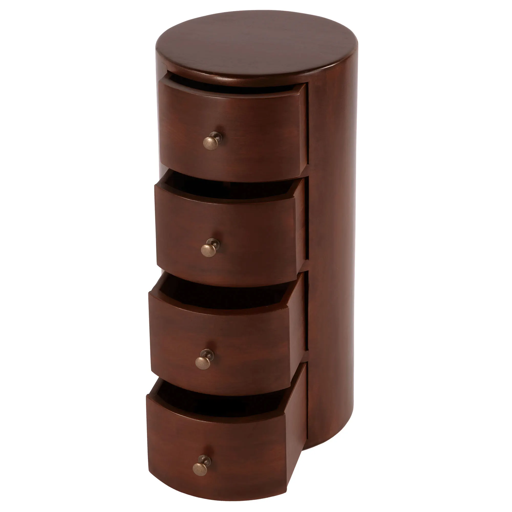 The Leland Storage Cabinet charms with a rich finish and unexpected shape. With a circular design, the solid mango wood cabinet features a luxurious dark mahogany finish and four drawers with antique brass round metal drawer pulls. Overall, the storage cabinet measures 11"dia.x23.5"H overall and weighs 11 lbs.