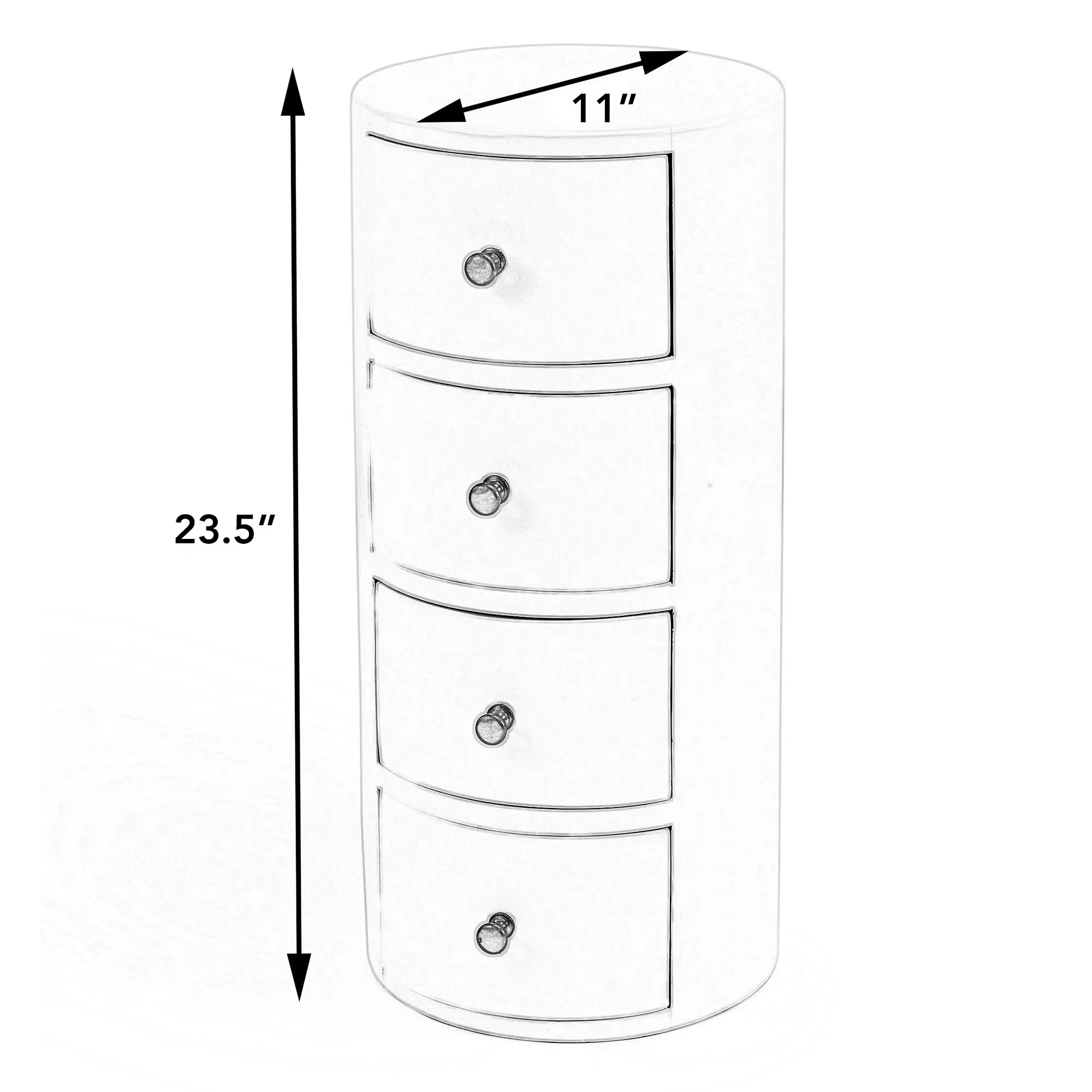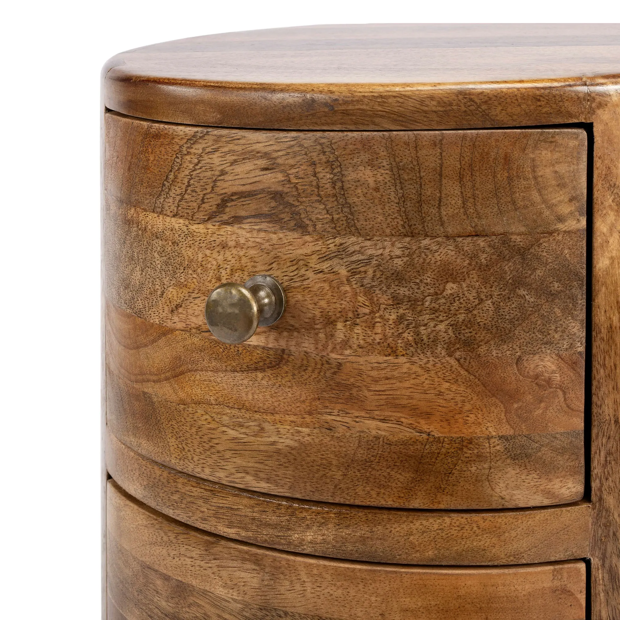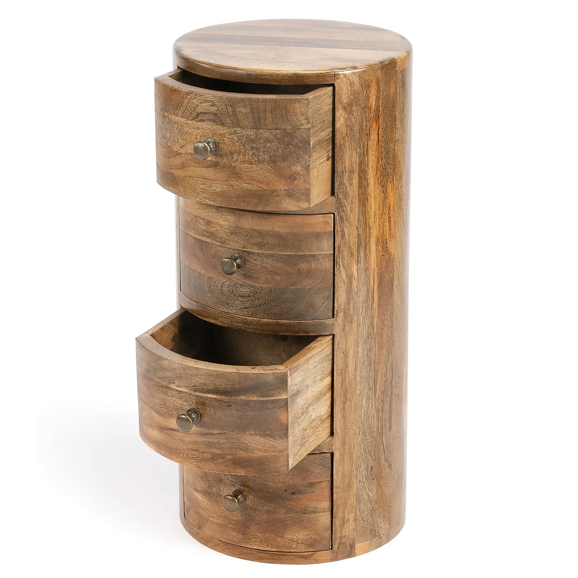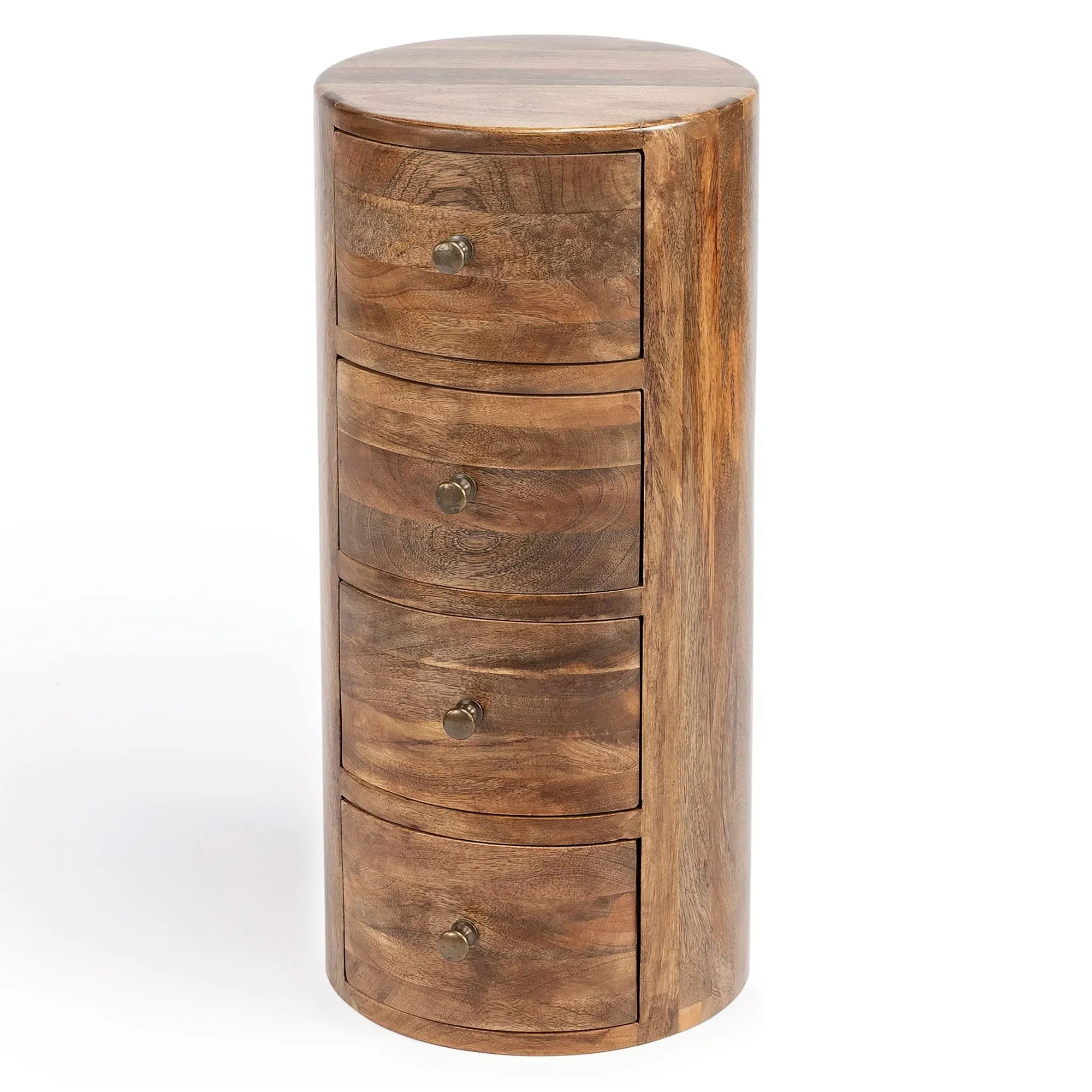 The Leland Storage Cabinet from Butler Specialty charms with a rich finish and unexpected shape. With a circular design, the solid mango wood cabinet features a luxurious natural finish and four drawers with antique brass round metal pulls. Overall, the storage cabinet measures 11"dia.x23.5"H and weighs approx. 11 lbs.