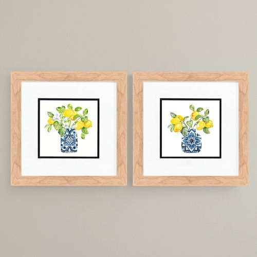 Zesty yellow fruit bouquets display the Lemon Life. Each print in this wall art set, from a watercolor original by artist Nan, features lemons and greenery in a navy and white vase on a white background. Prints are surrounded by a navy inner mat and a white outer mat. Polystyrene frames have glass inserts and a natural finish. Each measures 12"sq.x1"D. Imported/USA.