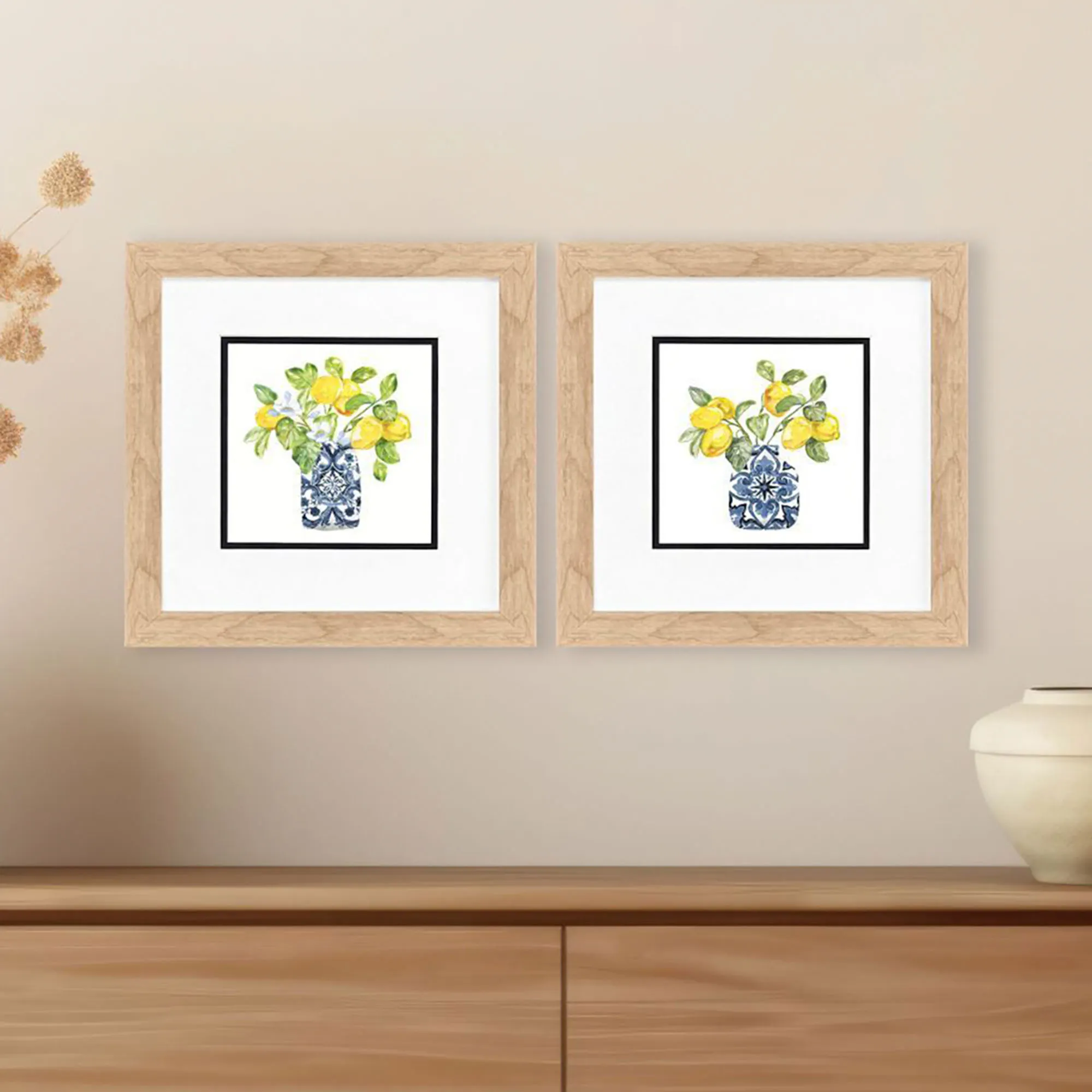 The Lemon Life Framed Wall Art Set has prints with glass inserts and polystyrene frames. Imported/USA.
