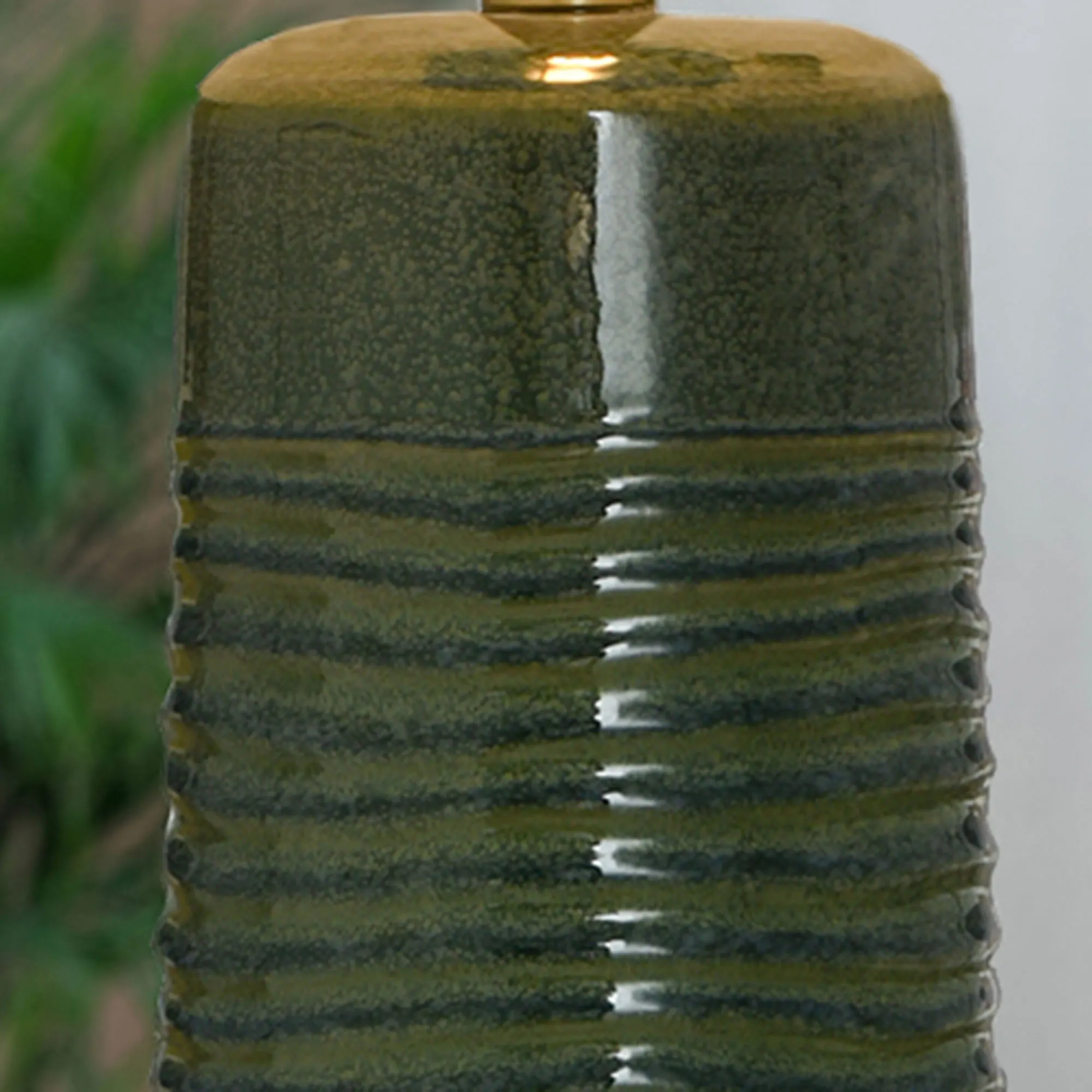 Wavy ribbed lines add textural intrigue to the Lena Table Lamp. With a brass-finished round metal base, the tall ceramic font rises in a solid color column shape with ribbed accents. A classic off-white linen empire shade and brass-finished metal orb finial complete the lamp's chic look. UL listed. Requires one 100W max. bulb that operates via a pull-chain switch. Overall, the table lamp measures 15"dia.x29.5"H.