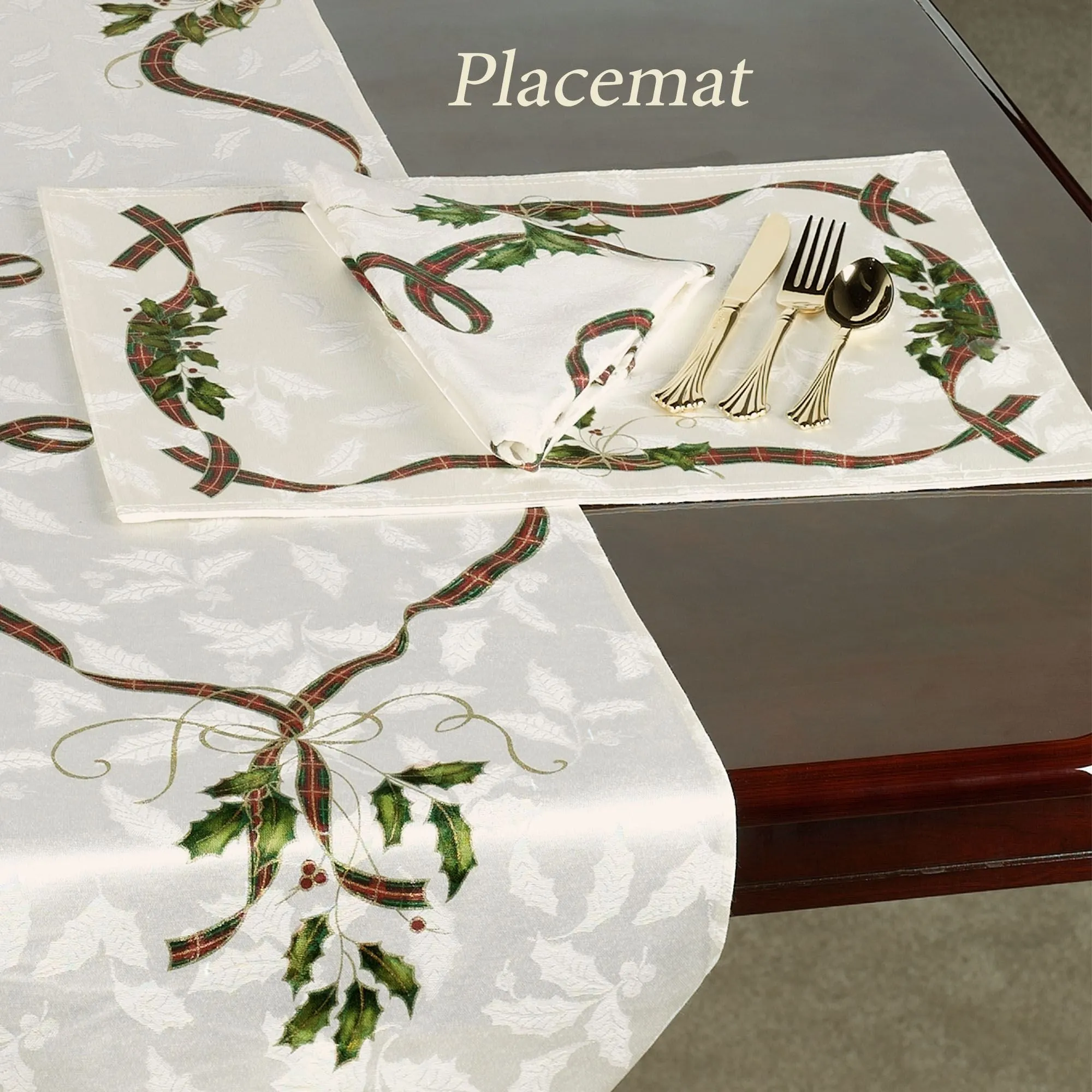 Create a festive table with the Holiday Nouveau Table Linens by Lenox(R) American by Design. Each woven jacquard, cotton/polyester piece has holly leaves, plaid and gold ribbons, and red berries on off-white. Specify Oblong Tablecloth, Table Runner, Placemat Set of 4, or Napkin Set of 4. Click on the Sizes tab for measurements. Machine washable. Imported.