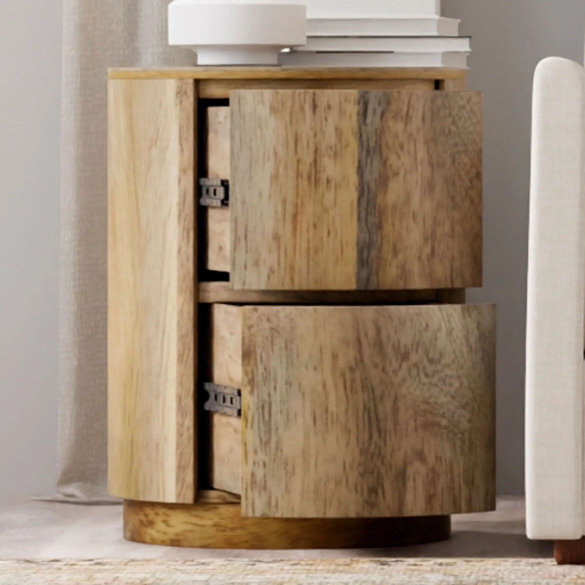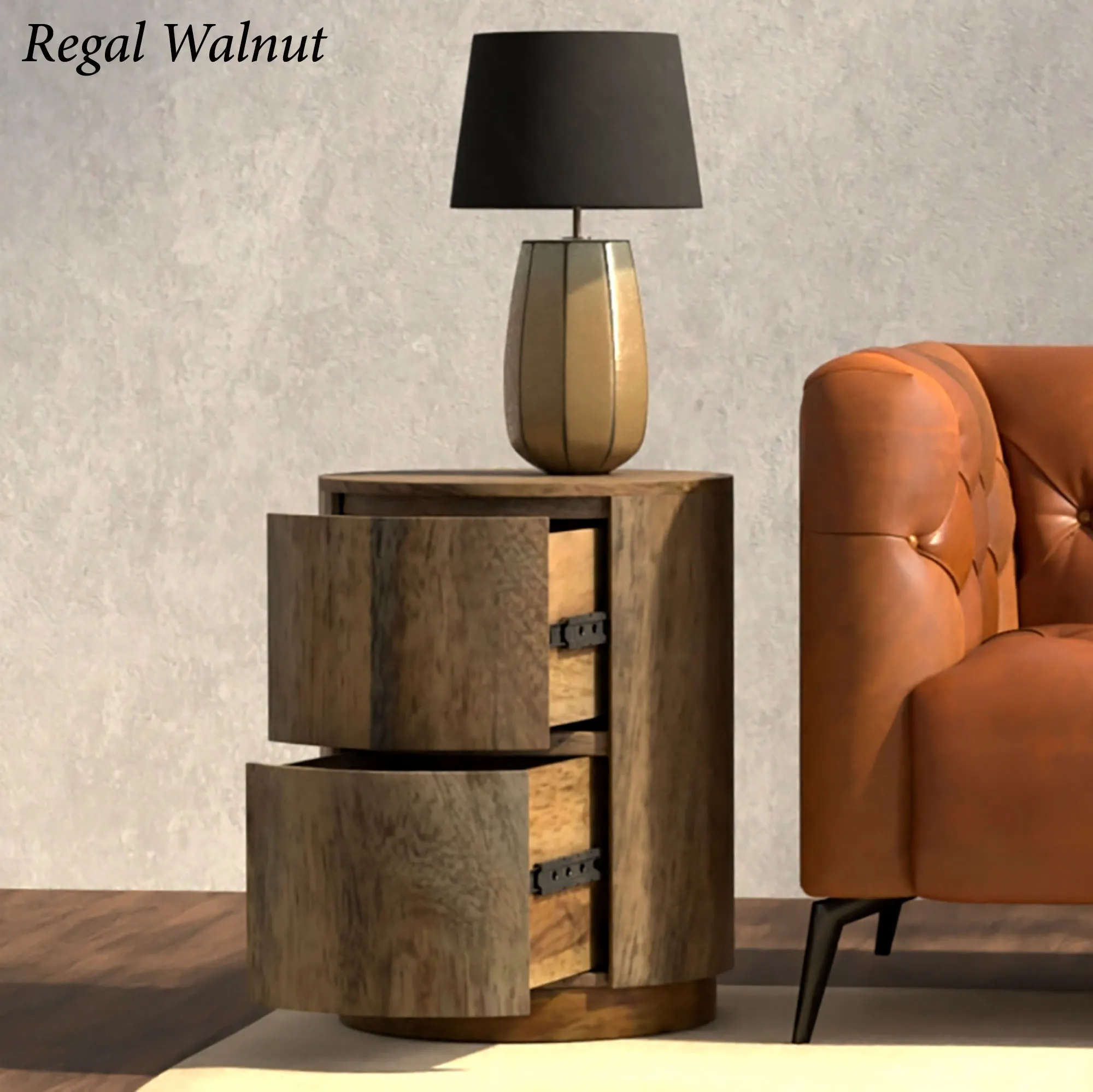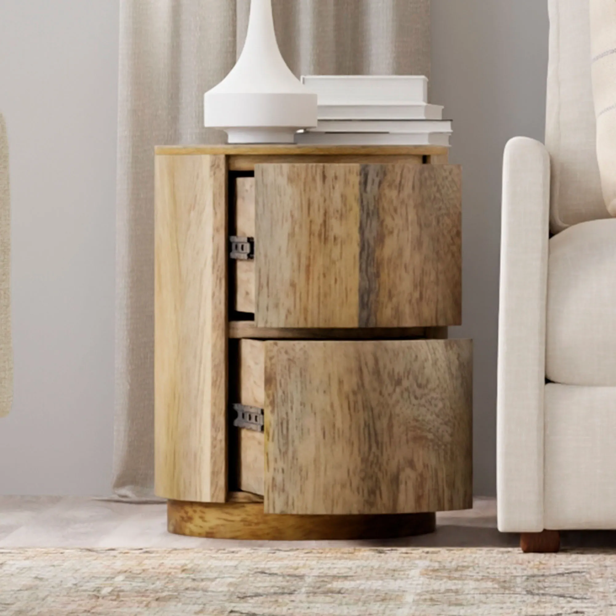 Leona Mango Wood Two Drawer Round Storage Accent Table in Natural or Regal Walnut