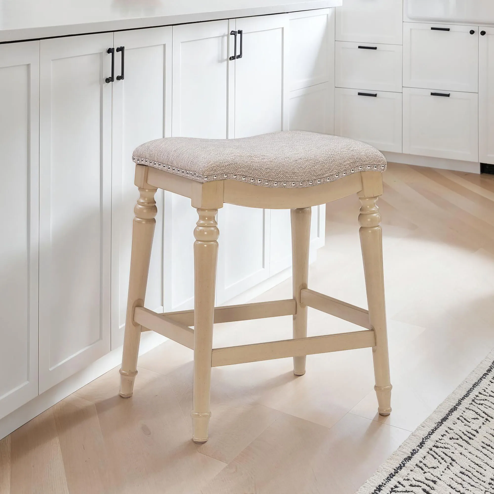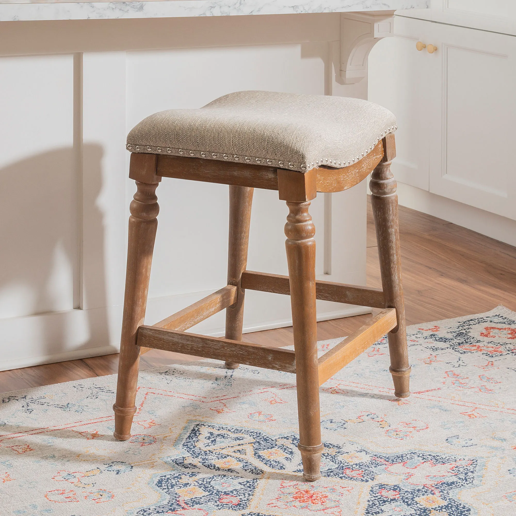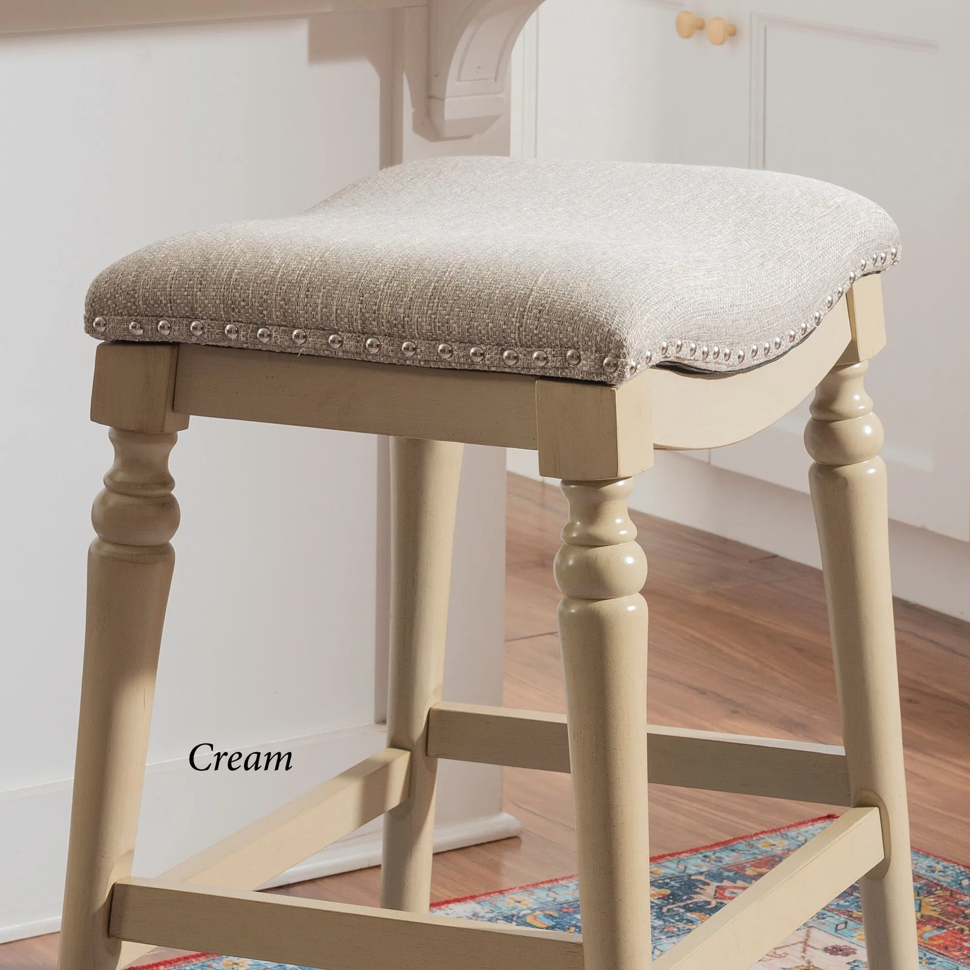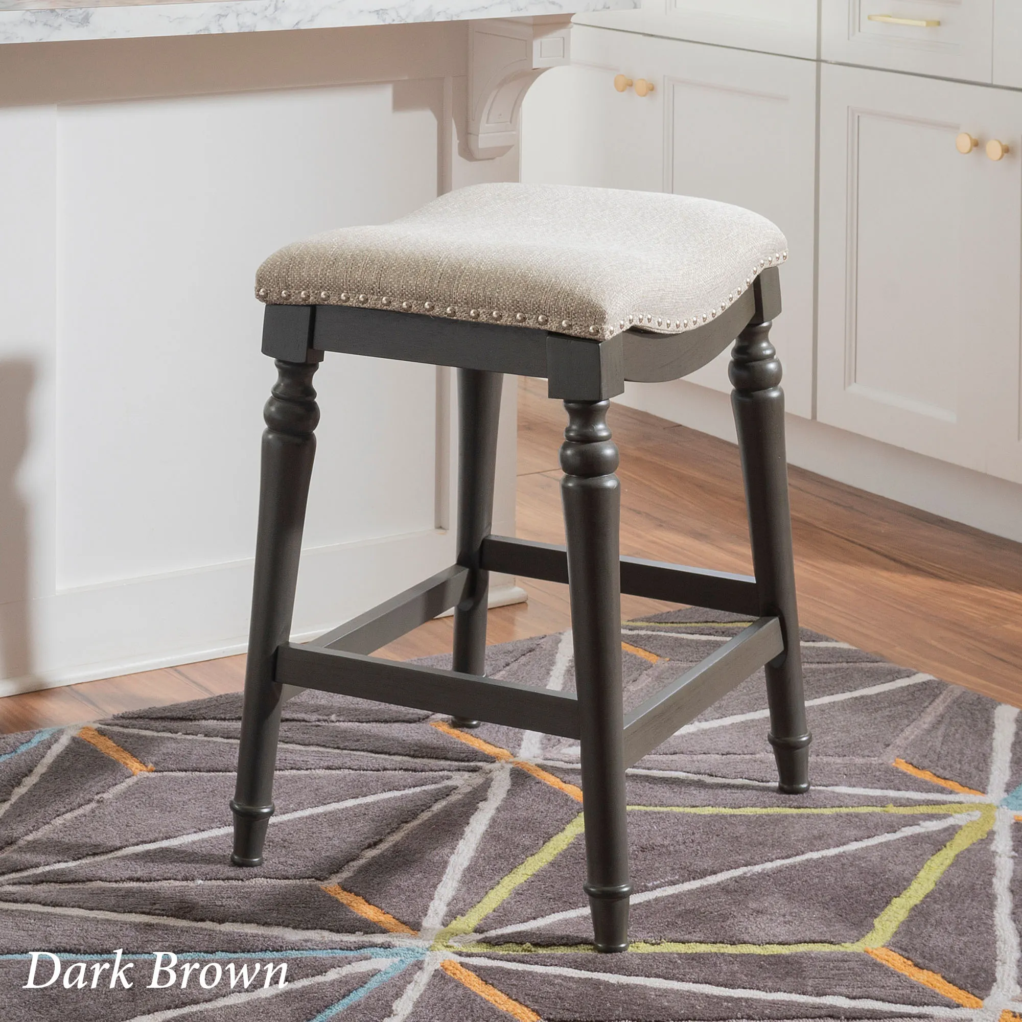 Classic detailing lends an undeniable charm to the Leroux Backless Counter Stool. With a saddle-style design, the wide, oversized seat features a foam-filled cushion, beige woven polyester/acrylic-blend upholstery, and individually placed chrome metal nailhead trim for added shine. The tapered, turned wood legs provide a beautiful base and offer two convenient footrests. Rustic Brown has a distressed finish, while the other options have a lovely painted hue. Maximum recommended weight is 400 lbs. Perfect for kitchen islands, counters, or tables measuring 35"H to 39"H, the counter-height stool measures 22"Wx17.5"Dx27"H overall and weighs approx. 16 lbs. Spot clean the fabric.
