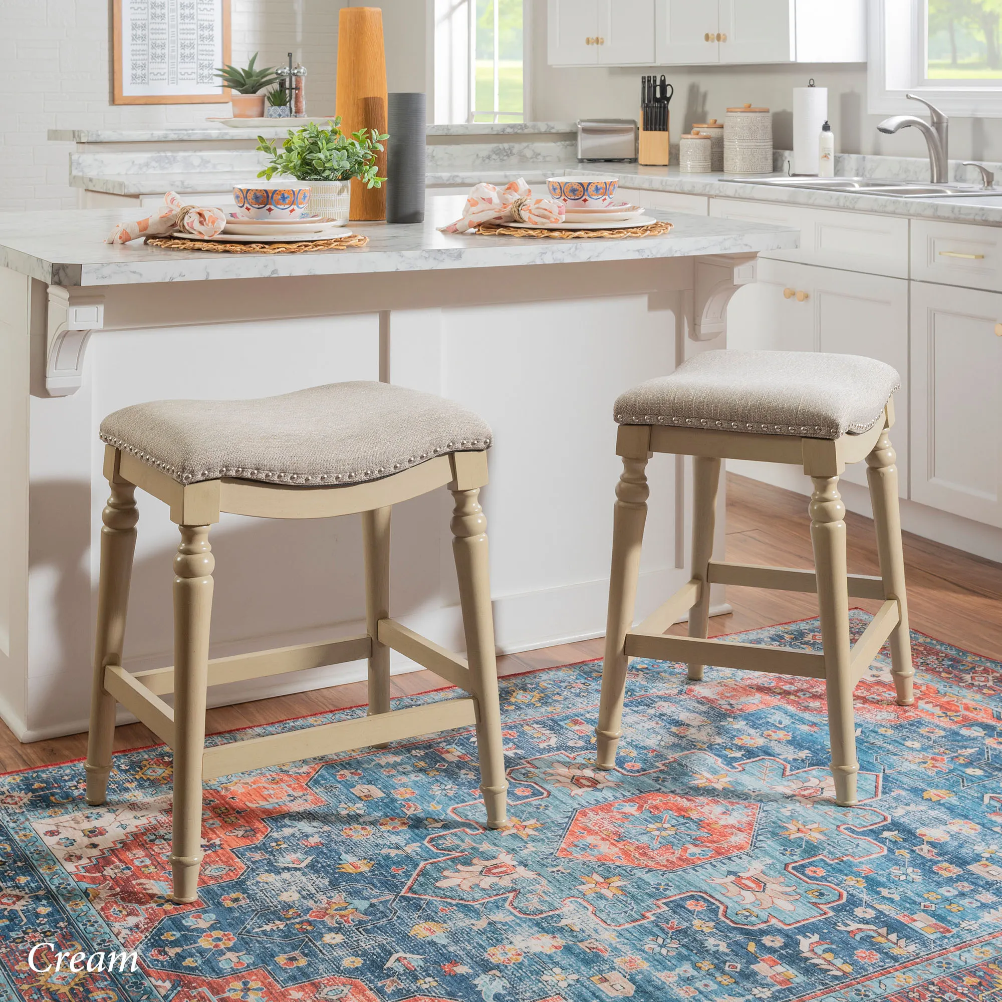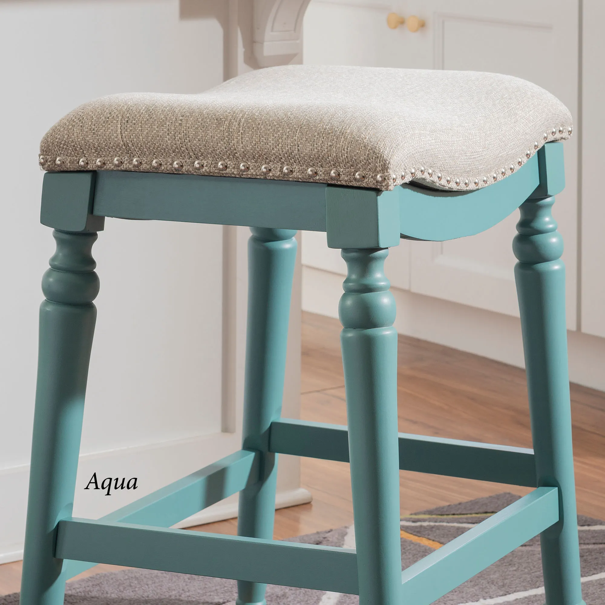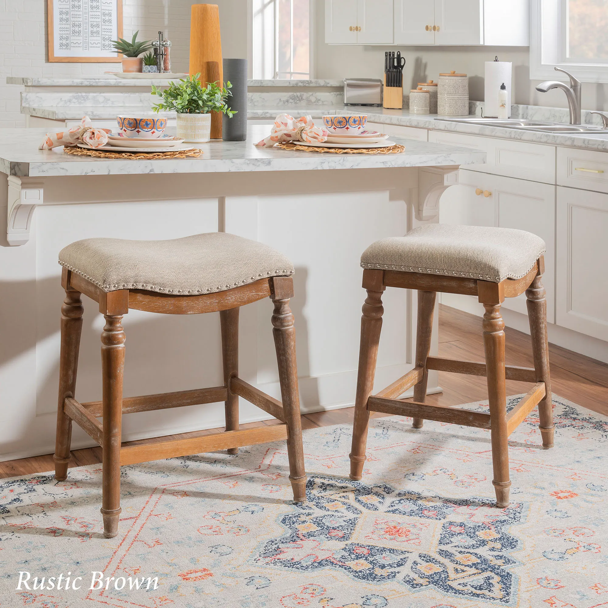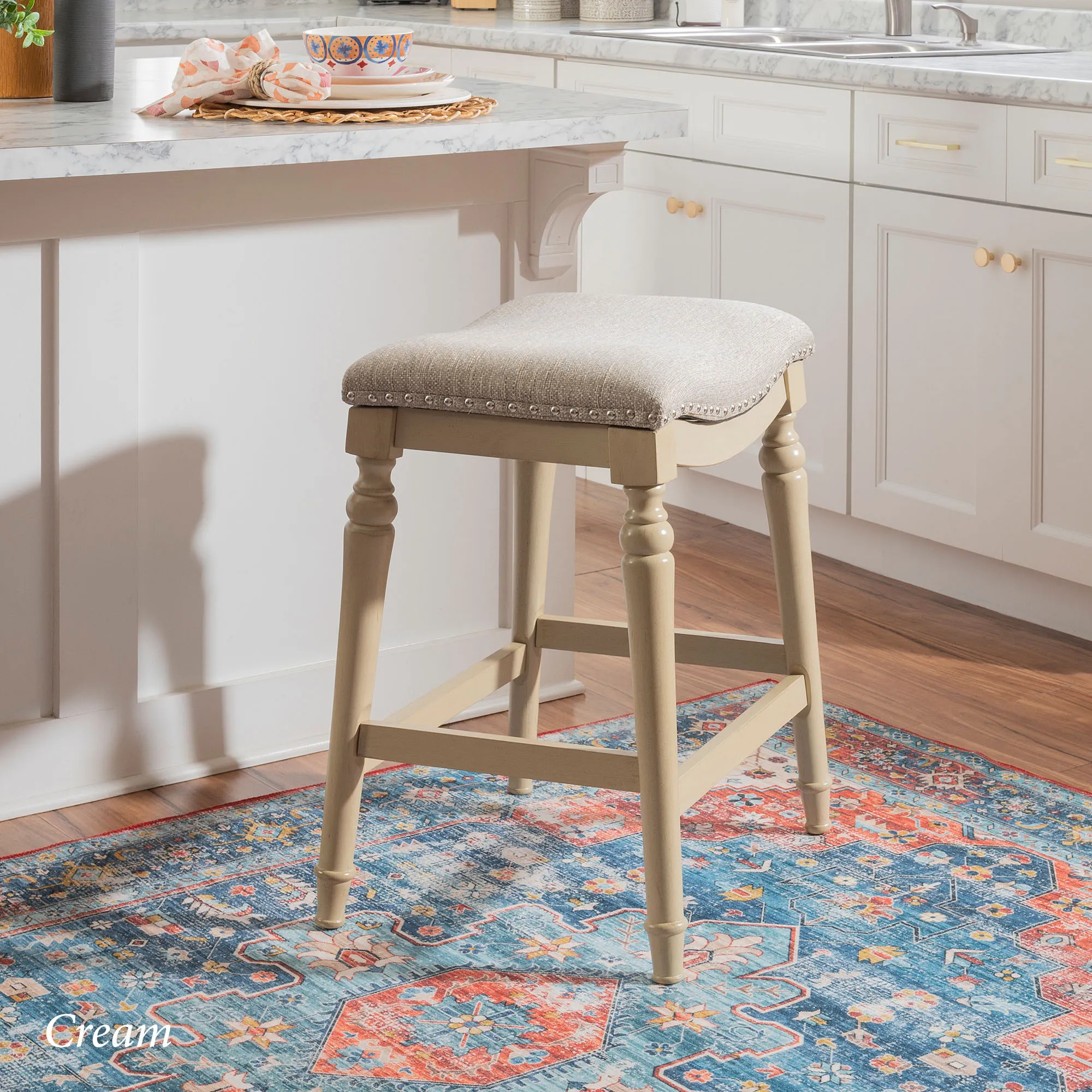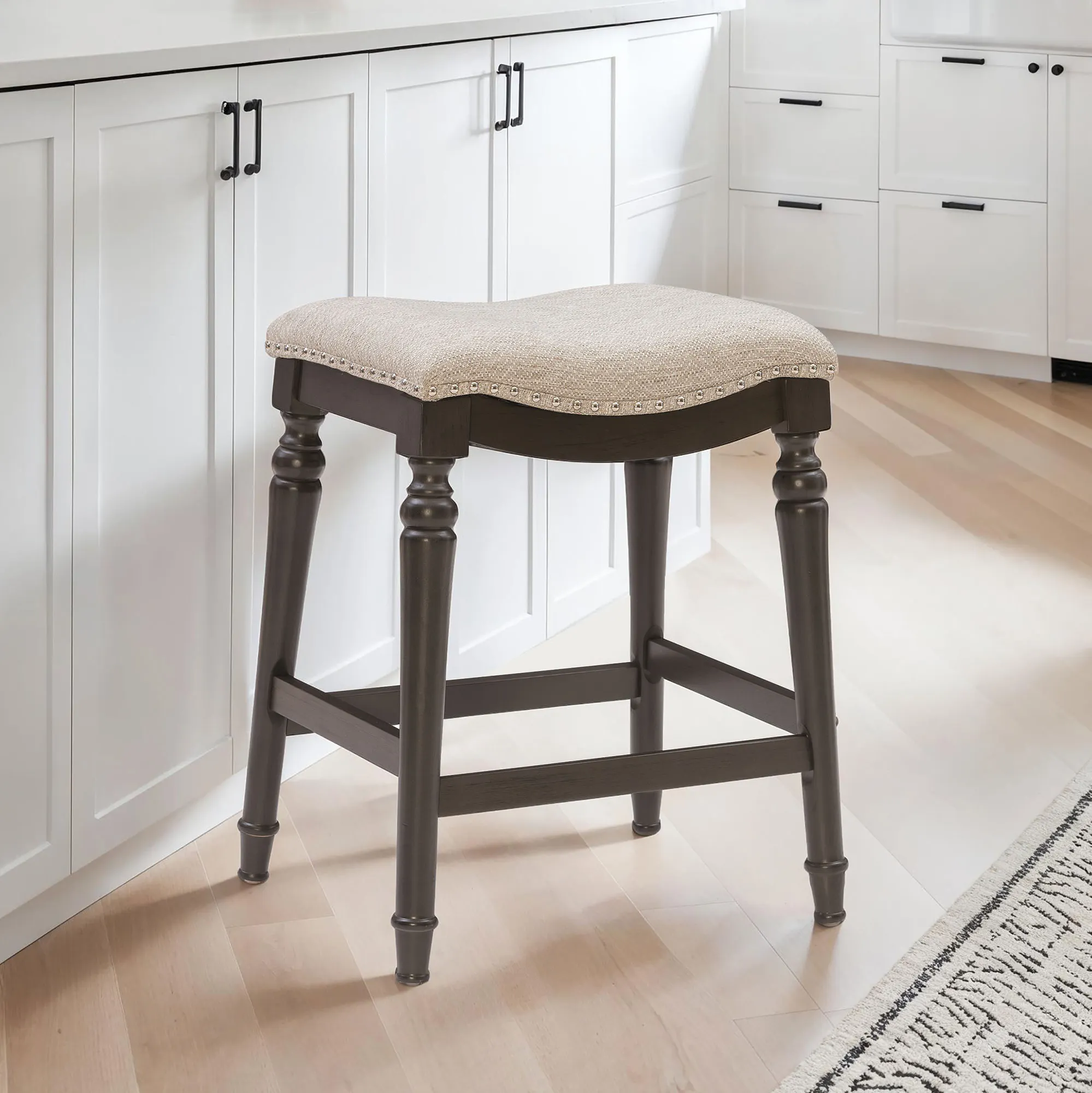 Classic detailing lends an undeniable charm to the Leroux Backless Counter Stool. With a saddle-style design, the wide, oversized seat features a foam-filled cushion, beige woven polyester/acrylic-blend upholstery, and individually placed chrome metal nailhead trim for added shine. The tapered, turned wood legs provide a beautiful base and offer two convenient footrests. Rustic Brown has a distressed finish, while the other options have a lovely painted hue. Maximum recommended weight is 400 lbs. Perfect for kitchen islands, counters, or tables measuring 35"H to 39"H, the counter-height stool measures 22"Wx17.5"Dx27"H overall and weighs approx. 16 lbs. Spot clean the fabric.