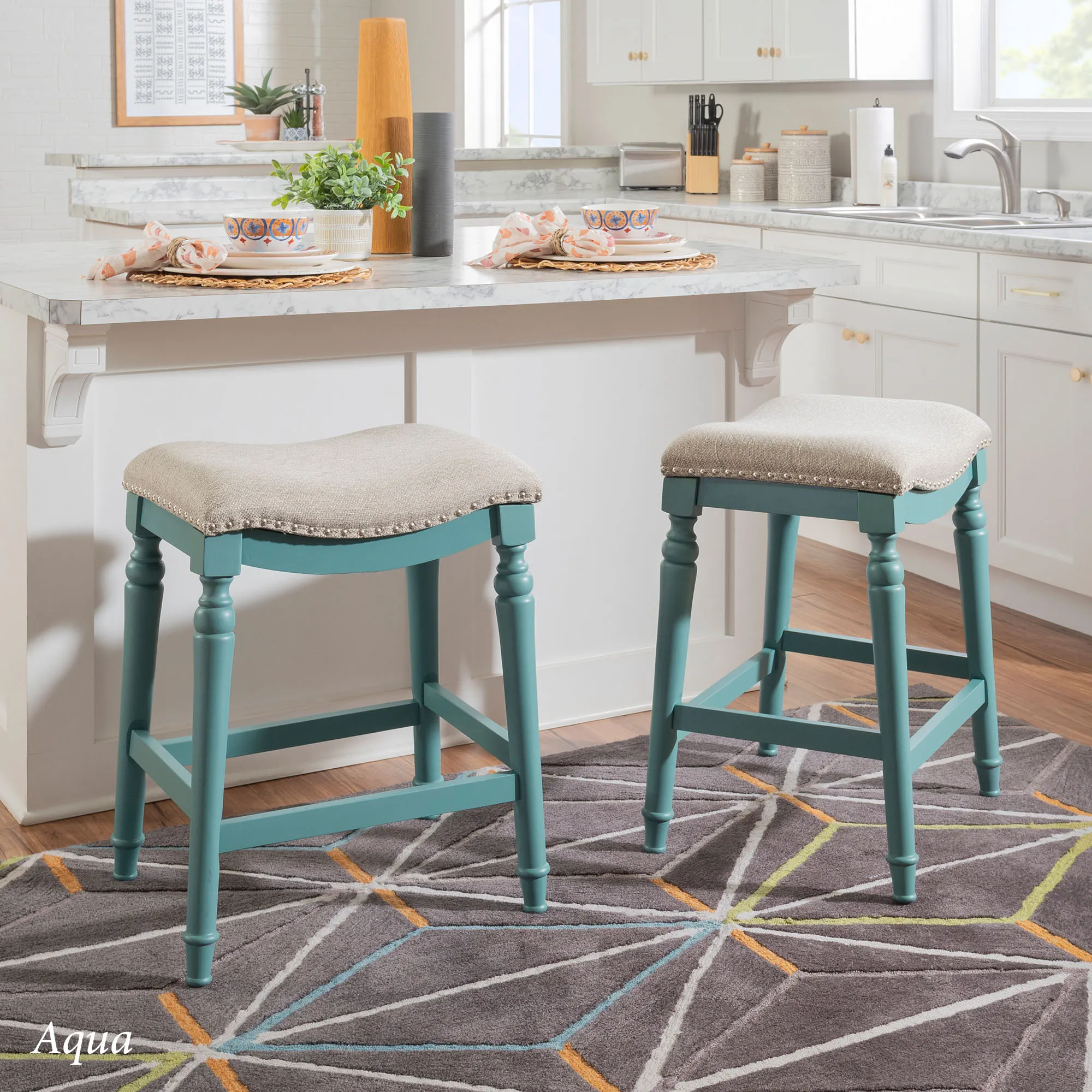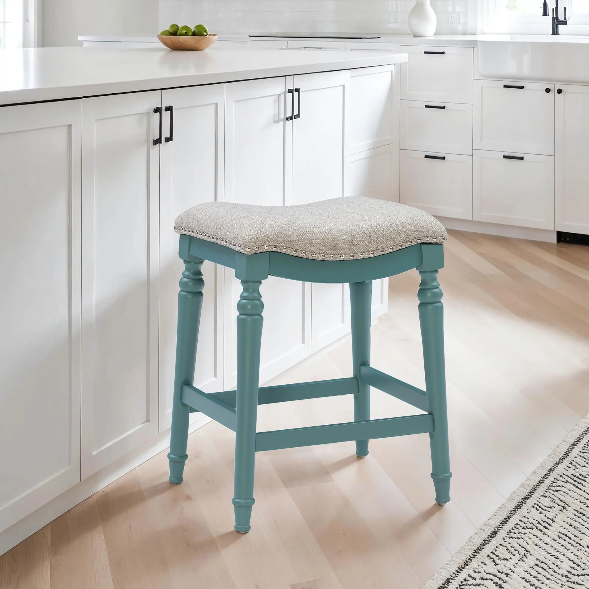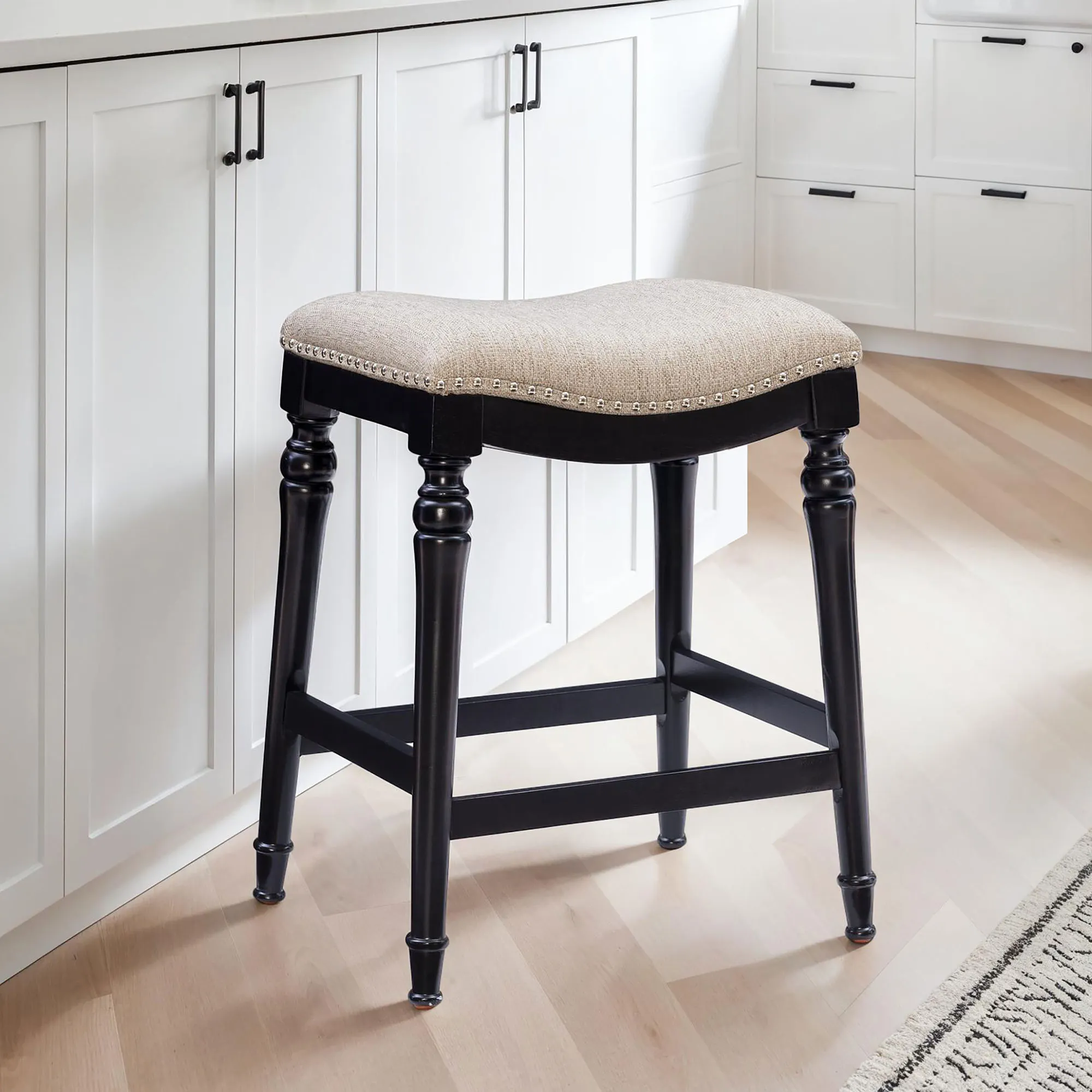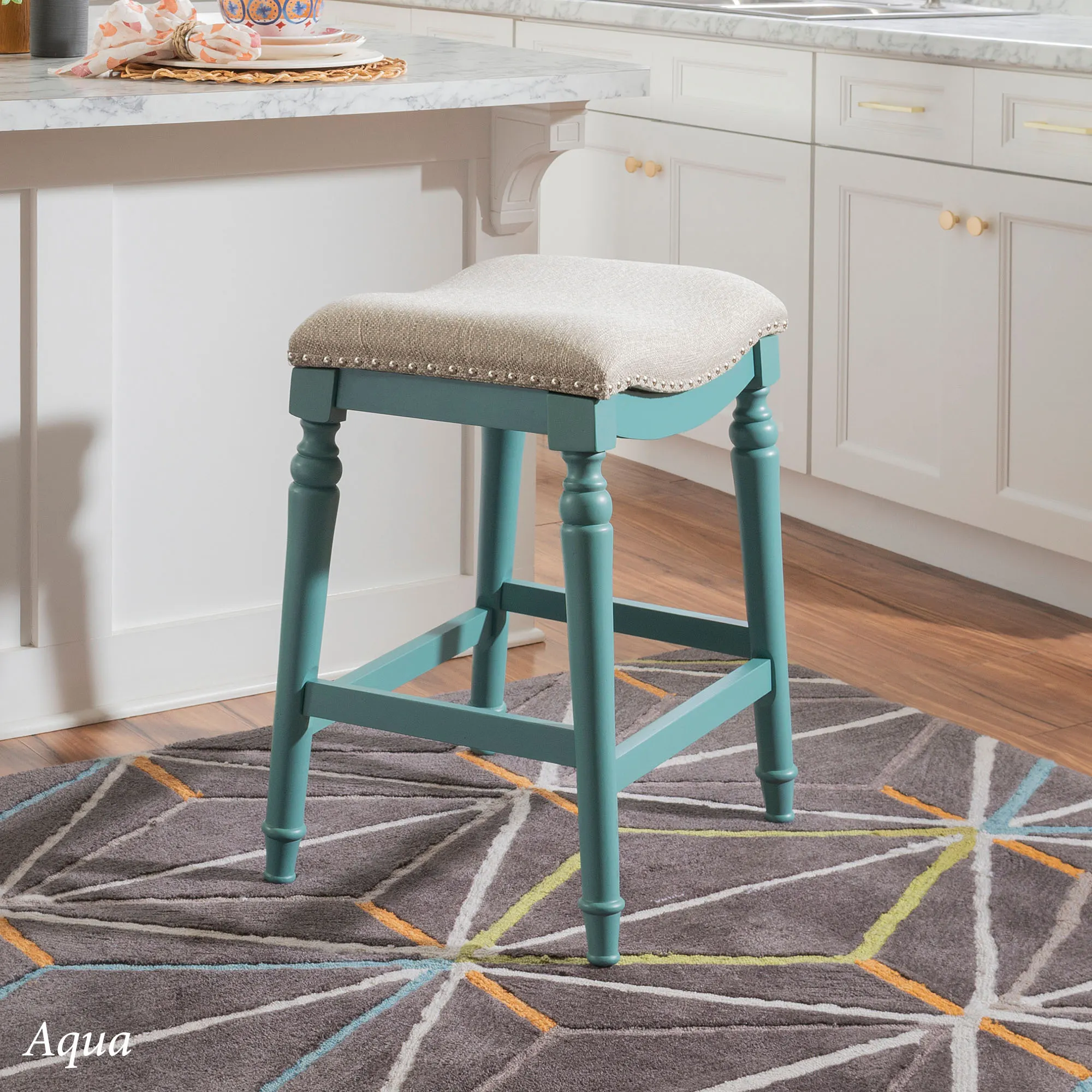 Classic detailing lends an undeniable charm to the Leroux Backless Counter Stool. With a saddle-style design, the wide, oversized seat features a foam-filled cushion, beige woven polyester/acrylic-blend upholstery, and individually placed chrome metal nailhead trim for added shine. The tapered, turned wood legs provide a beautiful base and offer two convenient footrests. Rustic Brown has a distressed finish, while the other options have a lovely painted hue. Maximum recommended weight is 400 lbs. Perfect for kitchen islands, counters, or tables measuring 35"H to 39"H, the counter-height stool measures 22"Wx17.5"Dx27"H overall and weighs approx. 16 lbs. Spot clean the fabric.