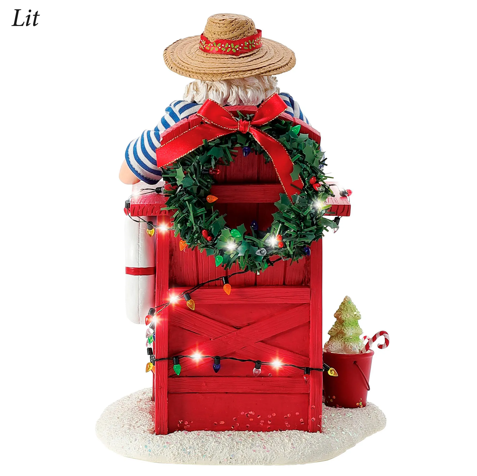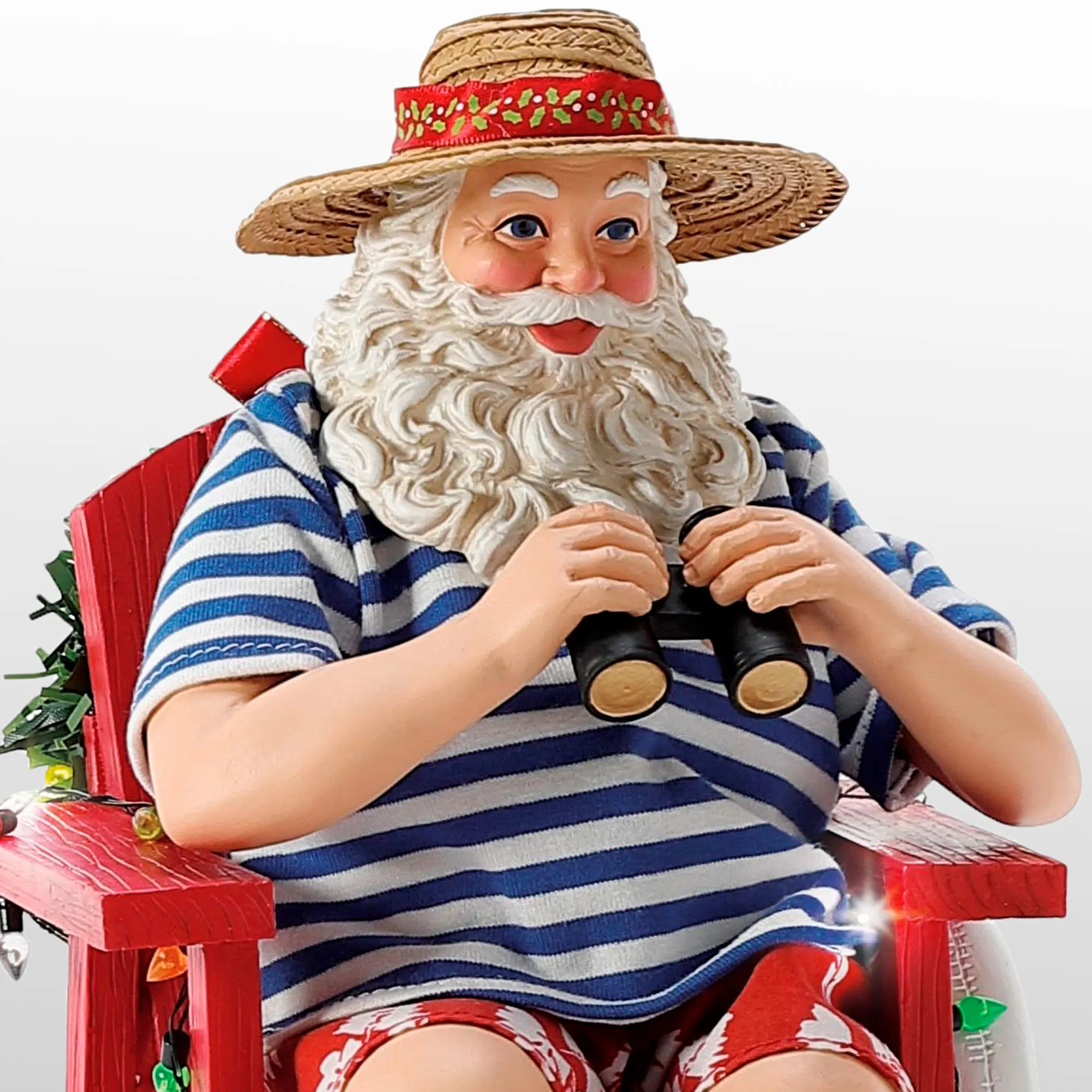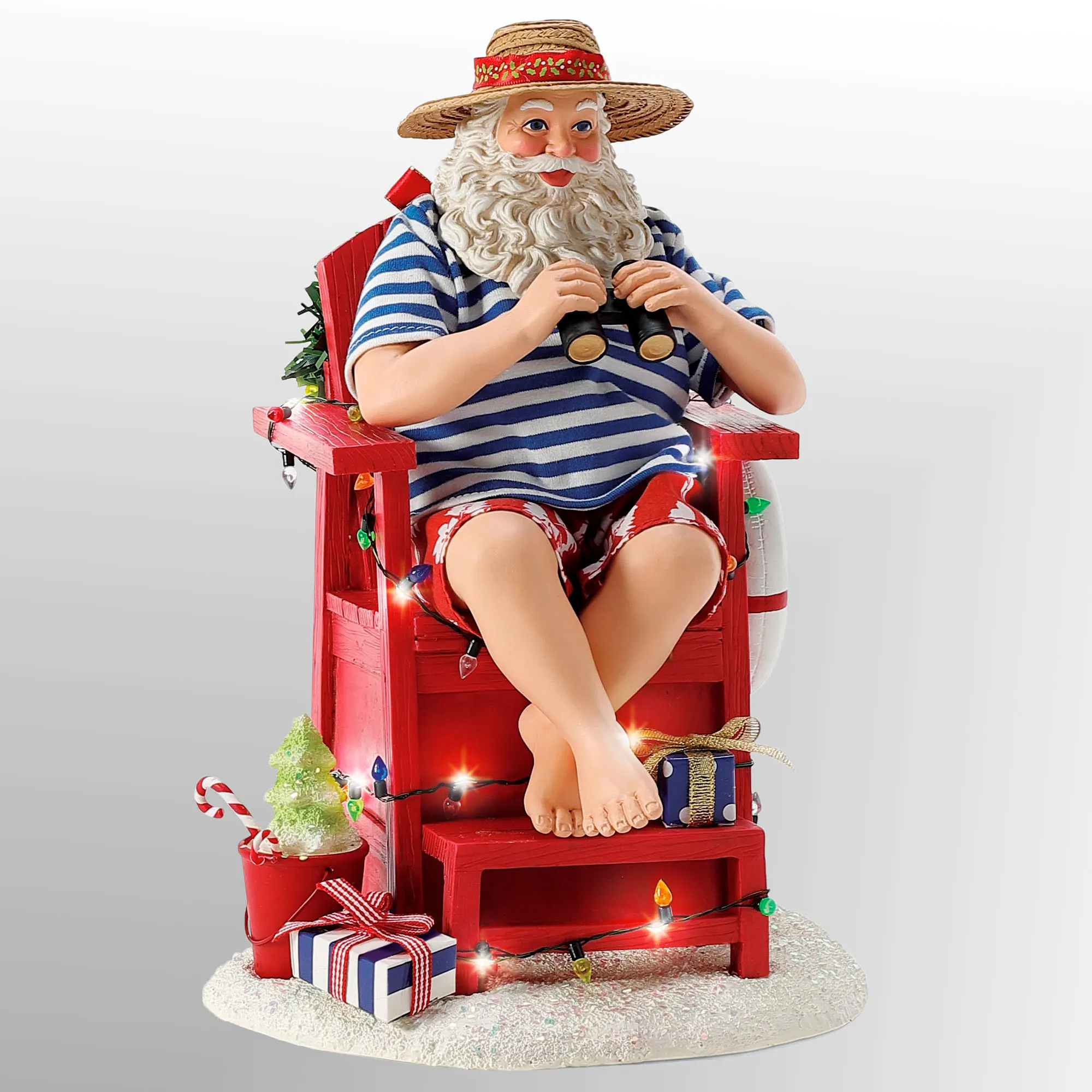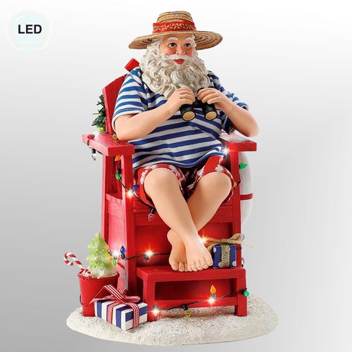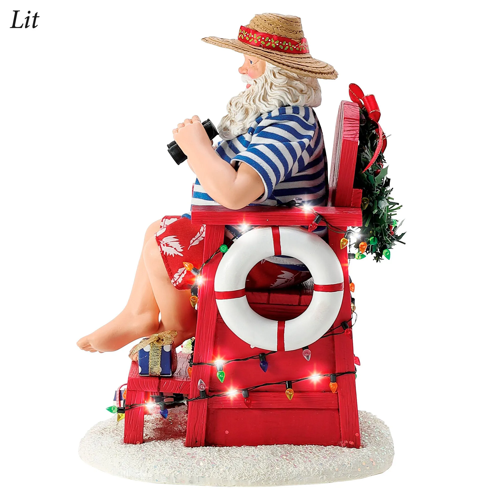 Santa always volunteers to Lifeguard at the beach during the summer break. Wearing a straw hat, blue striped shirt, and red Hawaiian shorts, Santa holds binoculars and sits in a red lifeguard chair with a life preserver and wreath decoration. Colorful faux lights and LED fairy lights are wrapped around the chair. A green Christmas tree sand sculpture fills the red pail that sits on the glittered sand base. Requires three of your AAA batteries and operates from an on/off switch on the bottom. Designed by Ann Dezendorf, the finely detailed Possible Dreams(R) Santa is dressed in a hand-sewn polyester Clothtique(R) costume, which is specially stiffened to add realism. The handpainted resin face expresses the sincere emotion prized by collectors. Measures 7.5"Wx8"Dx10.5"H overall. Imported.