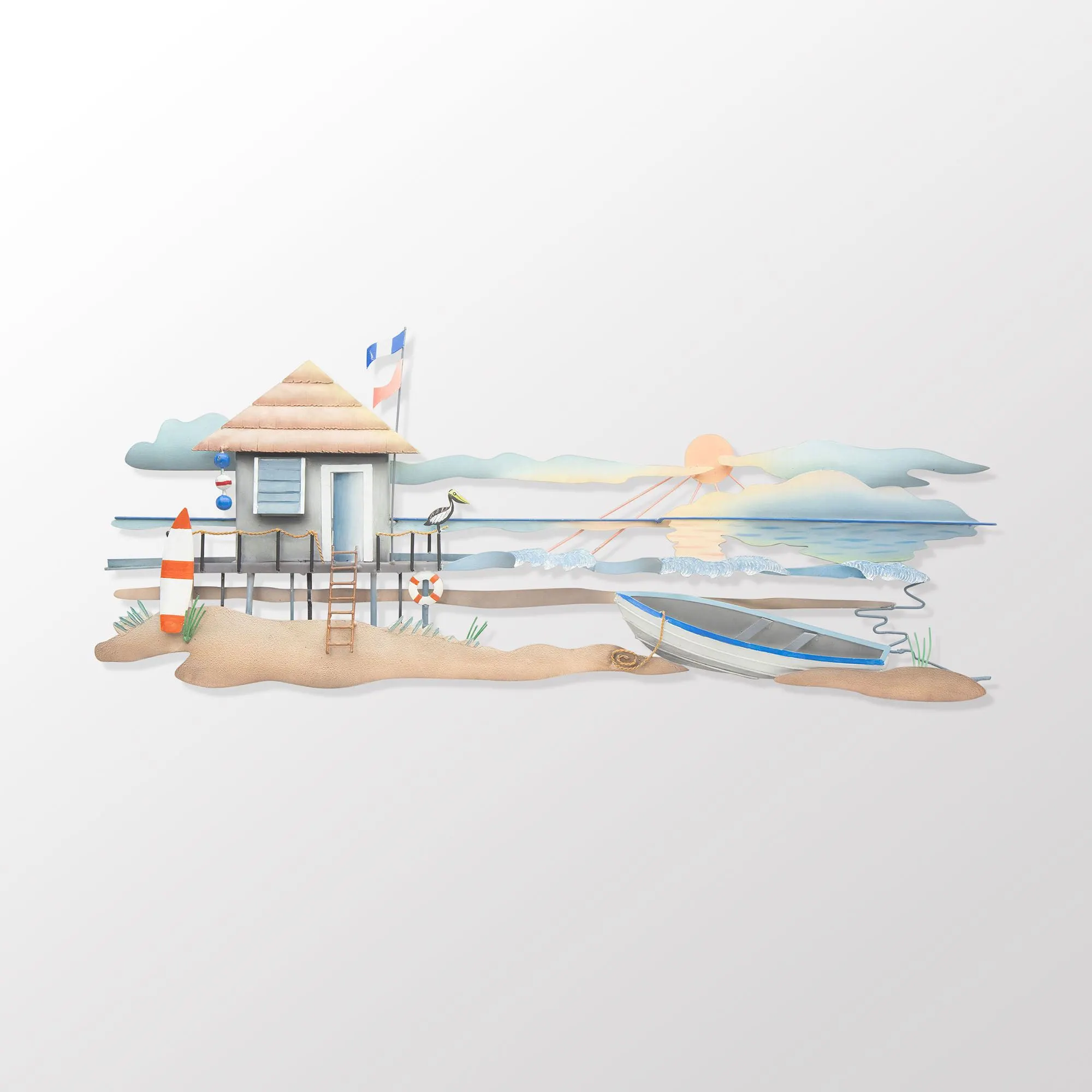 When the sun rises on Lifeguard Station Beach, everyone knows the perfect seaside day is ahead. Designed by Joanne Ferrara, the handcrafted metal wall sculpture features the sun peeking over the horizon to see the crashing surf and a charming lifeguard hut and boat along the shore. Handpainted shades of muted natural hues add life to the design. Perfect for your indoor space, covered porch, or enclosed patio, the beach wall art measures 46"Wx2.5"Dx19"H.