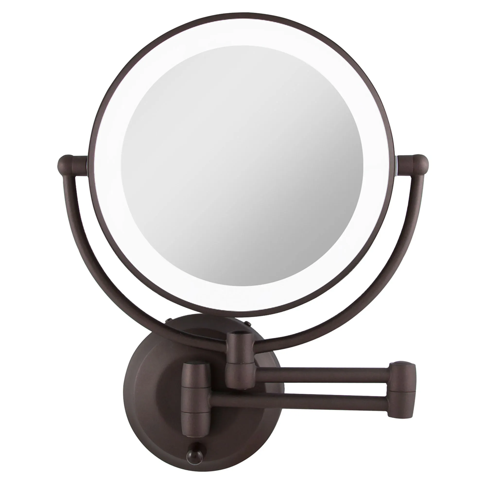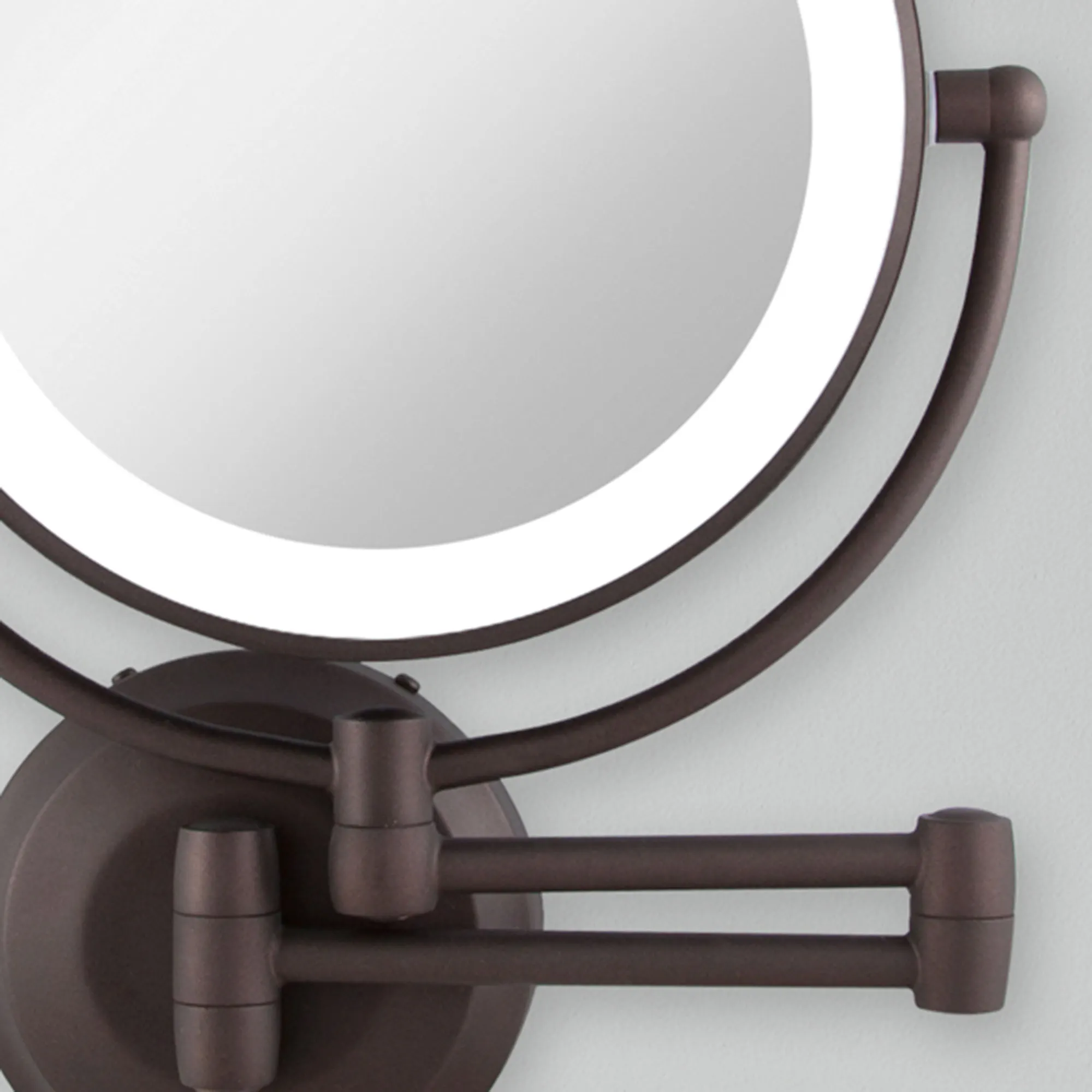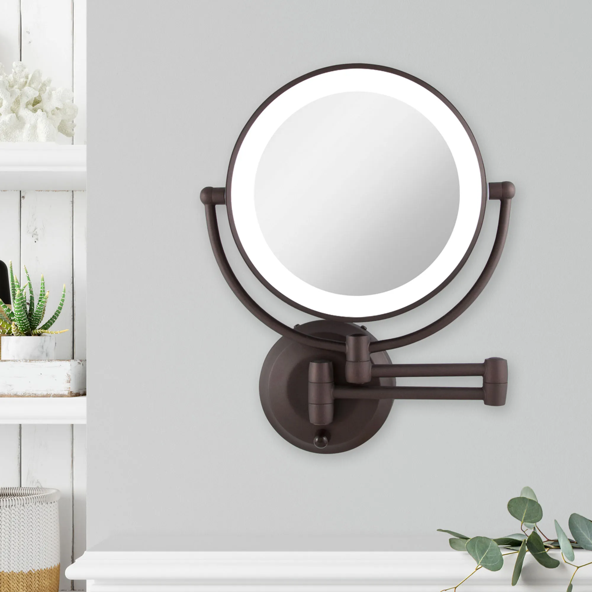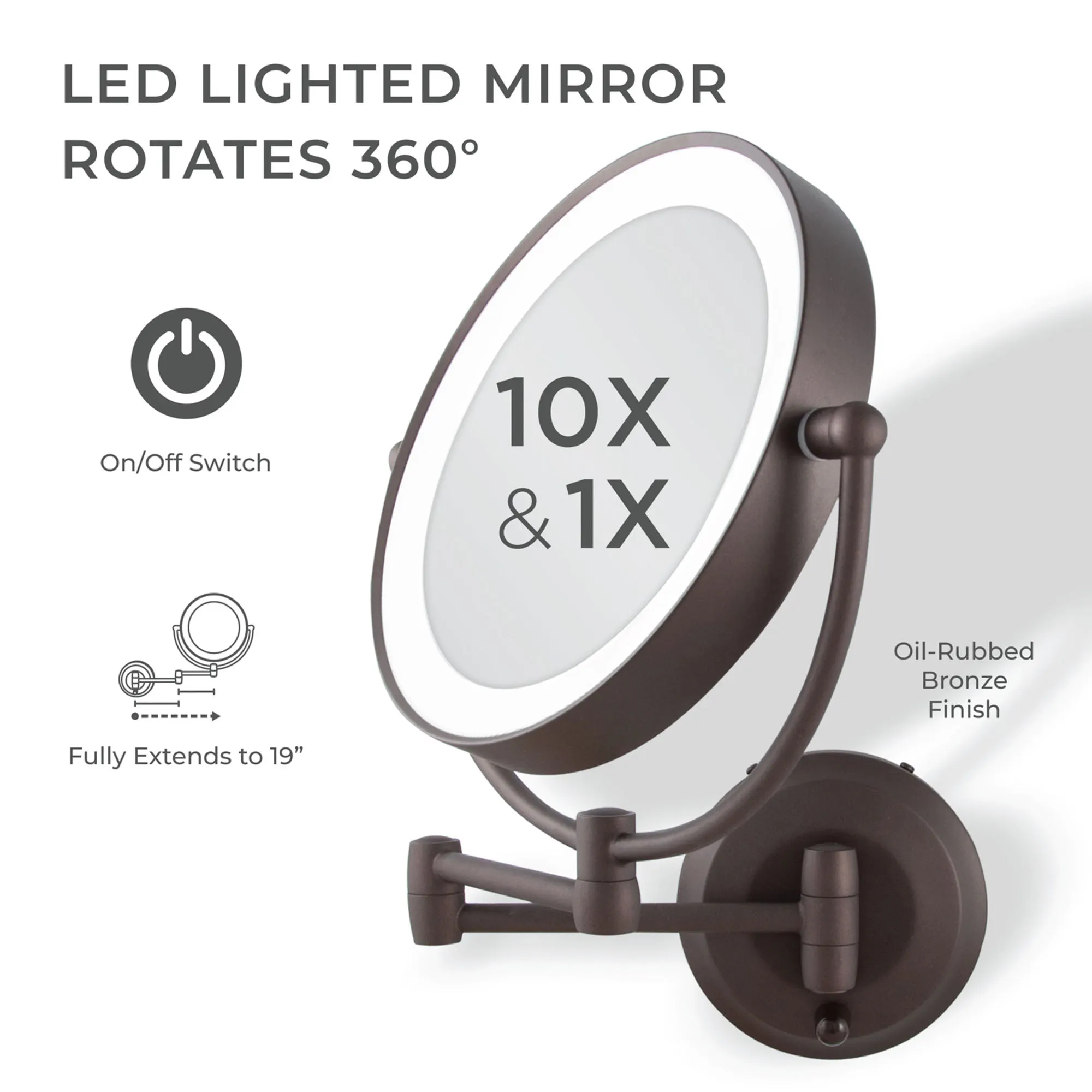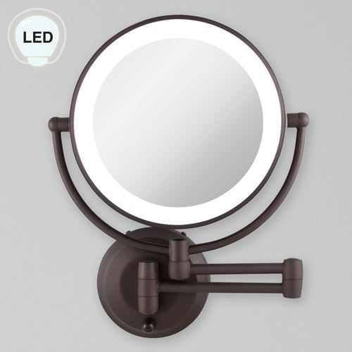 Perfect in any bath or dressing area, the Oil-Rubbed Bronze Lighted Extendable Wall Vanity Mirror helps meet all beauty needs. This lighted, wall-mounted mirror has 1x or 10x magnification and an oil-rubbed bronze-finished metal, 12" extending arm that allows you to bring the glass mirror right where you need it most. The mirror swivels and pivots 360 degrees and is lit with an LED ring light. Use your four C batteries for a cordless option or use the included AC wall plug adapter. Wall vanity mirror fully extends 19". Measures 11"Wx3"Dx14.5"H.