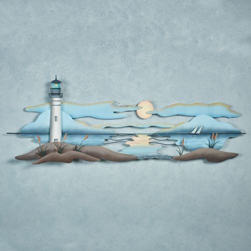 The Lighthouse Scene Wall Art calls seafaring hearts home. Designed by artist Joanne Ferrara, this handcrafted metal wall sculpture features a coastline horizon with sand dunes, sea oats, a lighthouse, and blue clouds low above the calm sea. Handpainted natural shades bring the coastal design to life. Perfect for your indoor space, covered porch, or enclosed patio, the lighthouse wall art measures 48"Wx4.5"Dx17"H.