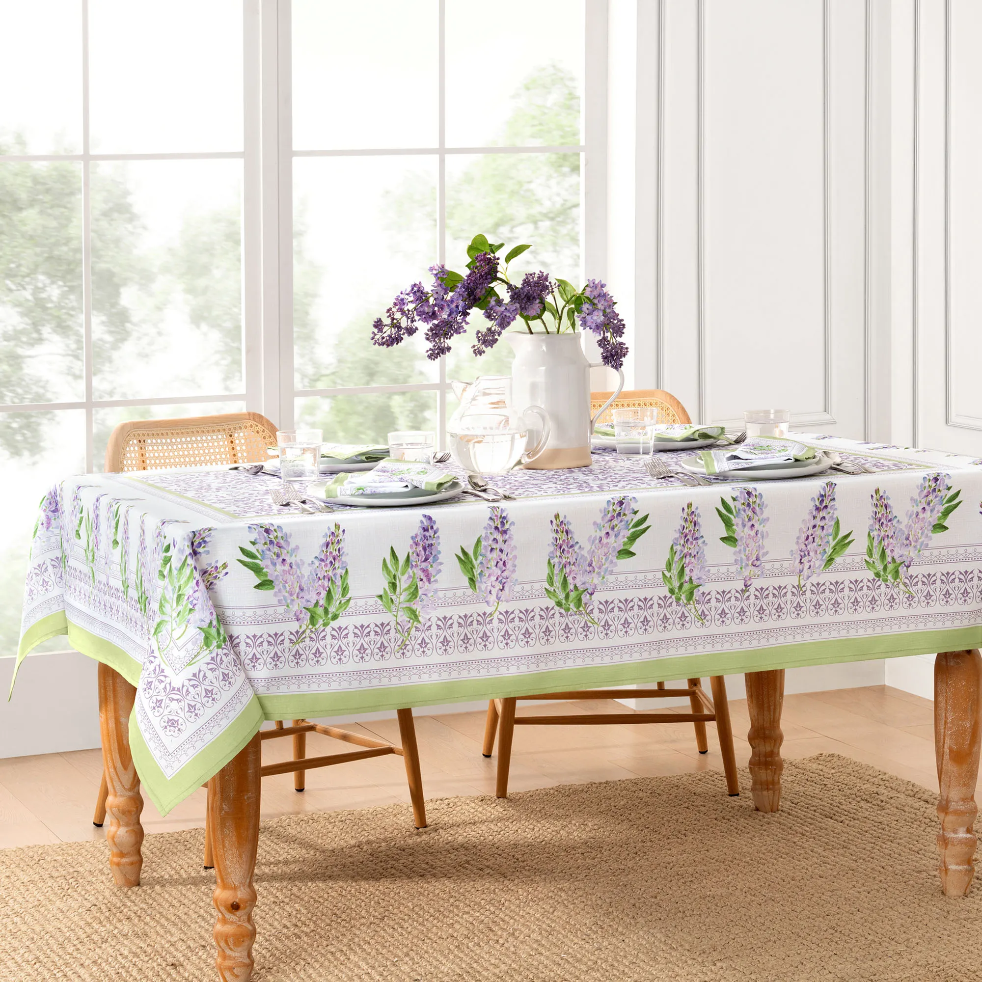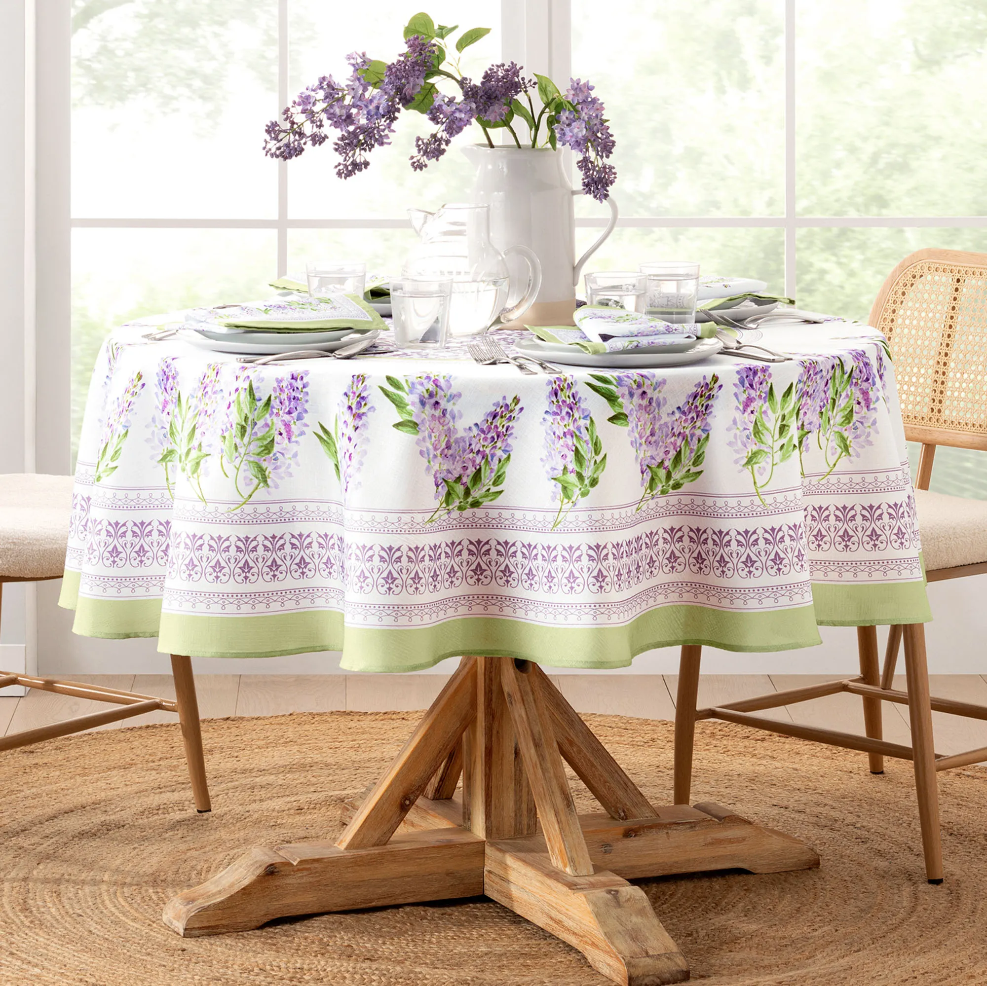 The Lilac Bloom Floral Table Linens combine chic elegance and splendid springtime sights. Framed in pale sage green, each tailored white polyester table accent features beautiful printed watercolor-style lilac flowers, green leaves, and ornate ivy and lace-inspired scrollwork borders. The charming frames also decorate the center of the Tablecloths and are filled with coordinating soft lavender purple scrolling leaves and florals. Specify Rectangle Tablecloth, Round Tablecloth, or Napkin Set of 4. Machine washable. Imported.