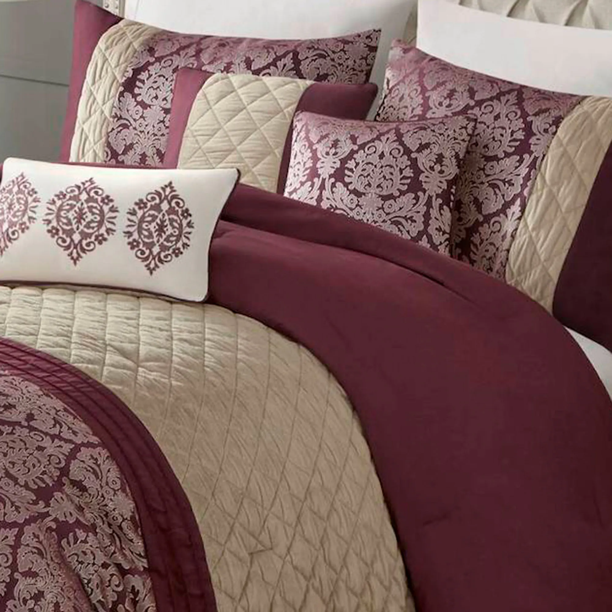 Decorate your sleeping space with the lavish Lily Plum Damask Bedding from Madison Park. The 6-piece Bed Set includes a comforter, 2 shams, and 3 accent pillows. The pieced, polyester comforter has a solid plum top, diamond quilting on khaki in the center, a pale mauve woven-jacquard design on plum at the bottom, and plum pintuck accents. Polyester microfiber backing is solid plum. Click on the Details tab to read about the other items in the bed set. Fill is polyester. Machine washable; spot clean the pillows. Imported.