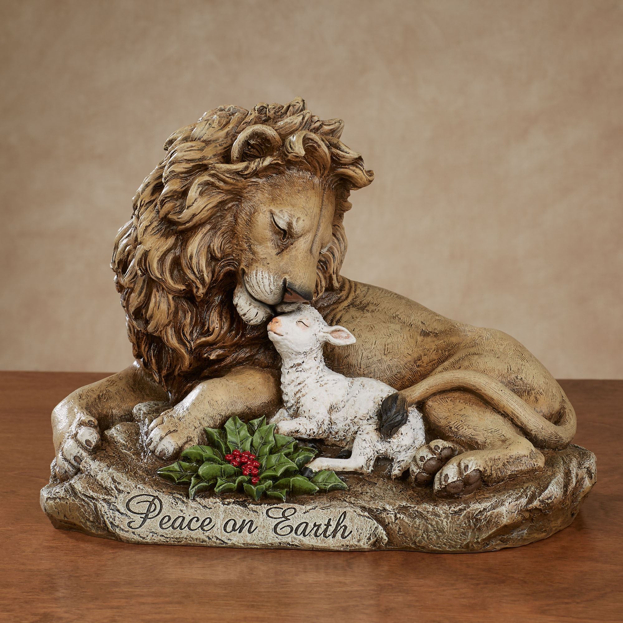 The Lion with Lamb Table Sculpture symbolically represents "Peace on Earth." This resin sculpture, by Joseph's Studio(R) exclusively by Roman, Inc., captures a tender moment. The lion and rock are in brown tones. Measures 11"Wx6.5"Dx8"H.