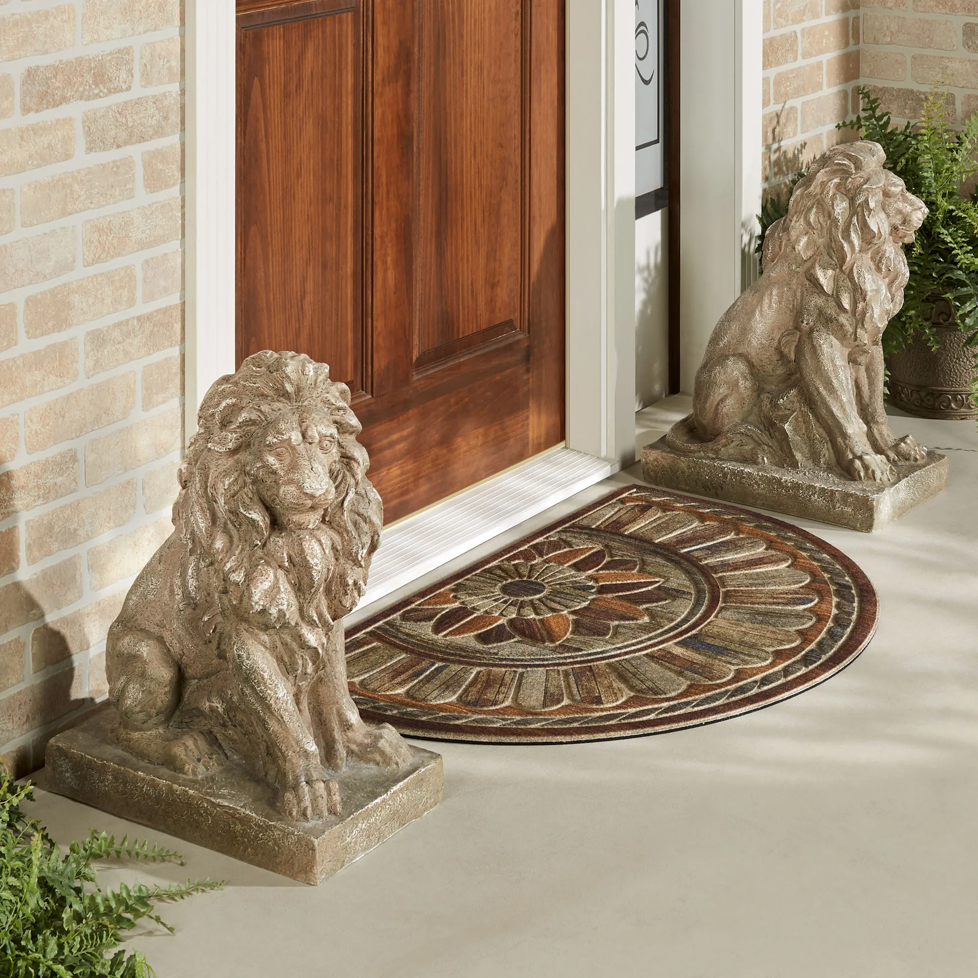 The Lions at Guard Sculpture Set will watch faithfully over your home. To your guests, their stately presence signals both a welcome and a sense of protection. The detailed, magnesium oxide and fiberglass lion sculptures are finished in weathered sand and sit on a rectangular base. Leonine manes, musculature, and faces appear remarkably realistic. For indoor or outdoor seasonal display; do not expose the sculptures to freezing temperatures. Each measures 9.5"Wx16.5"Dx22"H; set weighs 31 lbs.
