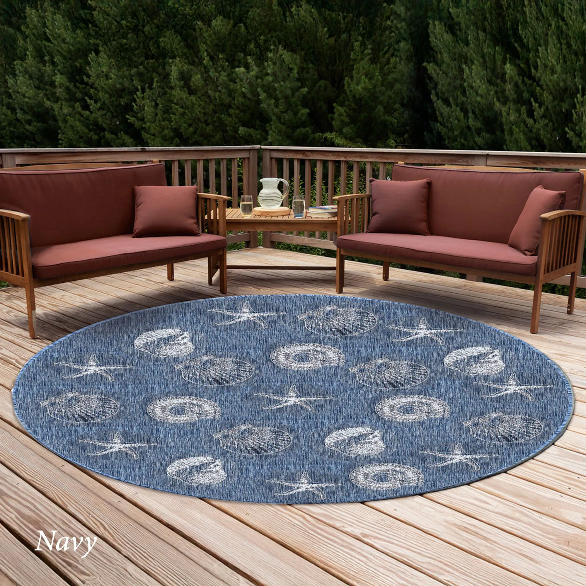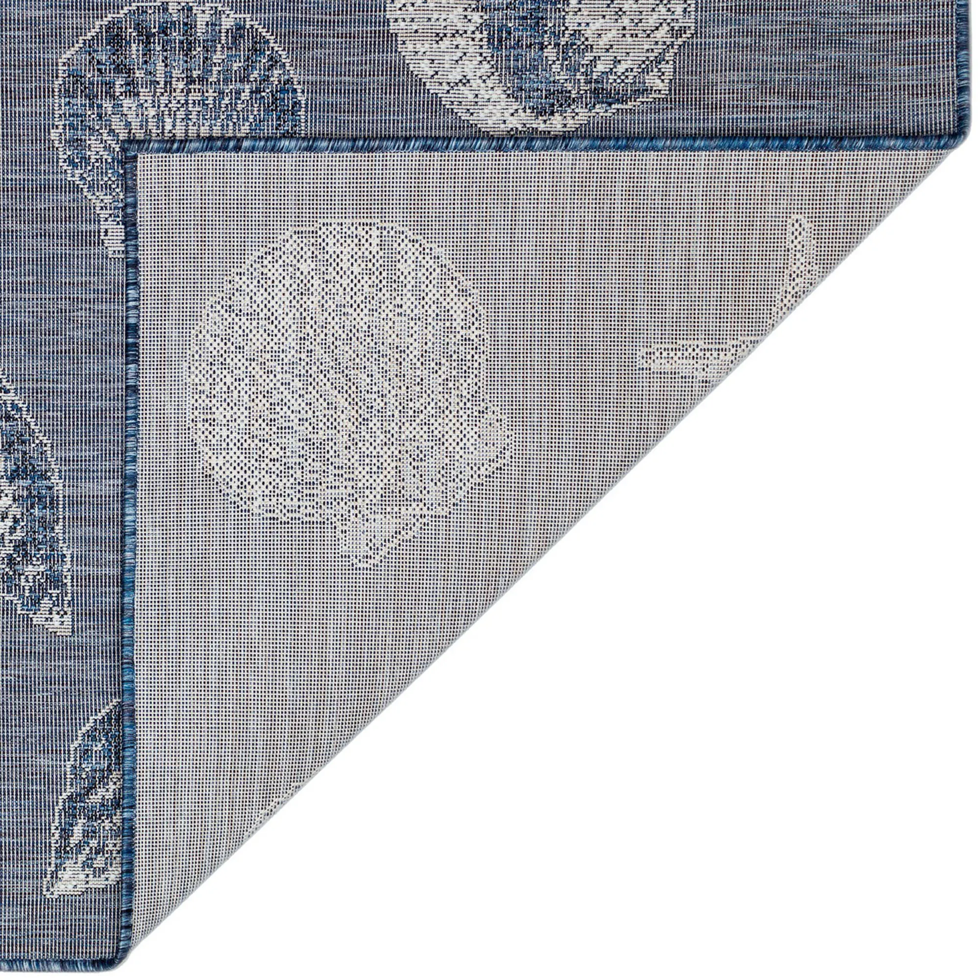 The Lioran Shell Coastal Rug dresses your indoor or outdoor space with shoreline treasures. Wilton-woven from polypropylene/polyester, the .25" thick, flat-weave rug features a UV-stabilized solid color and white striated ground covered with scattered conch, starfish, nautilus, and scallop shells. Outdoor seasonal use; do not expose this rug to freezing temperatures. Spot clean and rinse with a garden hose; for stubborn stains, we recommend professional cleaning by a rug cleaner. Imported.