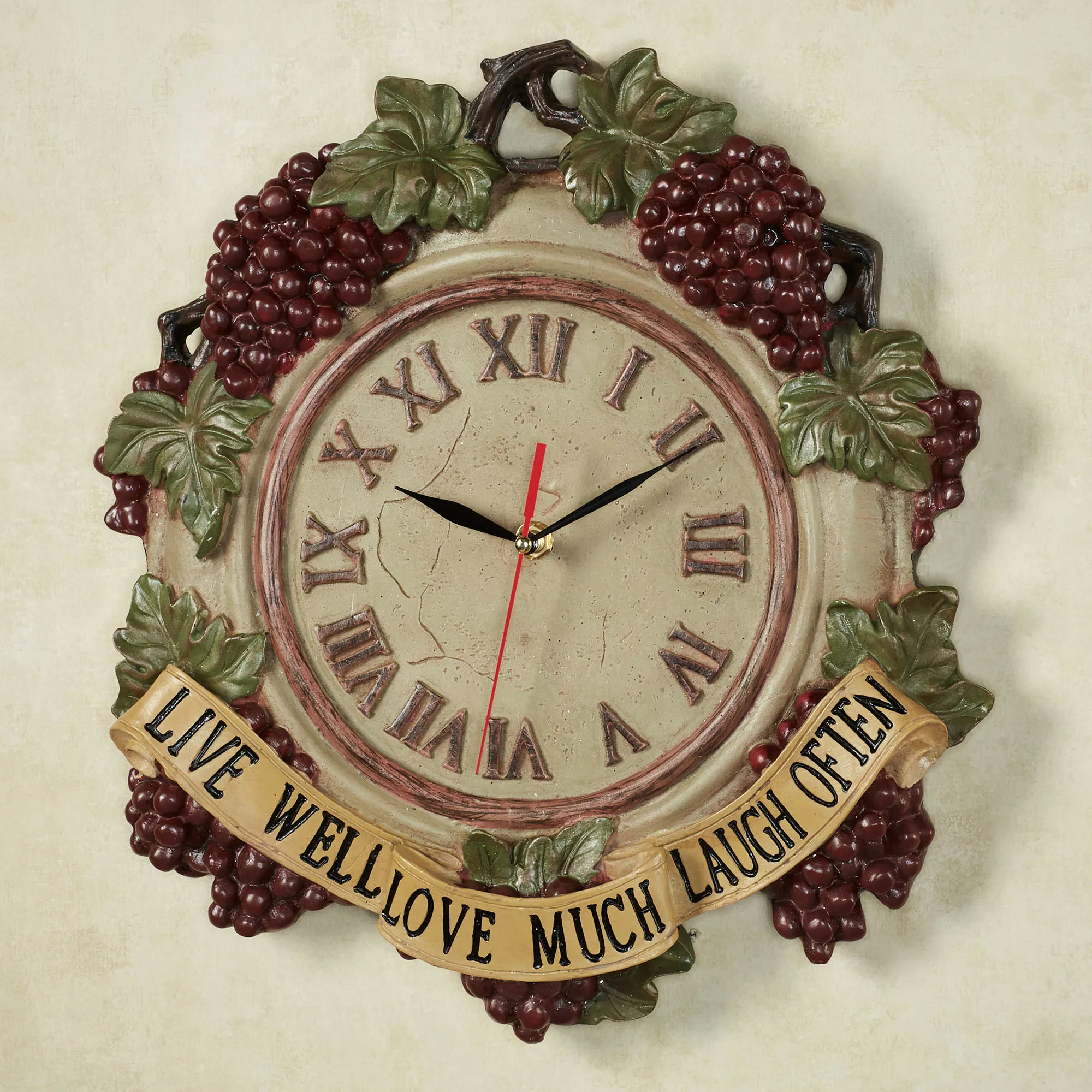 The Live, Love, Laugh Grapes Wall Clock will remind you of the important things in life. Who knew a simple timepiece could be so intriguing? Resin wall clock has a gently aged finish and clusters of port-colored, plump grapes. A scrolling banner, with a faded parchment hue, advises you to "Live Well, Love Much, Laugh Often." Wall clock has brown Roman numerals with copper highlights on a neutral background. Quartz movement uses your AA battery. Clock face is 7" dia. Overall size is 13"Wx2.5"Dx14"H.