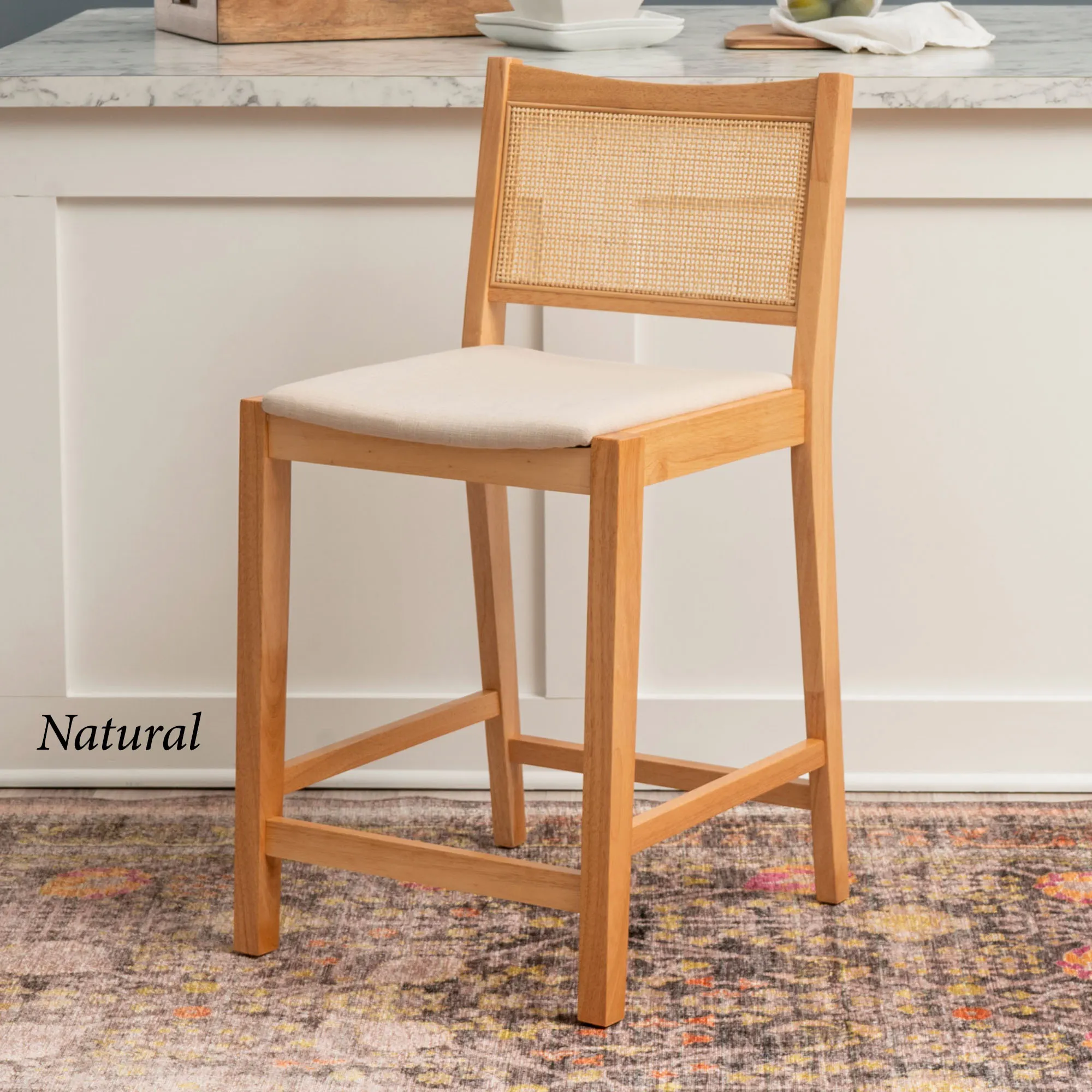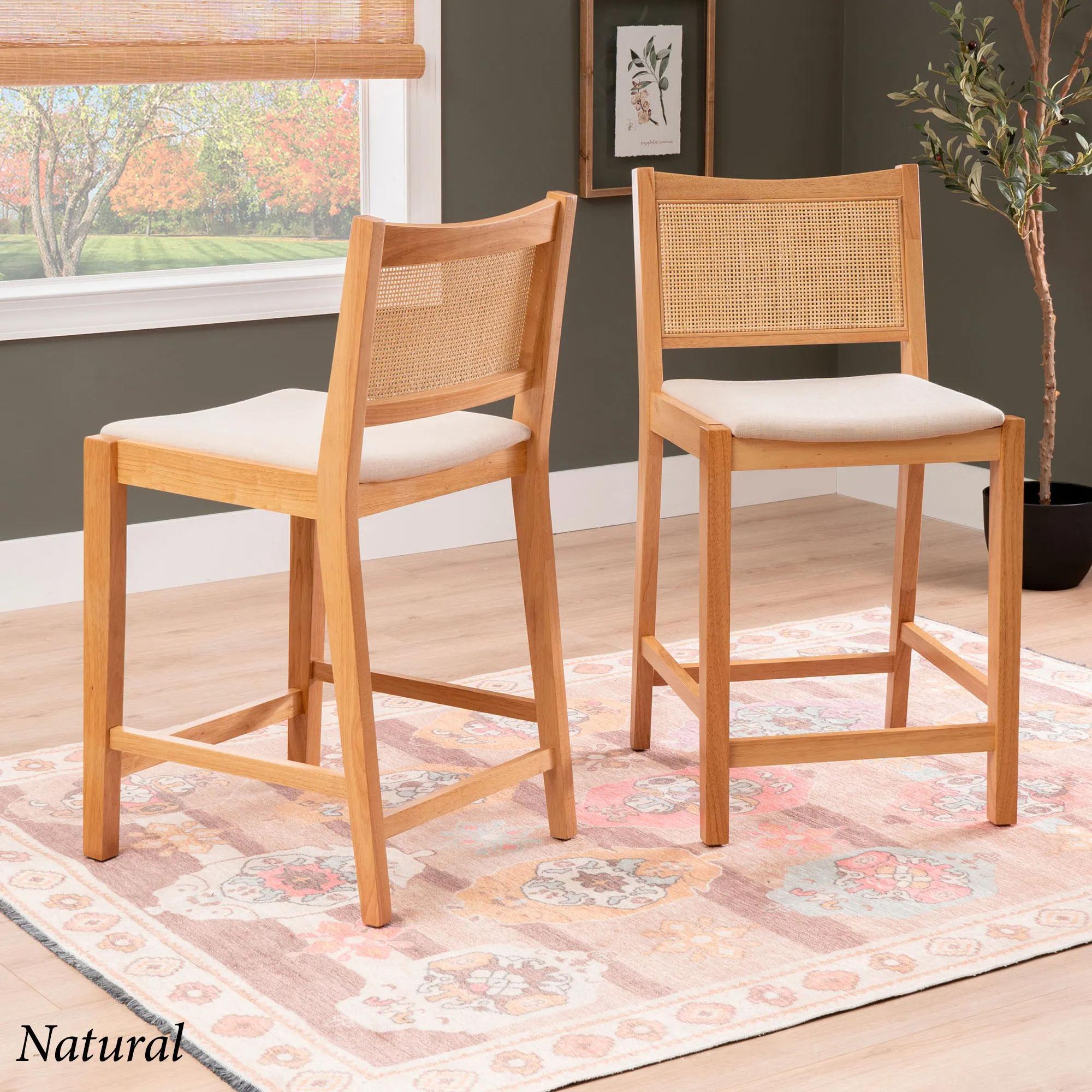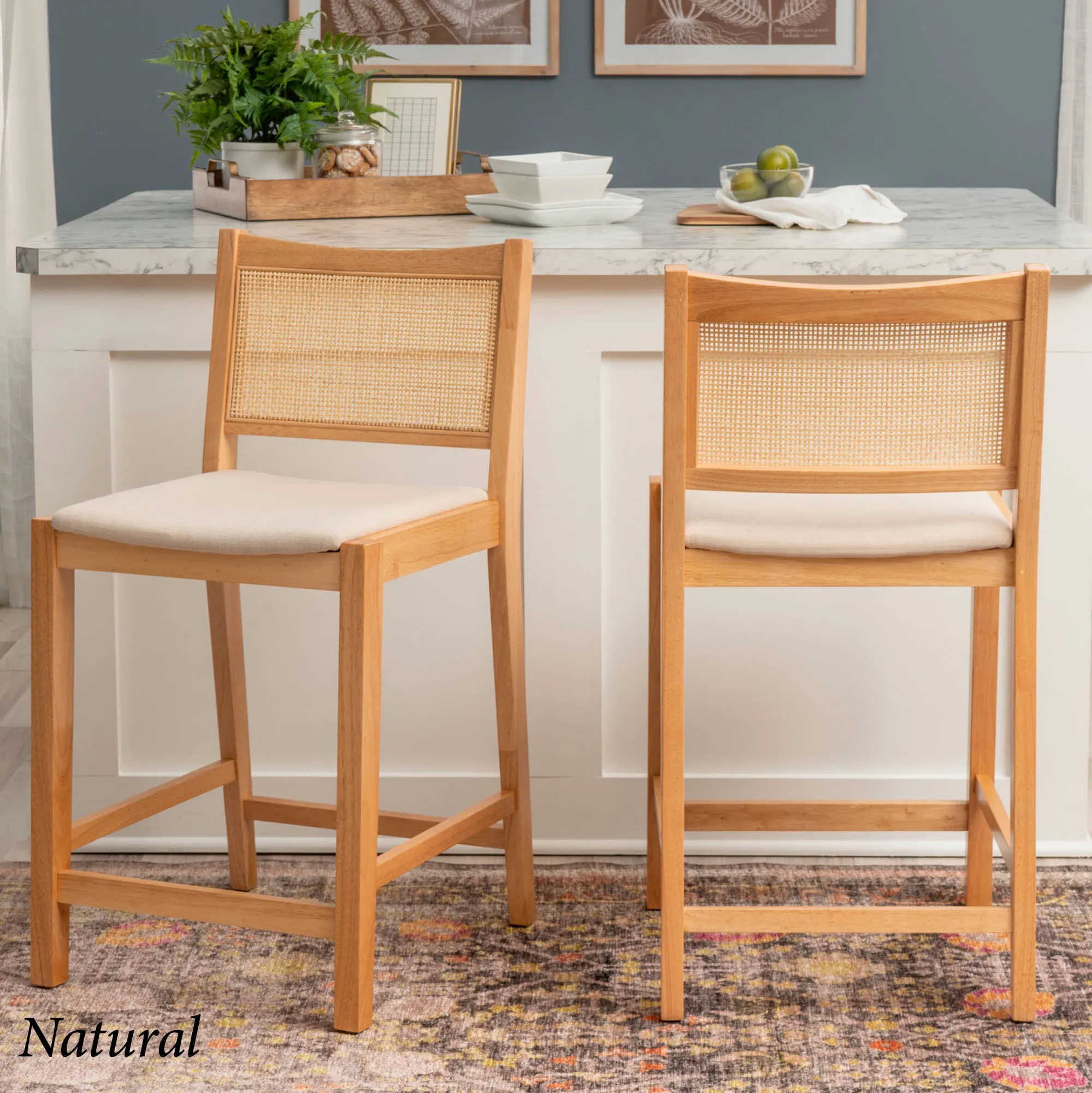 Add stylish extra seating with the Livianne Counter Stool Set. With sleek and simplistic lines, each wood stool features a wire-brush finish that showcases the natural woodgrain and complements the openwork woven cane seat back. Adding depth and texture to the design, the cane back also provides a natural airflow. Each foam-filled cushioned seat has a beige linen-look polyester upholstery for a neutral accent. Seat height is 25". Maximum recommended weight is 350 lbs. Perfect for a counter, island, or table measuring 35"H to 39"H, each counter-height chair measures 19"Wx22"Dx38"H overall. Set weighs approx. 31 lbs. Spot clean the cushions.