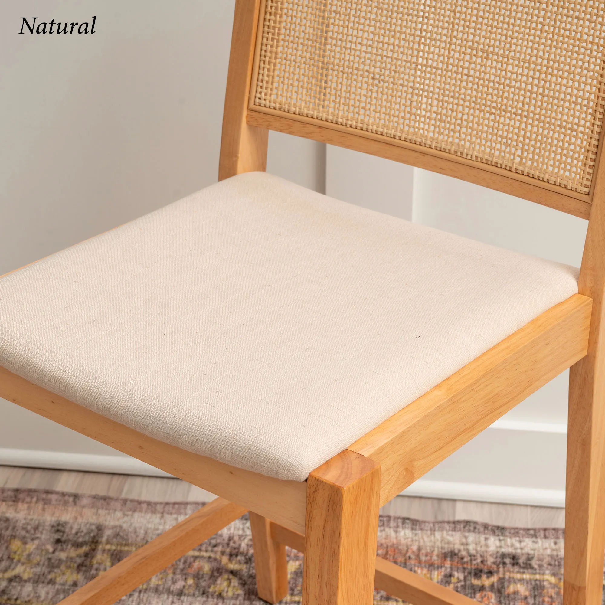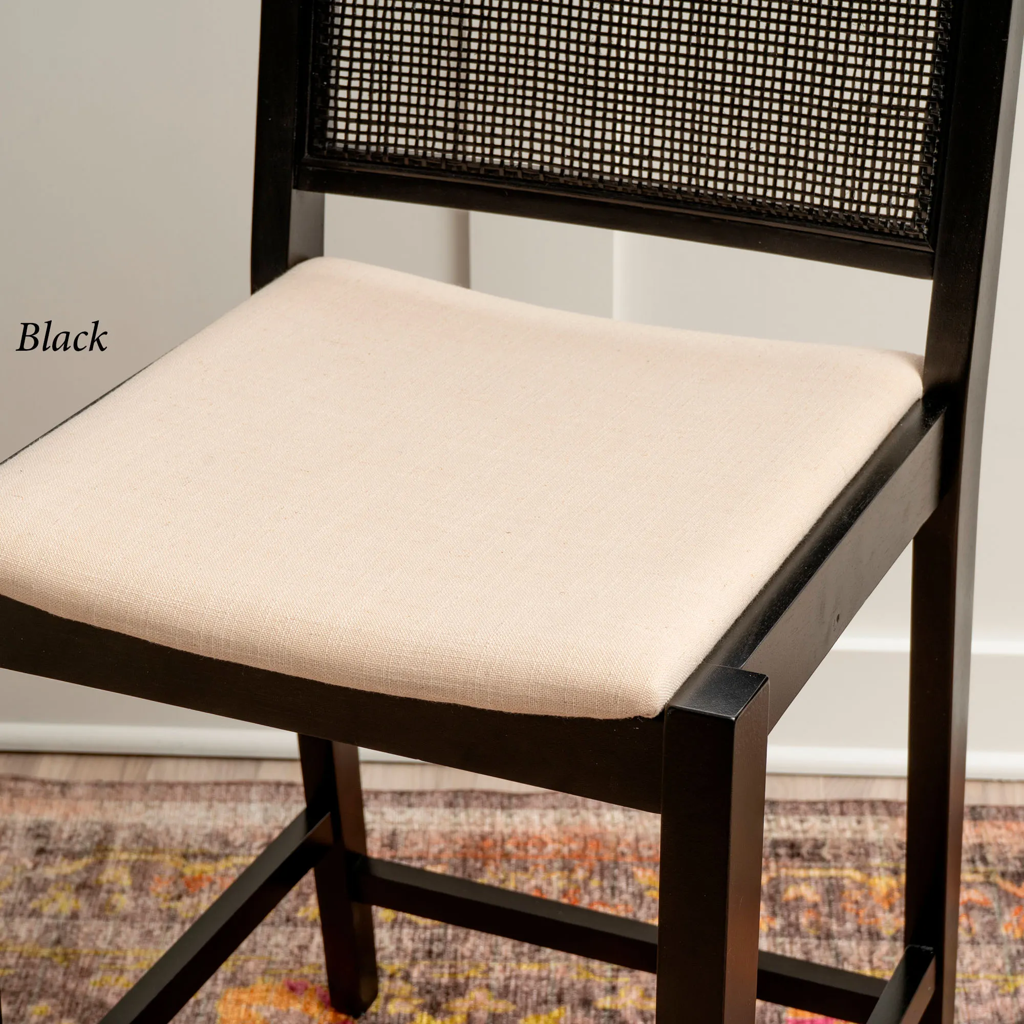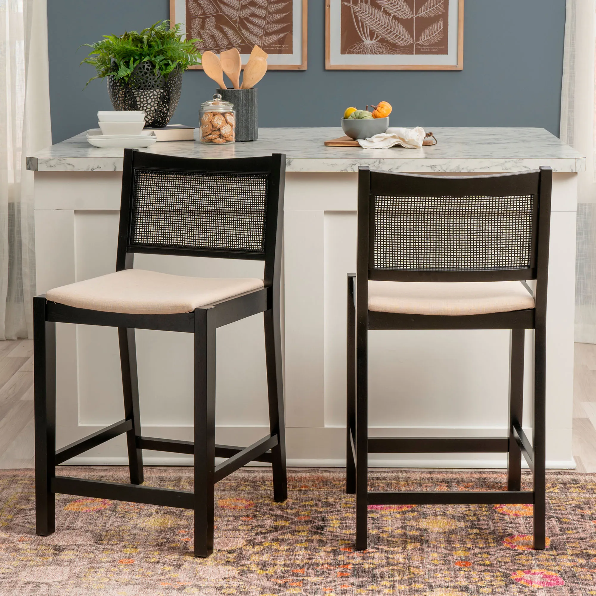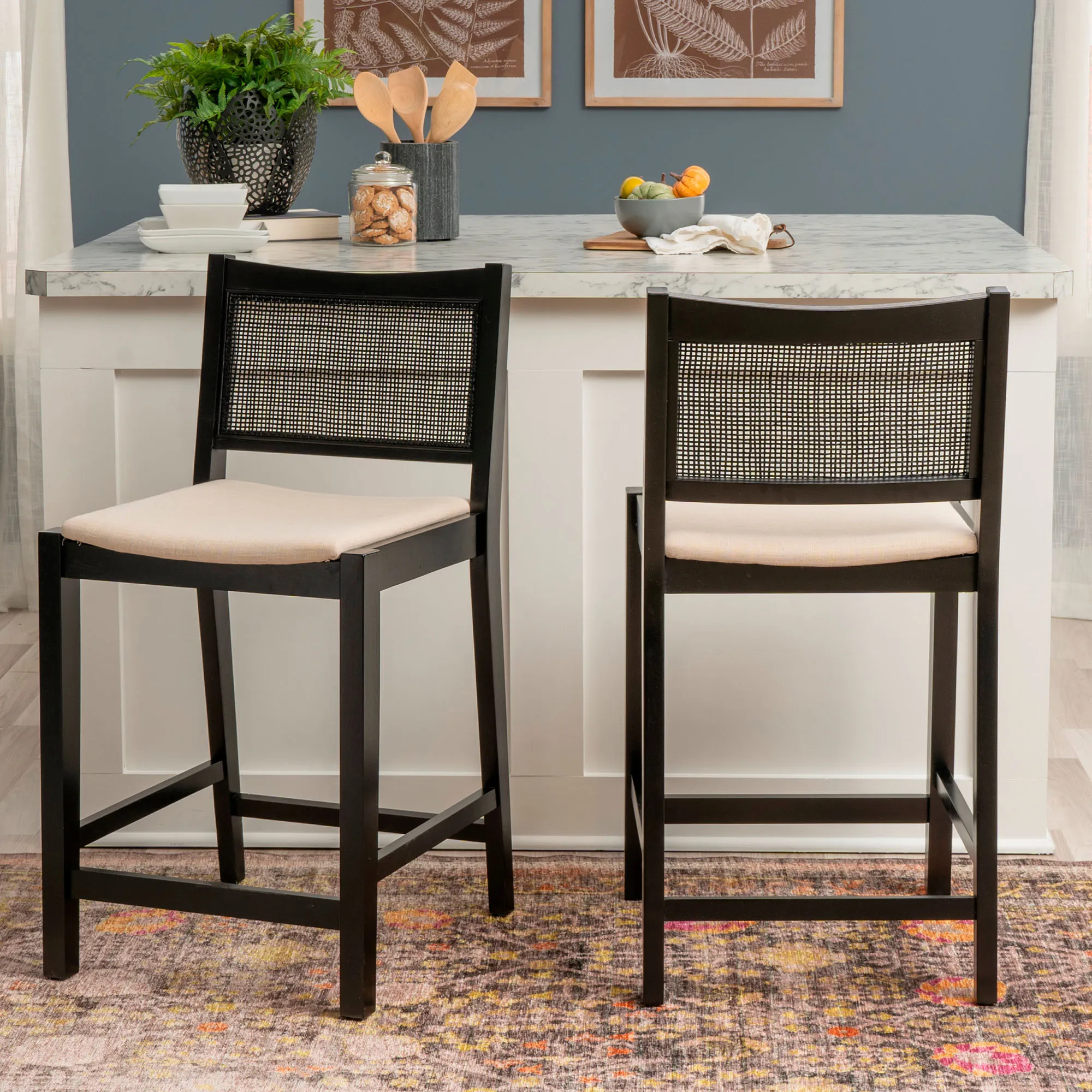 Add stylish extra seating with the Livianne Counter Stool Set. With sleek and simplistic lines, each wood stool features a wire-brush finish that showcases the natural woodgrain and complements the openwork woven cane seat back. Adding depth and texture to the design, the cane back also provides a natural airflow. Each foam-filled cushioned seat has a beige linen-look polyester upholstery for a neutral accent. Seat height is 25". Maximum recommended weight is 350 lbs. Perfect for a counter, island, or table measuring 35"H to 39"H, each counter-height chair measures 19"Wx22"Dx38"H overall. Set weighs approx. 31 lbs. Spot clean the cushions.