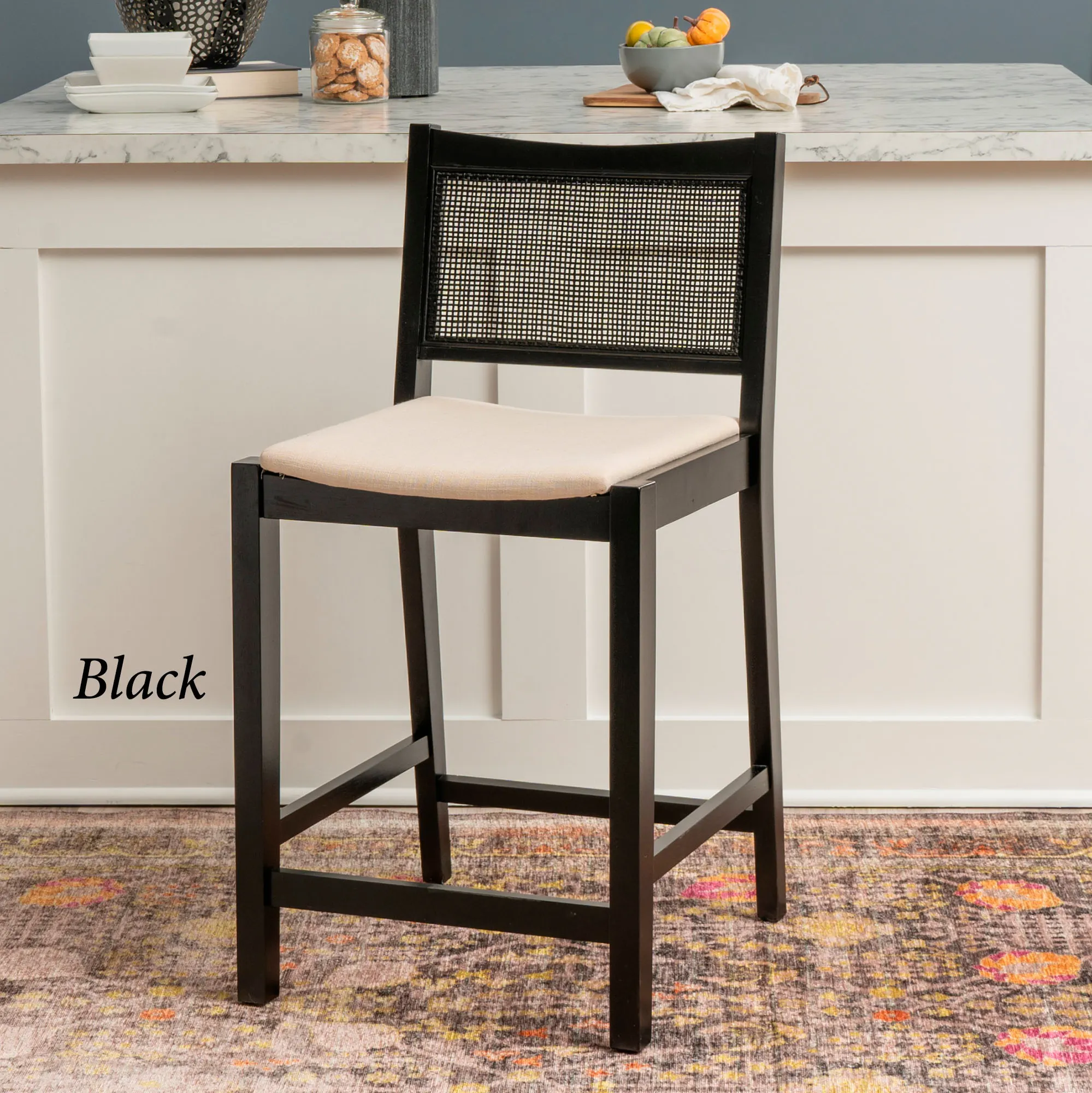 The Livianne Counter Stools are made from wood, cane, polyester, and foam.