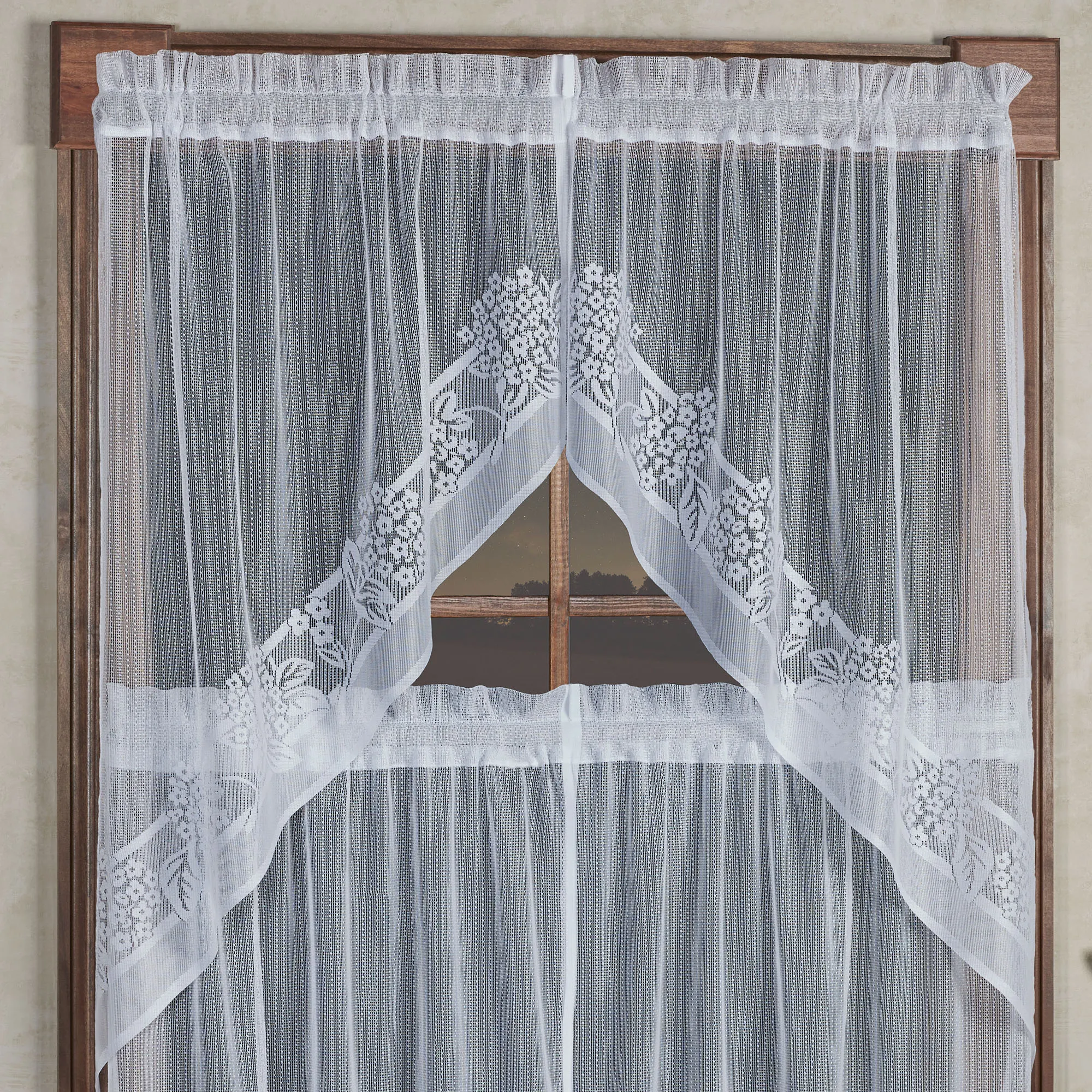 • Fine-gauge polyester lace window treatment