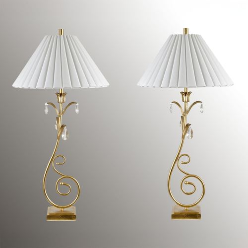 A scrolling design decorates the Loralei Table Lamp Pair. The metal table lamps have a swirling font, crystal accents, floral embellishments, and a stunning gold finish. The bottom bases are square. The pleated fabric shades are white. UL listed. Each lamp requires one 100W max. 3-way bulb, not included, and measures 20"dia.x38"H. Pair weighs approx. 11 lbs.