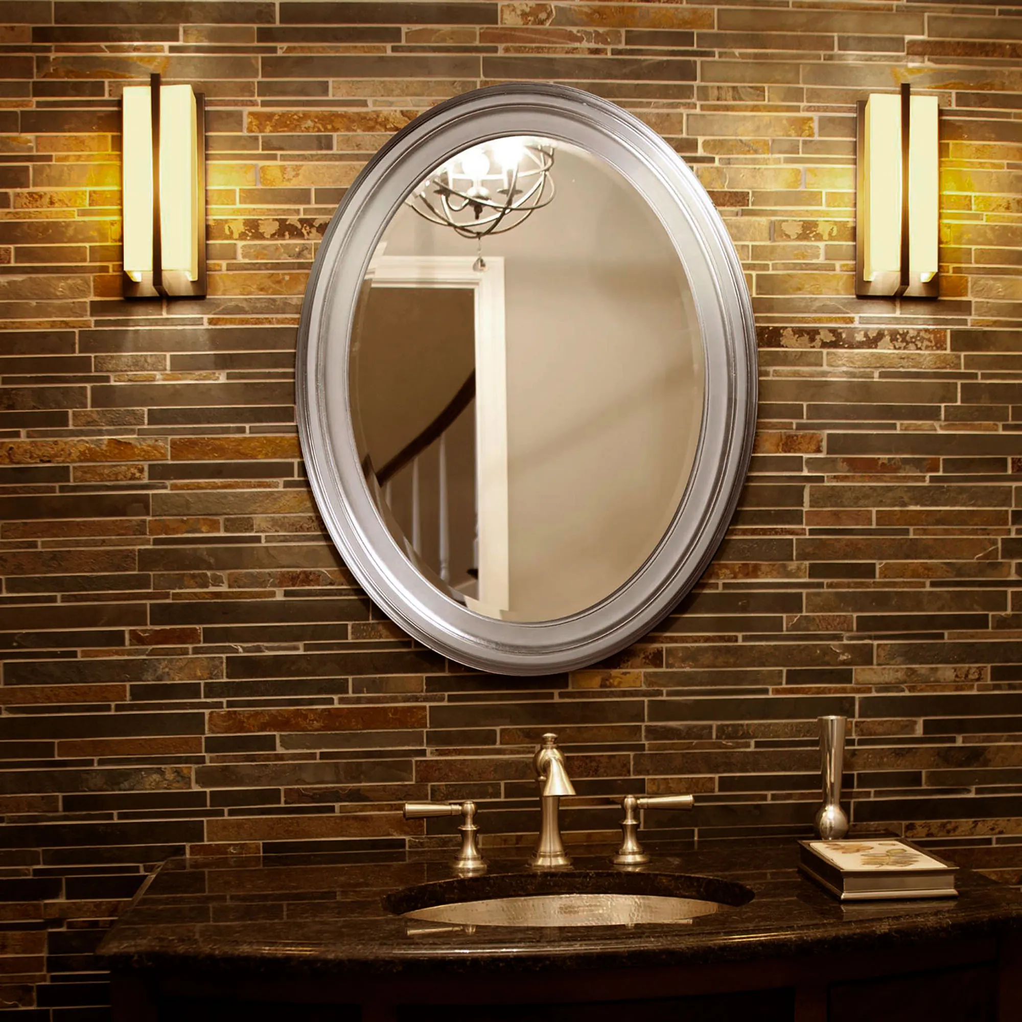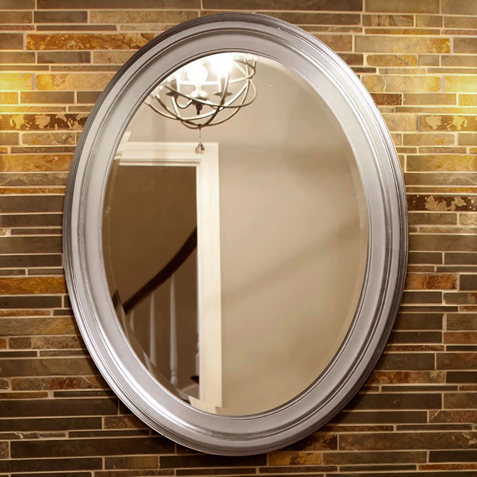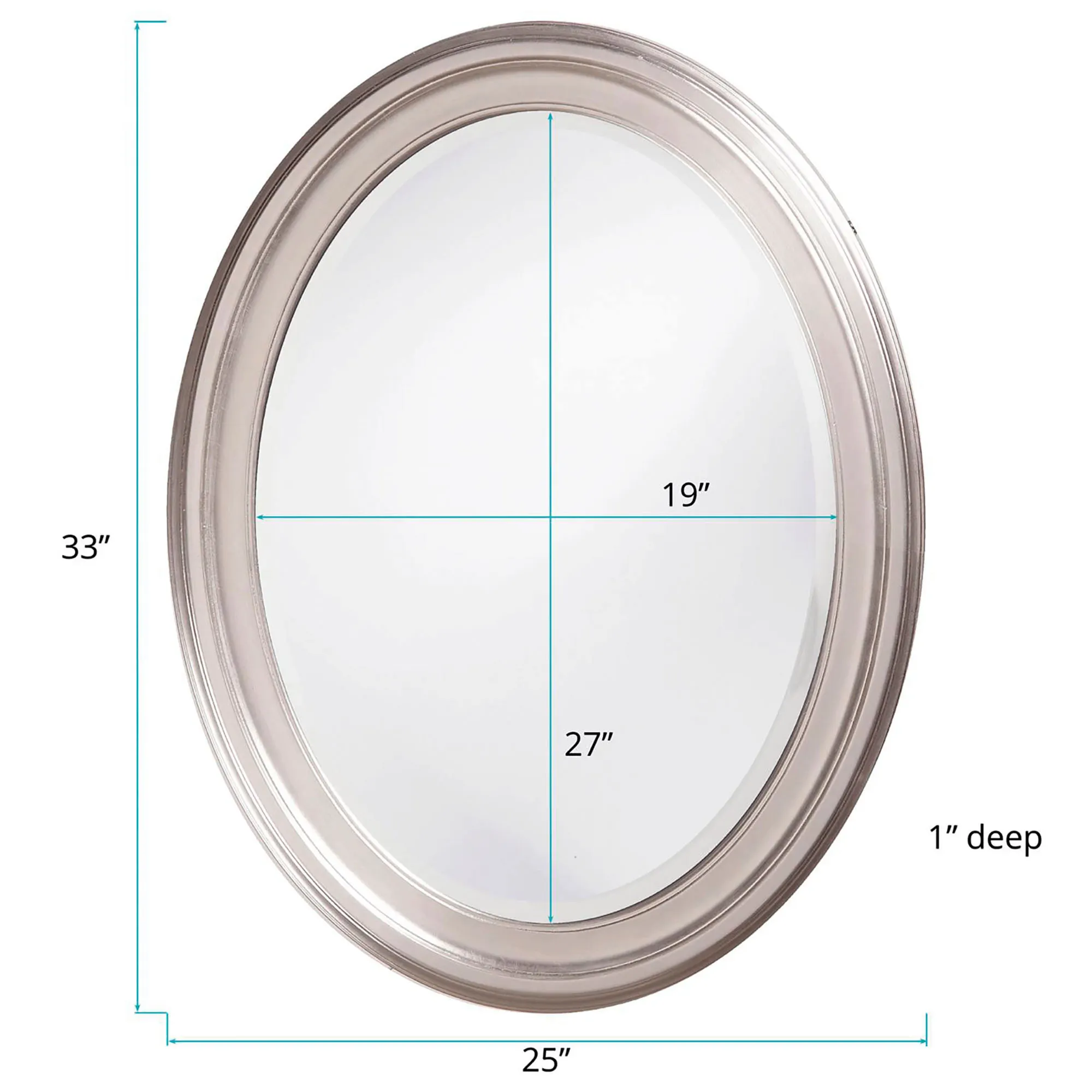 The Loree Brushed Nickel Finish Oval Wall Mirror would be perfect for your bath or bedroom. Made of solid wood and beveled glass, the simple lines of this handcrafted wall mirror make it a suitable fit anywhere in your home. Overall, 25"x33".