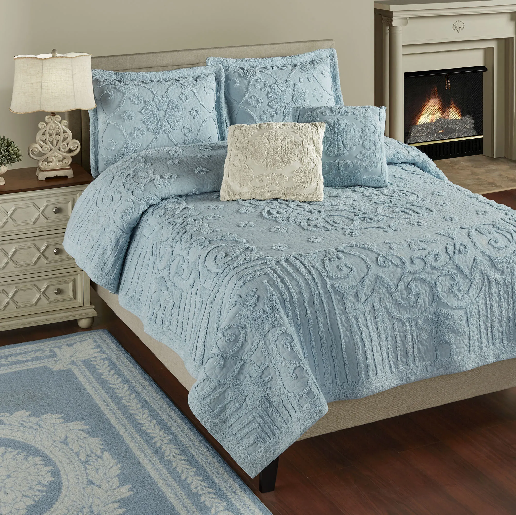 Charm your bedroom decor with the lovely Lorenza Blue Chenille Bedding. The Quilt Set includes an oversized quilt and shams. Crafted from soft pure cotton, the solid blue bedding features tufted chenille scrollwork, florals, and straight lines. Vermicelli quilting and solid chenille tufted tailored edges complete the look. Machine wash separately. Imported.